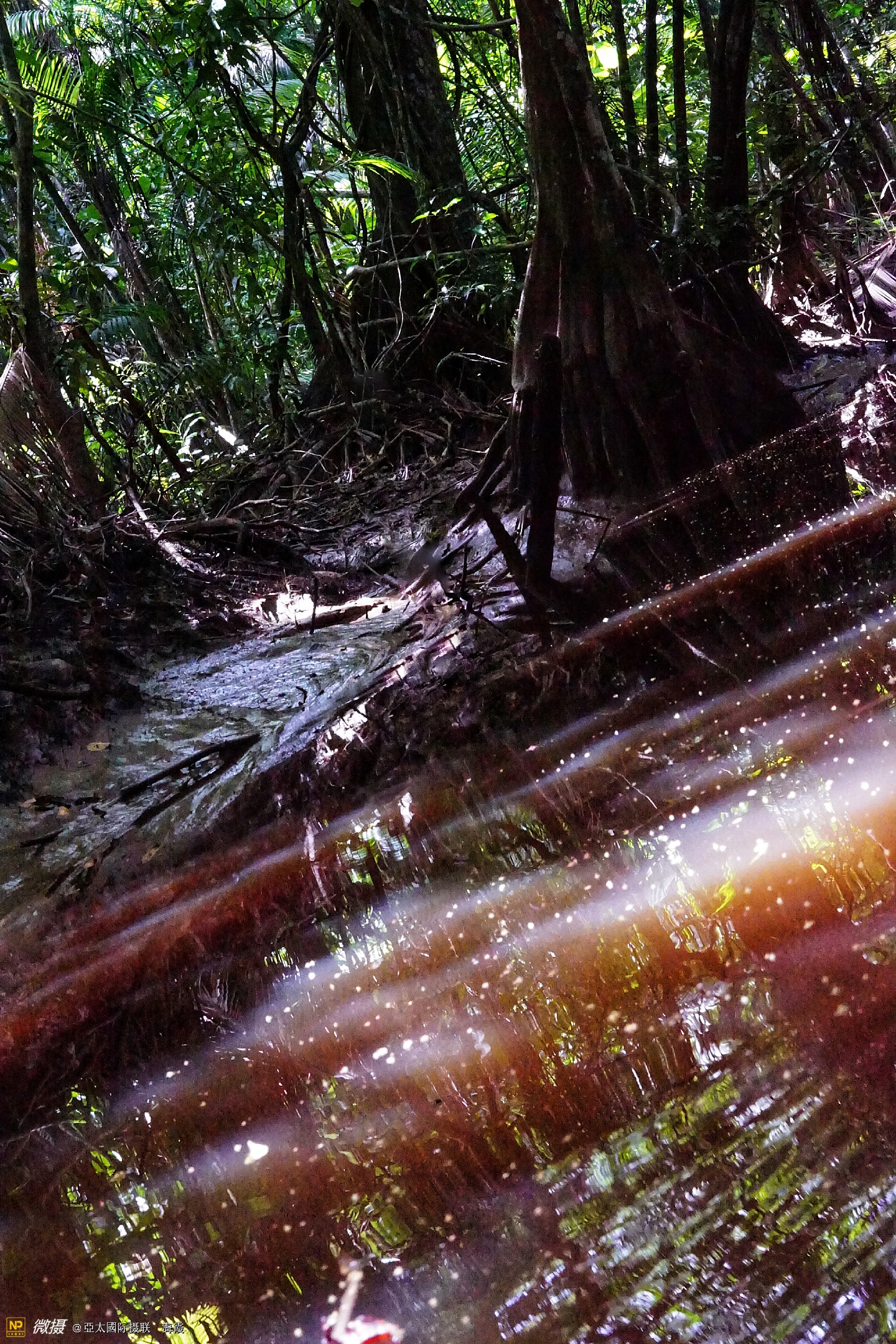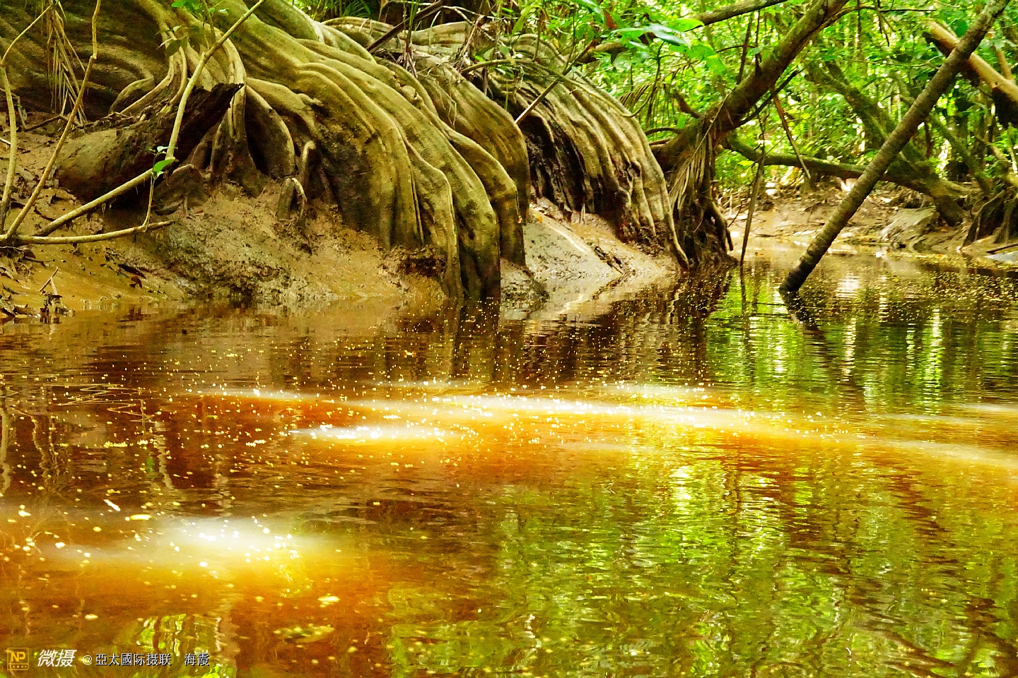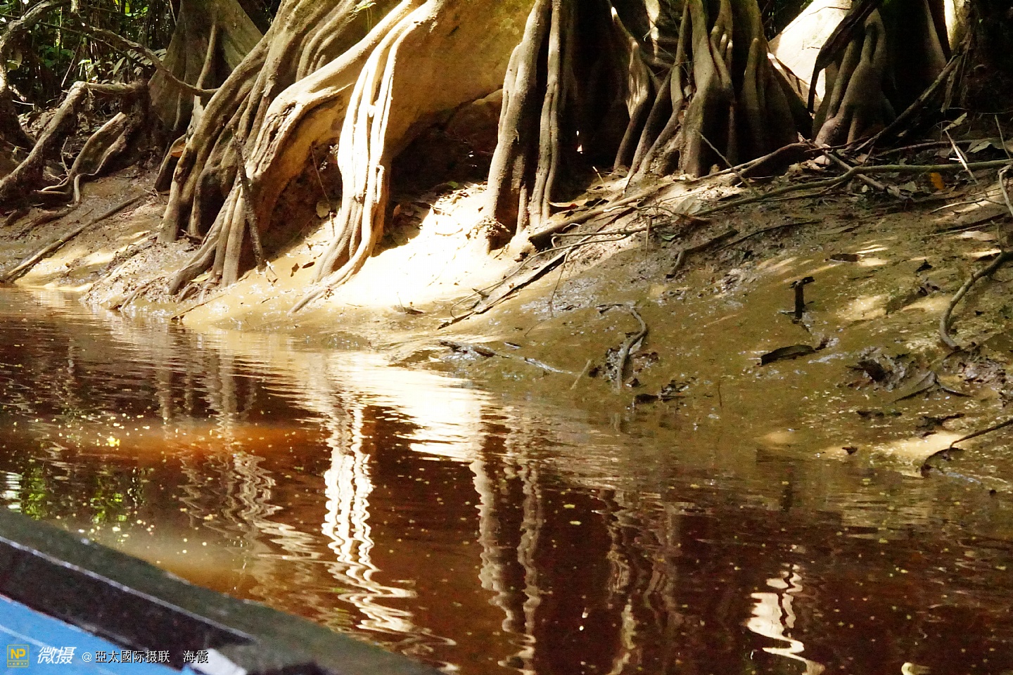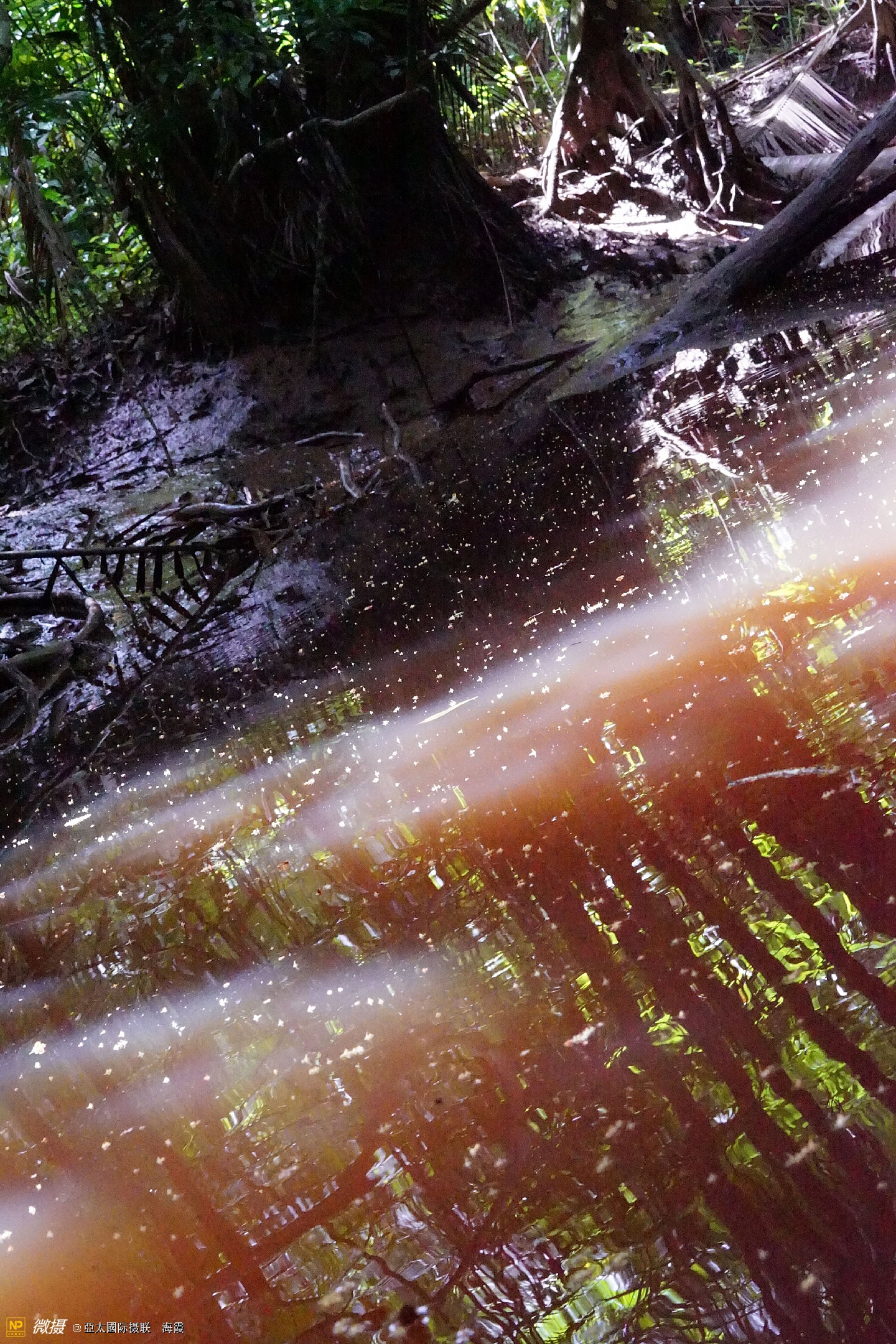 首先導游架小木船带我们游覽,在穿越河流的船游途中,我們看到了猴子、野鳥及大魚,中间穿过狭窄的小树林,里面美极了,第一次看到了可乐河,水的颜色和可乐相似,所以叫可乐河。