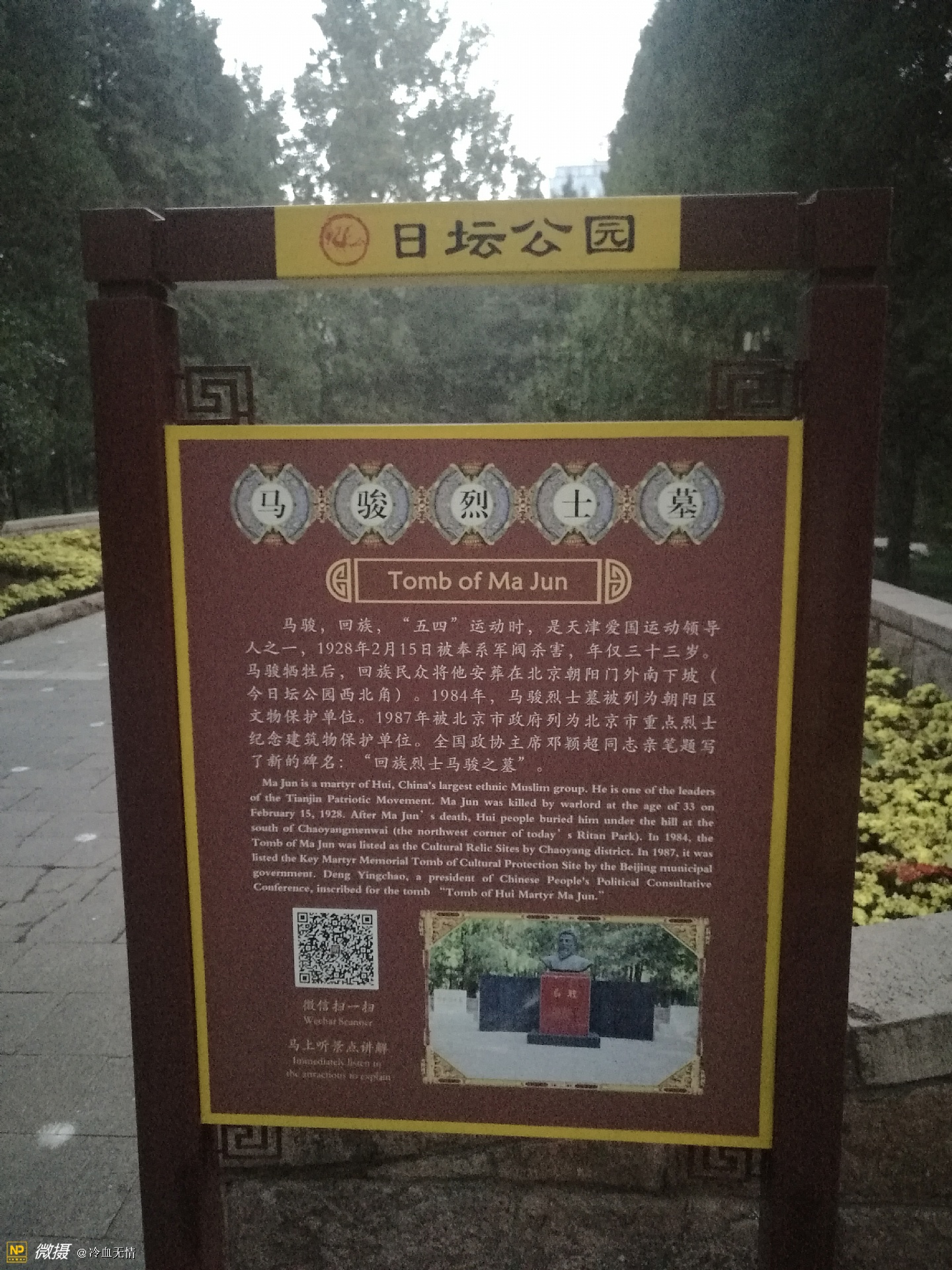 在建国门外日坛公园的西北角,安葬着回族烈士马骏,在周围热闹的环境当中,烈士的常年之地显得分外安静,马骏已经牺牲80多年了,大概因为时间的久远,除了家里人,很多人对马骏的故事并不熟悉。