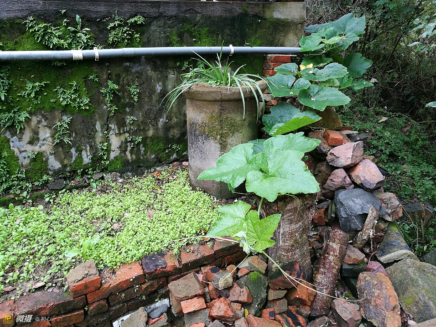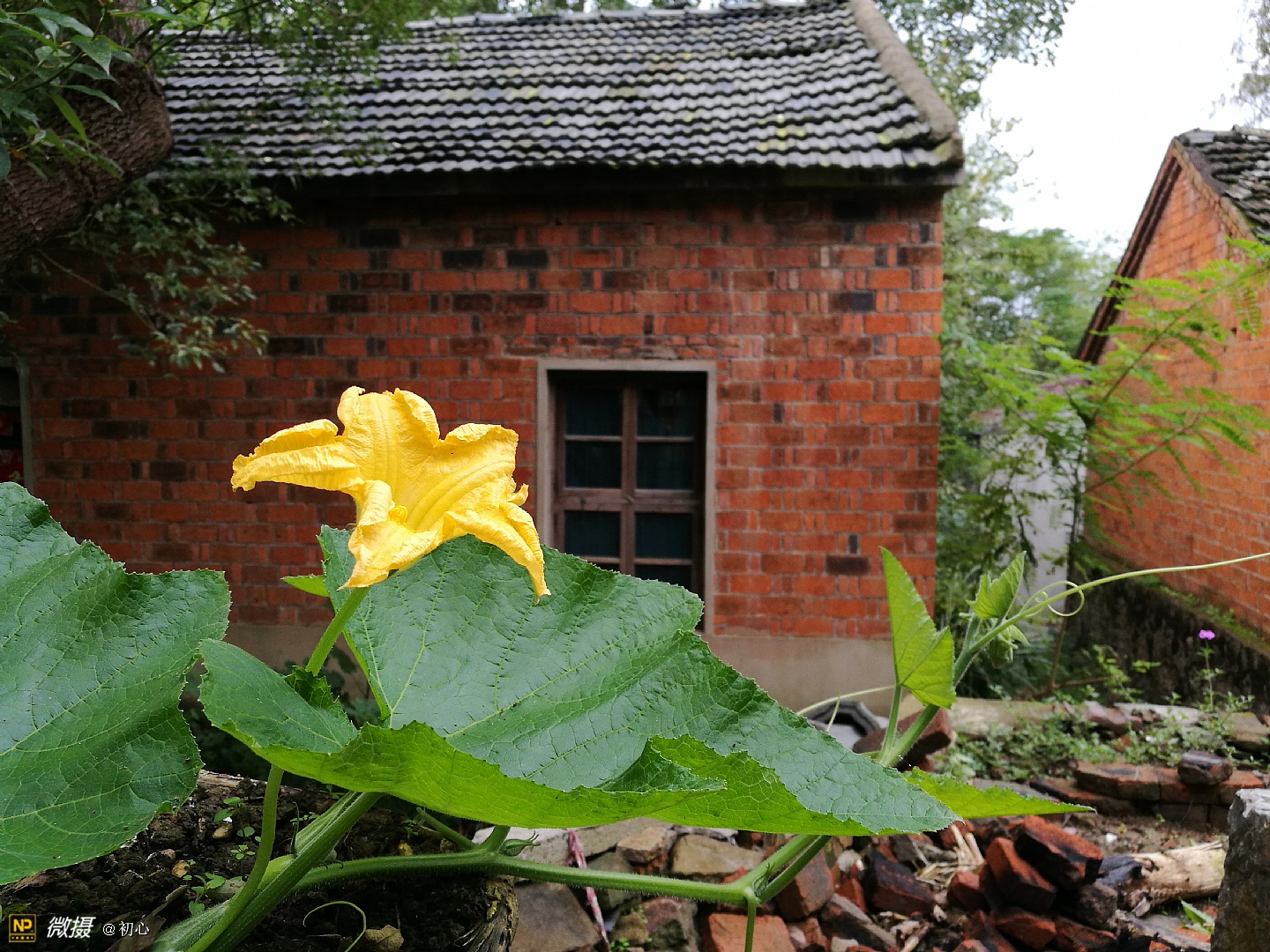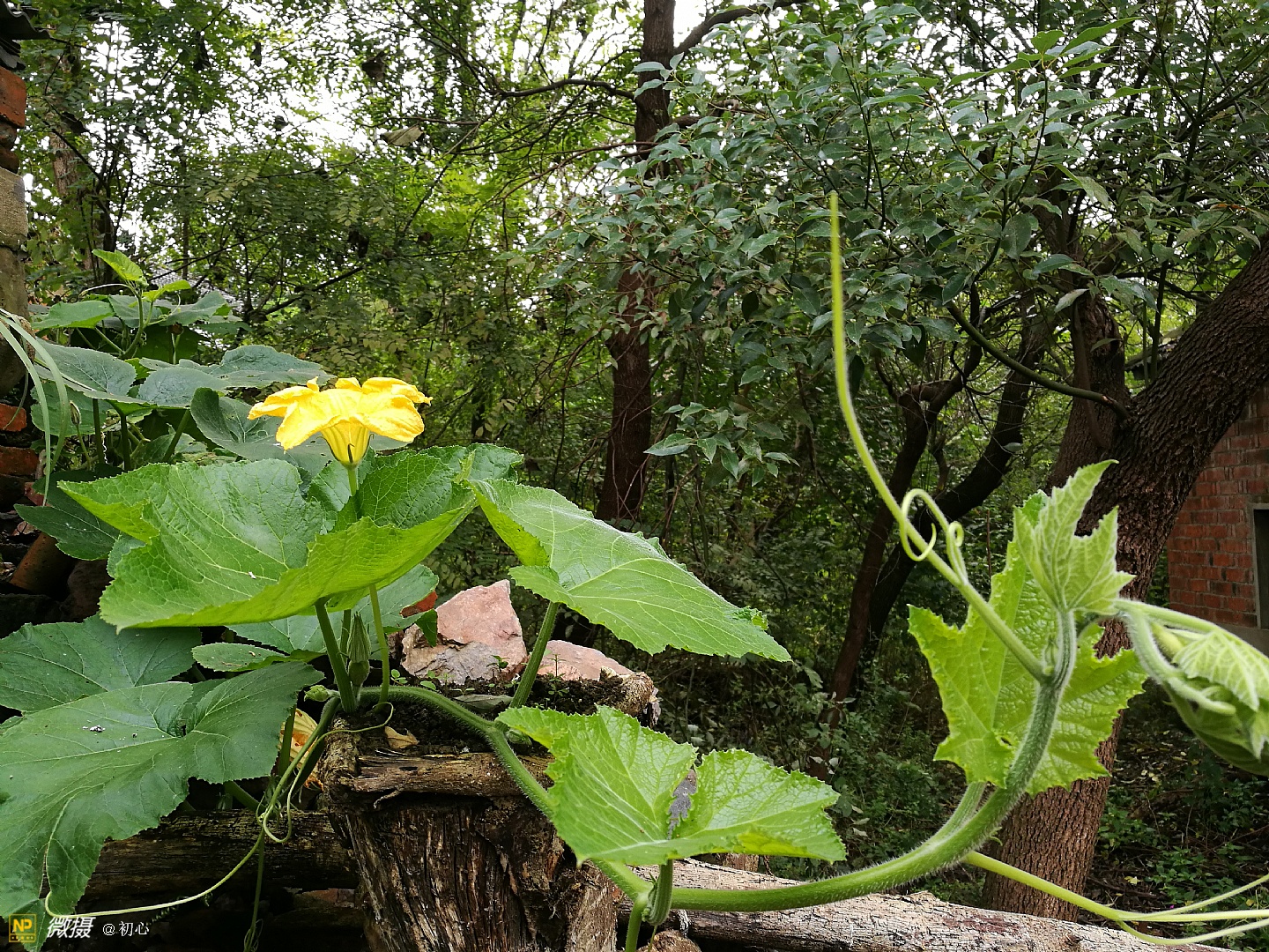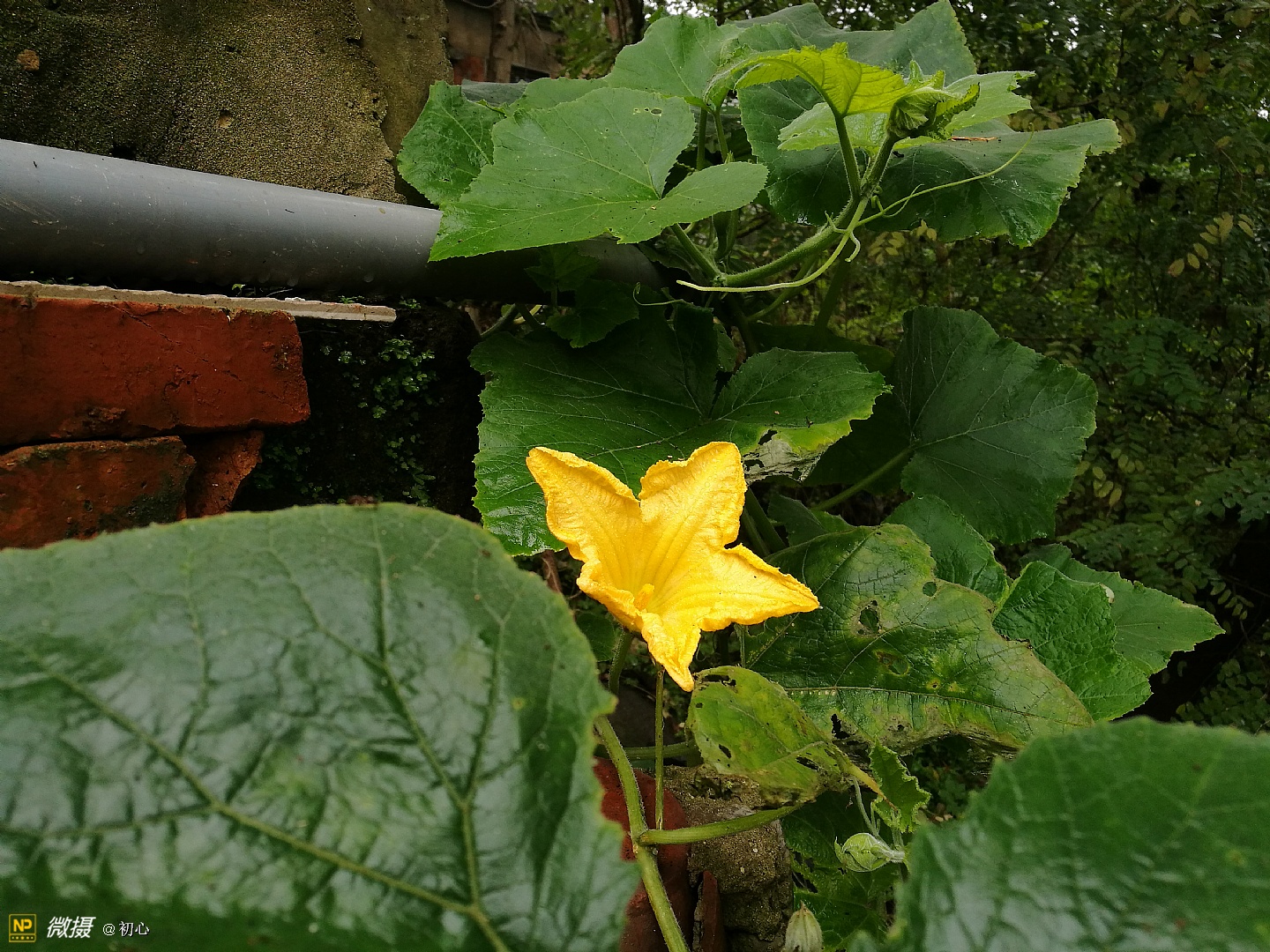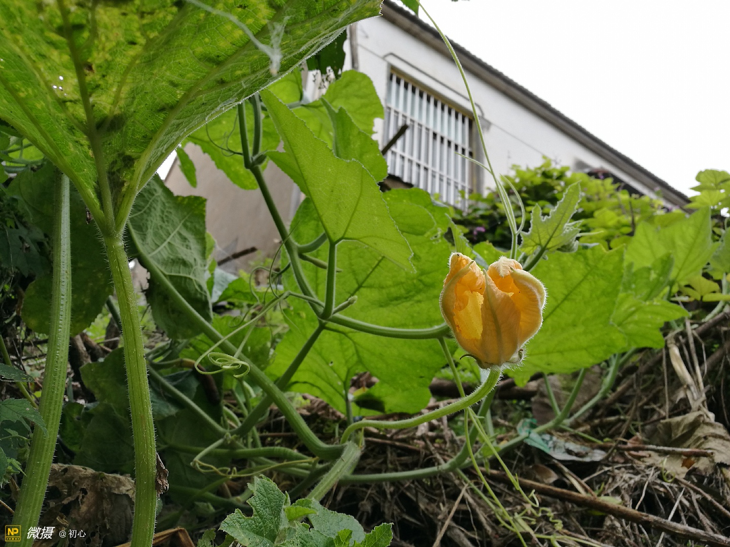 后院的墙角有棵翻墙过来的南瓜藤。