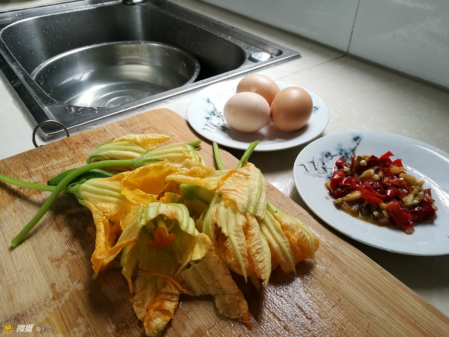 洗净了的南瓜花 鸡蛋 腌好的红辣椒