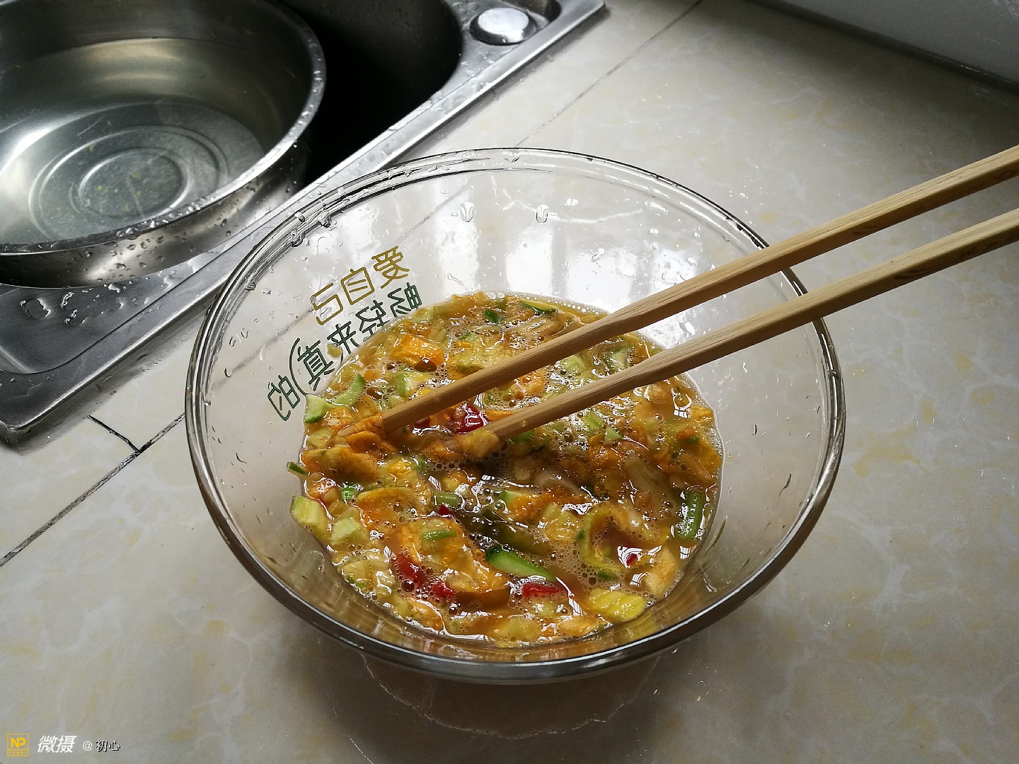 切碎南瓜花,三样放一起加适量盐搅拌均匀。