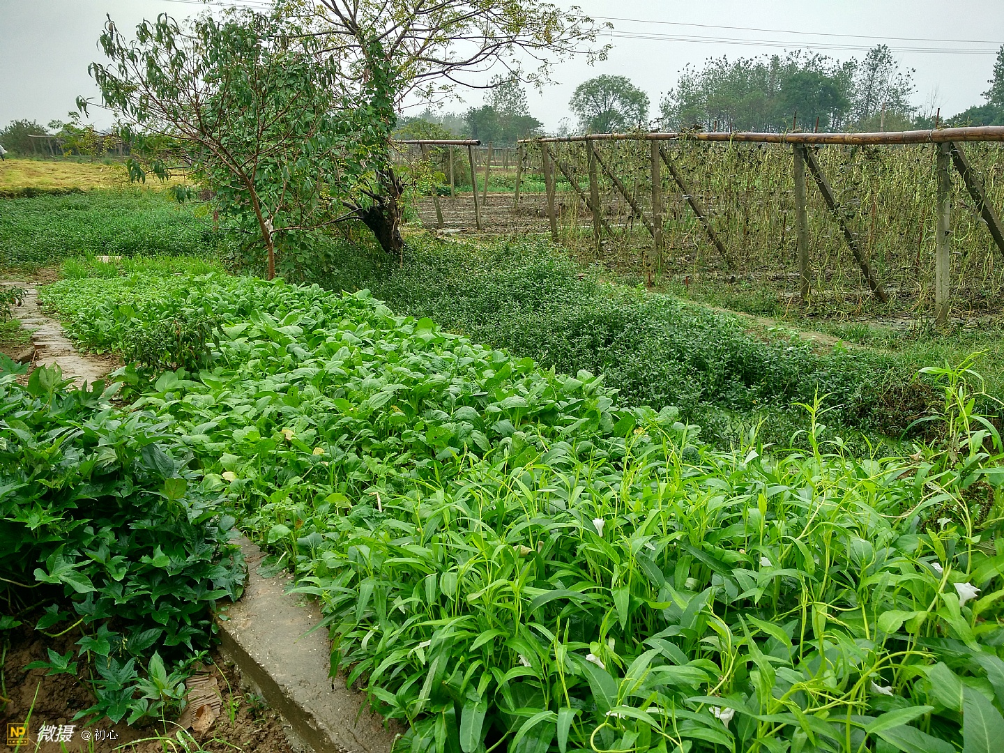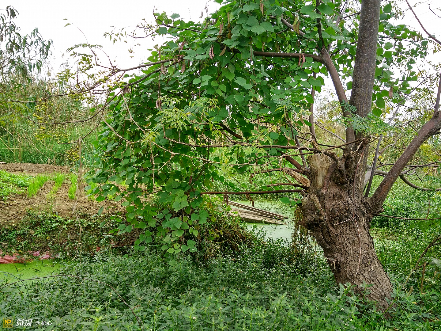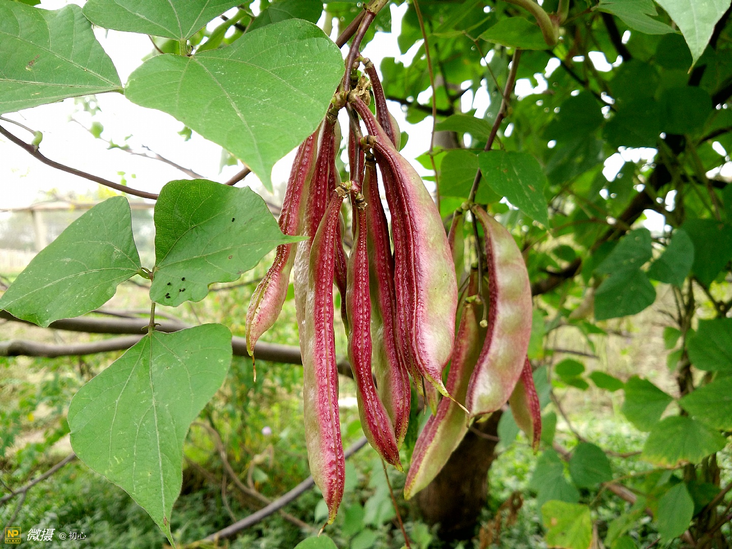 菜地边角种的一颗扁豆,扁豆藤攀上了树,上面挂了好多扁豆够不着。