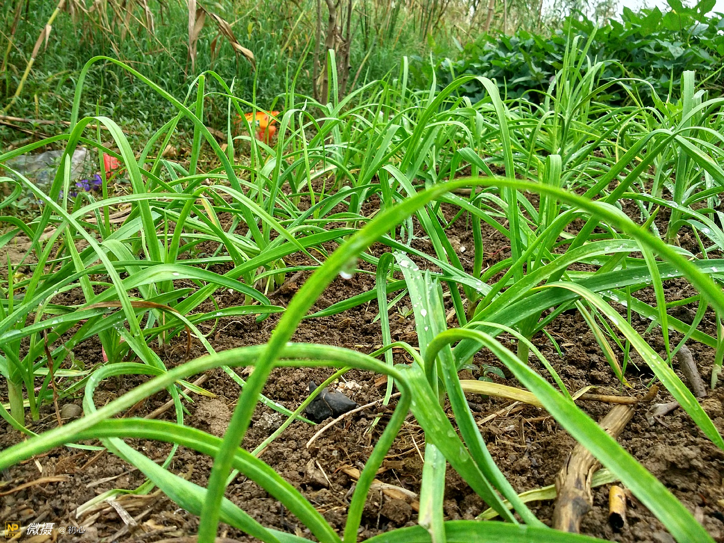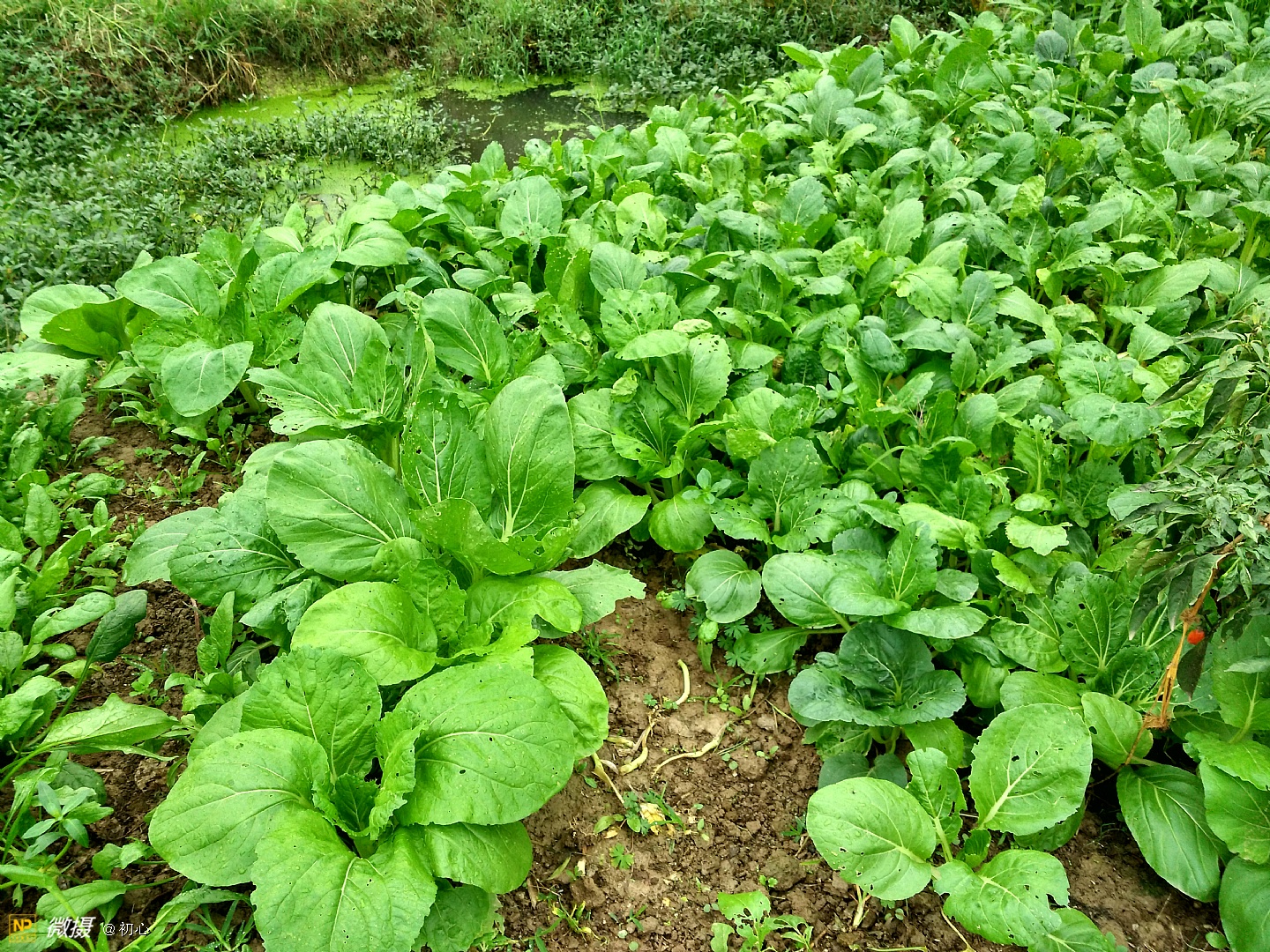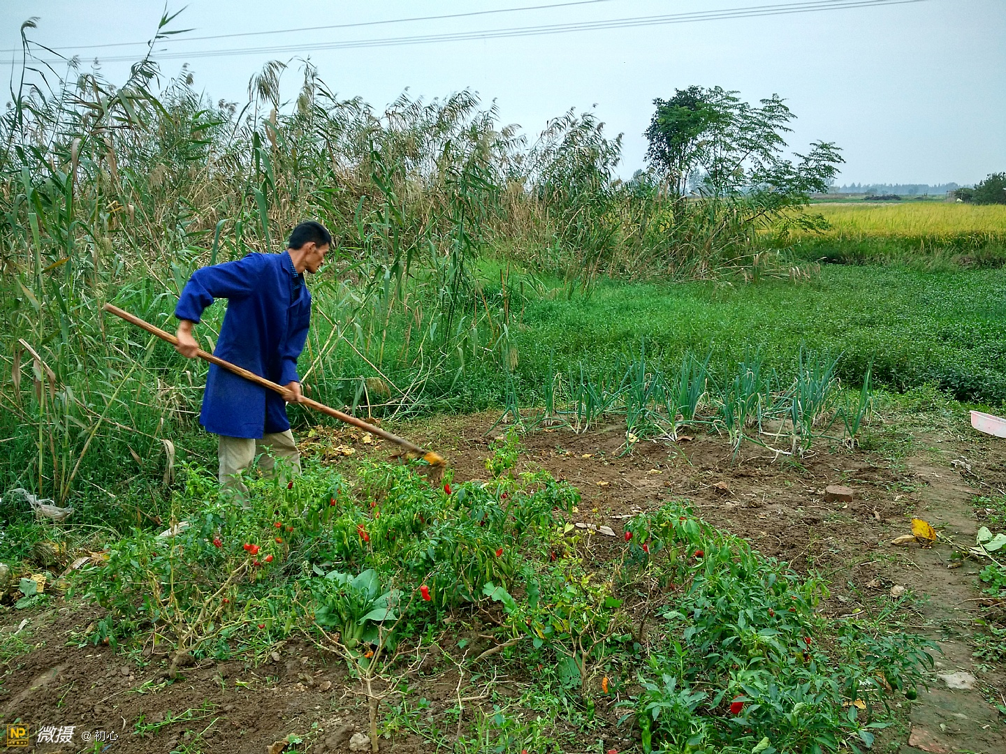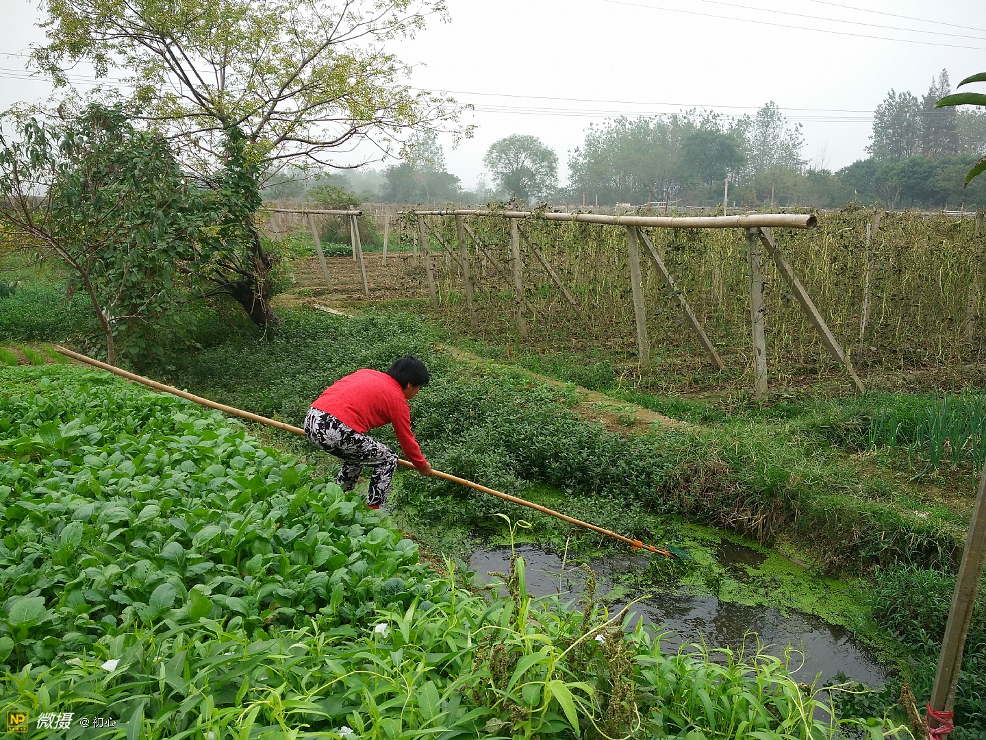 菜地边有一条水沟,里面长了很多浮萍,邻居在捞浮萍回去喂鸭子。