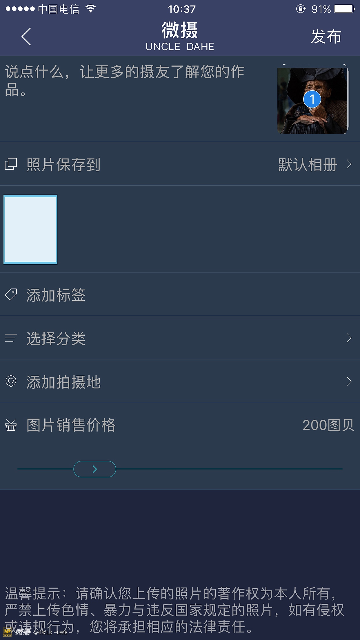 每天除了查看自己的资产收了,更重要的还要上传图片。这是微摄App的手机版上传系统。