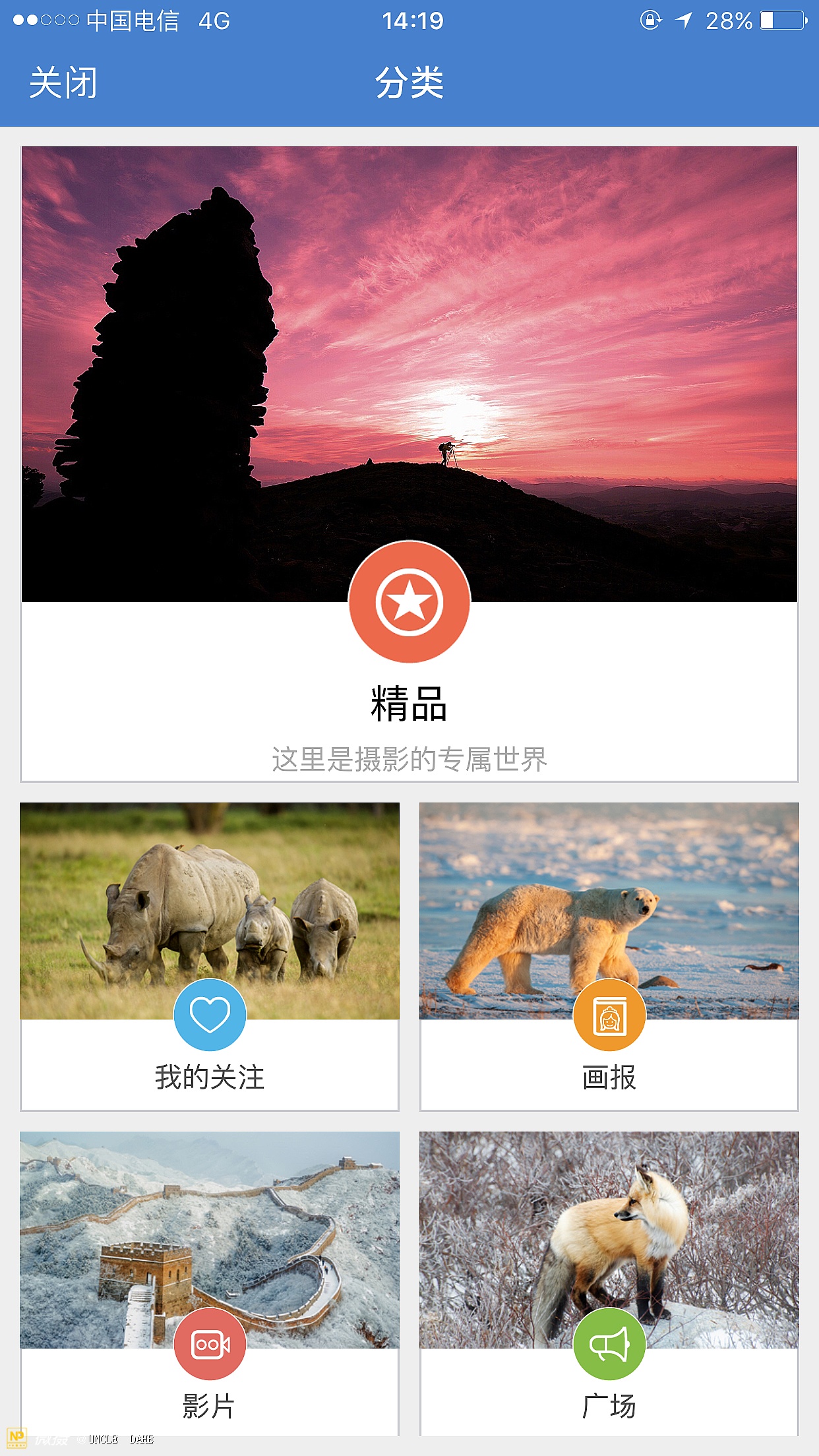 由于每天图片量大的惊人,为了方便用户浏览,微摄将每一张图片在作者上传同时就做了分类,20多个品种的分类让大家浏览即方便又快捷。