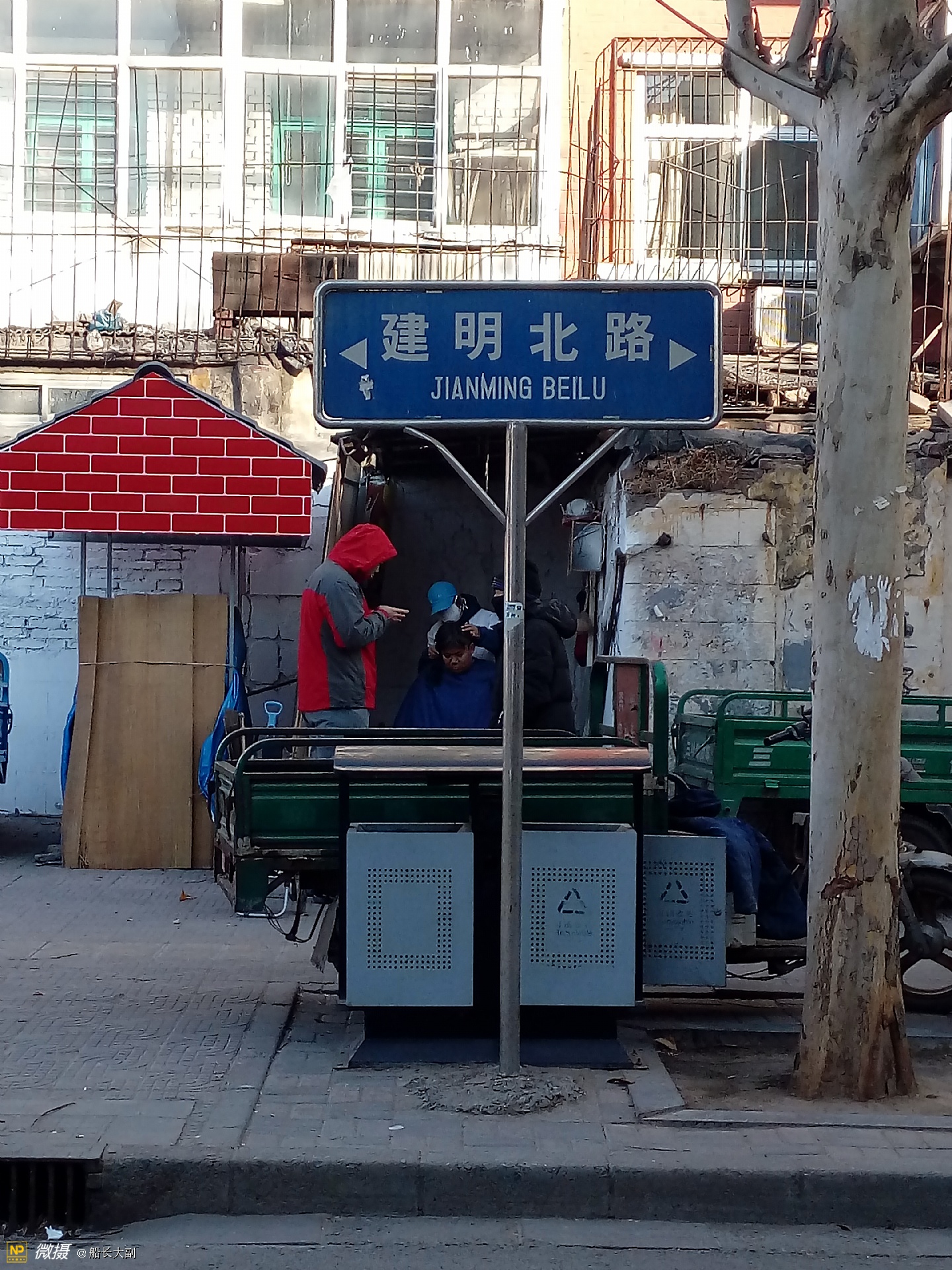 剃头摊前的顾客在寒风中等待