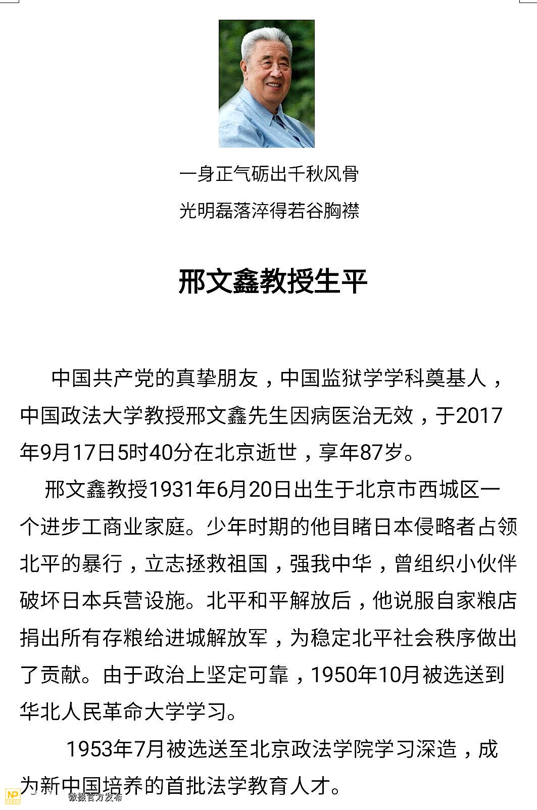深夜得知消息的那一刻,悲伤充斥全身,泪水满溢眼眶。共和国一位伟大的法治尊严的捍卫者,一生坚定依法治国的邢文鑫恩师就这样与世长辞!人终有这一刻的来临,他那极具传奇色彩的人生也在此时划上了休止符。人可以死,但精神不灭,我们会带着他的思想继续走下去,邢老师永垂不朽!——孝子:何世红
