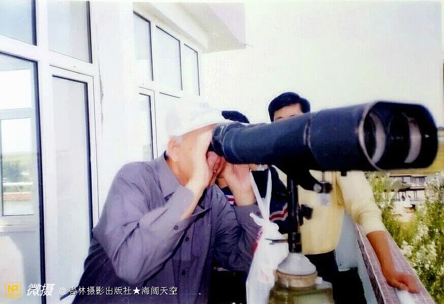 在扎龙自然保护区,慈父通过望远镜欣赏远处的鹤舞云天