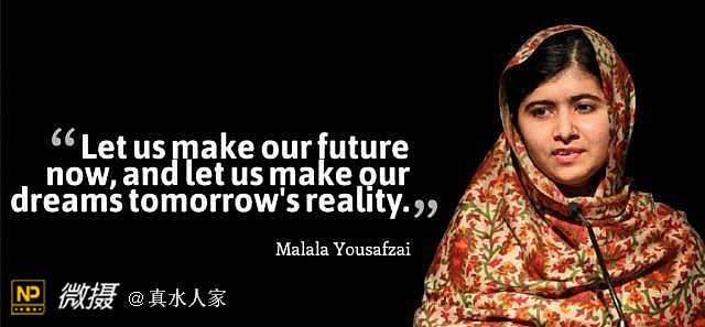 2012年10月9日,那时马拉拉还只是巴基斯坦斯瓦特山谷里的一名15岁女生,当时,她正在放学回家的校车里,一个塔利班男人手持枪械(是的,居然可以随身带枪!),跑上了车,因为扭曲的宗教信仰不允许女孩有上学的权利,他居然走向马拉拉,朝她两次近距离射击,其中一颗子弹穿过她的头部卡在脖子里。她被丢弃在那里等待死亡,幸运的是,她并没有。马拉拉被送往伯明翰的伊丽莎白女王医院接受治疗,在接下来的几个月里,她先后接受了多项手术,包括长达5小时之久的头骨重构手术和人工耳蜗植入以恢复听力。康复后马拉拉到当地的一所学校上学,她被邀请到联合国大会上发表演讲,成为争取世界女性教育权利而闻名的社会活动家。2014年时,她和凯拉什·萨蒂亚尔希共同获得诺贝尔和平奖。