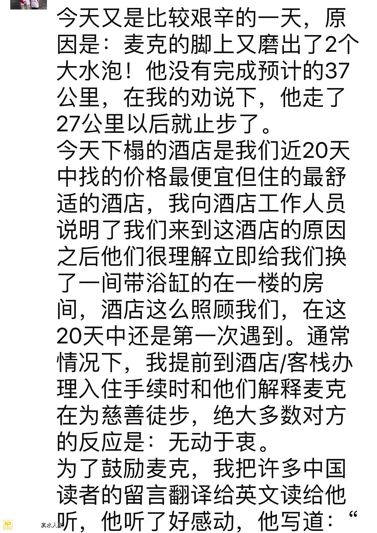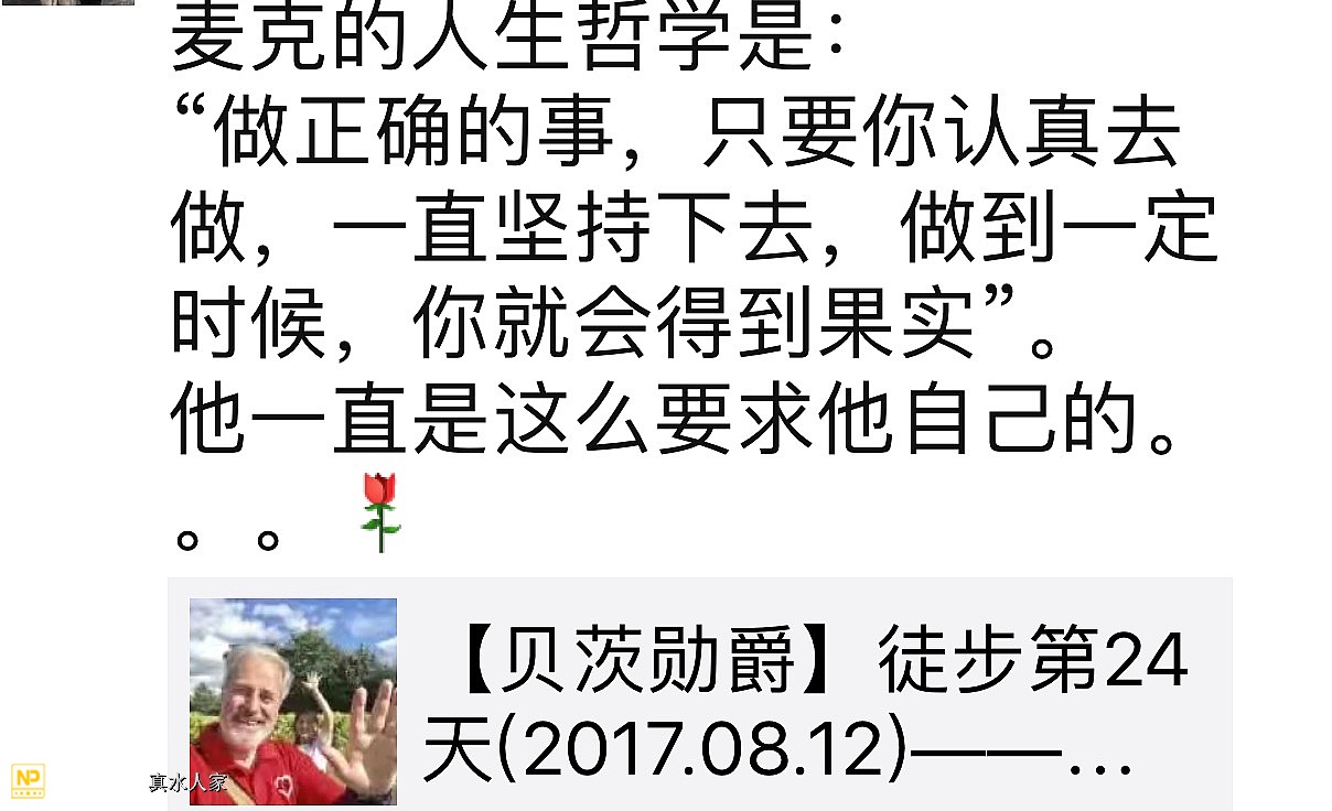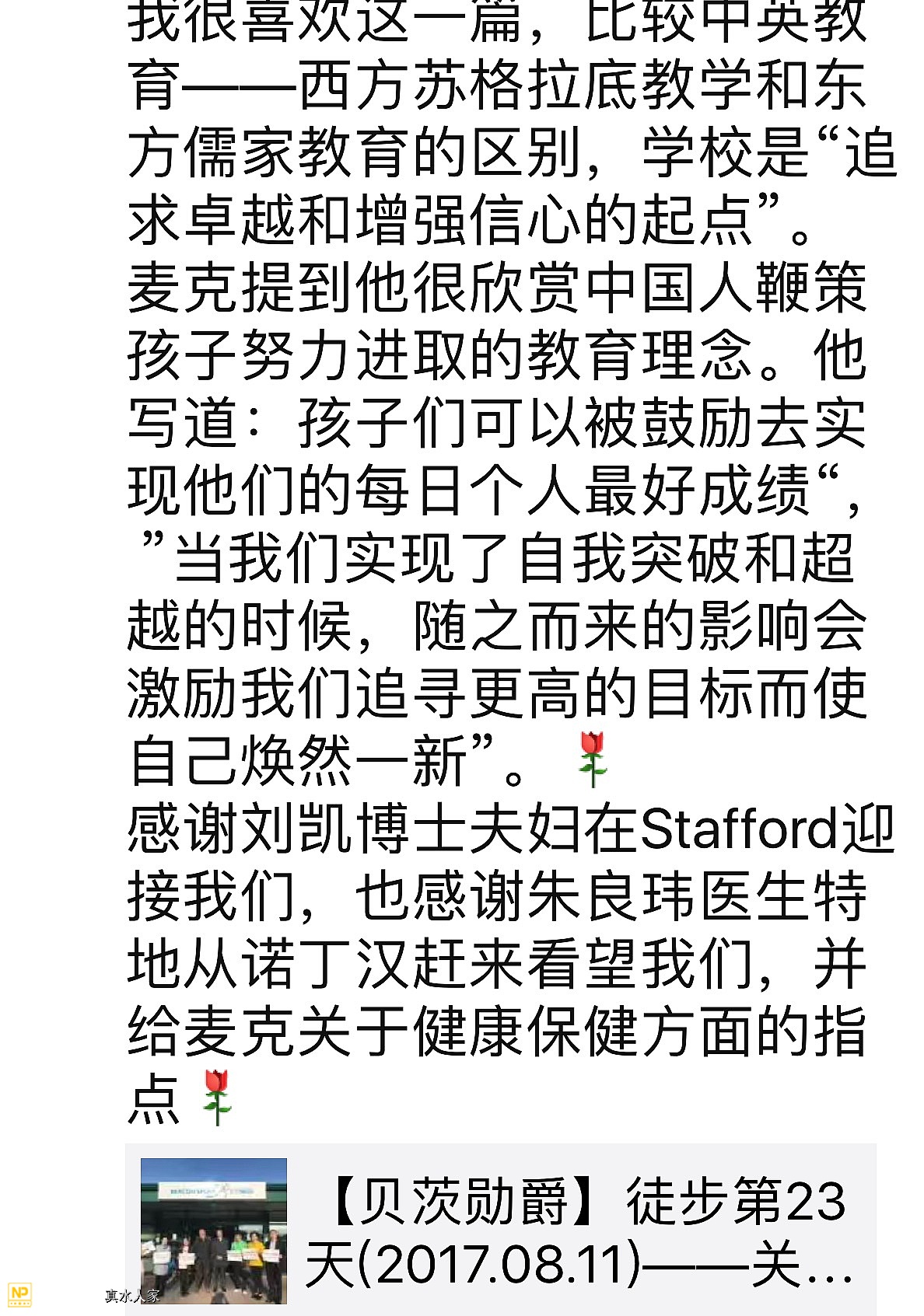 贝茨勋爵日志英文原文如下:Today walked: 22.30 milesTotal walk: 409.90 milesToday raised: £0.00 + ¥ 710.00Total raised fund: £ 9,322.09 + ¥ 69,303.45On paper 21 miles from Bolton to Preston on the A675 didn't look like it was going to be the best day of walking so far, but it was. What made it so?I made an early start--7:30AMThe weather was bright and cloudy with a cool breeze.There were footpaths every step of the way.I didn't get lost once.I was taken up into the Lancashire Hill Country and then treated to some very special views of Preston on the other side.The quiet country lanes (Dove and Gowans) leading down to Gregson Lane were very special.I managed an early finish 4PM in Preston plenty of time to find a Starbucks (Fishgate) to write my blog.Today has been 'A' (Advanced) Level results day in the UK. It is the day when students find out whether they have got the grades to take a place at their first choice university and degree course. It is a day when all the hard work comes to fruition and life changing opportunities are taken, or not.I have never known this experience personally as I never managed to take 'A' levels only 'O' (Ordinary levels) which were remarkable only for one thing and that was that the grade results perfectly spelt F-U-D-G-E (on a scale where A is a top pass, C is a pass F is a fail and and U is ungraded). That said, I am always excited to see others do well because I am passionate about excellence in education.This may sound strange but it is no different to being passionate about sport and love athletics despite the only medal I have won being for finishing 35,648th out of a field of 48,000 in the Great North Run (half marathon). I would have been 35,647th but I was overtaken on the finish line by the front half of two runners competing as a pantomime horse.Back to excellence and education: There were two results which caught the headlines today for different, and yet sadly not so different, reasons.The first was the news that Nobel Laureate, Malala Yousef secured the grades to take a place at Oxford University, Lancashire. I have mat many amazing people in my life but Malala was the most inspirational:On 9 October, 2012 Malala then a fifteen year old schoolgirl in the Swat Valley in Pakistan, was returning home on a school bus when a Taliban man armed with a gun (well it would be wouldn't it!) got on the bus because in his warped view of his religion he didn't believe that girls should be going to school. He went up to Malala and shot her twice at close range with a bullet going through her head and lodging in her neck. She was left for dead, but she didn't die.She was brought to England and underwent months of treatment at the Queen Elizabeth Hospital in Birmingham including a five hour operation to reconstruct her skull and restore her hearing with a cochlear implant. Malala recovered sufficiently to attend a local school and became a powerful advocate for girls education around the world addressing the United Nations General Assembly and being jointly awarded the Nobel Peace Prize in 2014.Through her example and her campaigning literally millions of girls have had the courage to stand up against intimidation and demand their right to educated as equals with boys. I hope her attacker now serving a prison sentence in Pakistan is aware that his evil act was an attempt to terrify young girls from going to school, but the effect has been the exact opposite. Malala is a hero to millions and I am proud to count myself amongst them.But there are other stories too: Georgina Callander was a star student at Runshaw College in Leyland, Lancashire around six miles from where I am writing this blog. Her dream since she was eleven was to be a children's doctor and had applied to study paediatrics (the branch of medicine dealing with children) at university. On 22 May she attended the Ariana Grande concert at Manchester Arena and was murdered by a terrorist whose warped view of his religion believed that he should kill girls and women because they were listening to pop music. Today, on the day when she should have been opening her A Level results her grief stricken mother revealed that she had won a place at university to study for a degree paediatrics.We rationalise and seek to make sense of what happened to Malala by what came out of it, but what about for Georgina? How do we explain that? I wish I knew? It seems as Shakespeare put it that there is 'neither rhyme (pattern) or reason (logic) in this world' but we want to believe otherwise so we choose the examples which make the case and overlook the ones that don't.It is in our nature to have hope and in giving thanks for Malala Yousef today and all her example has done and is doing around the world, I find myself drawn to express the hope that from Georgina's dream to help children others may be inspired to respond that beautiful and noble Calling.