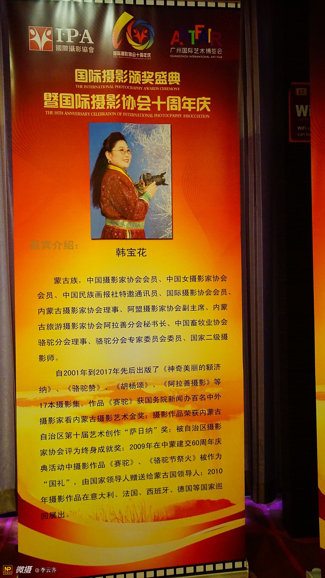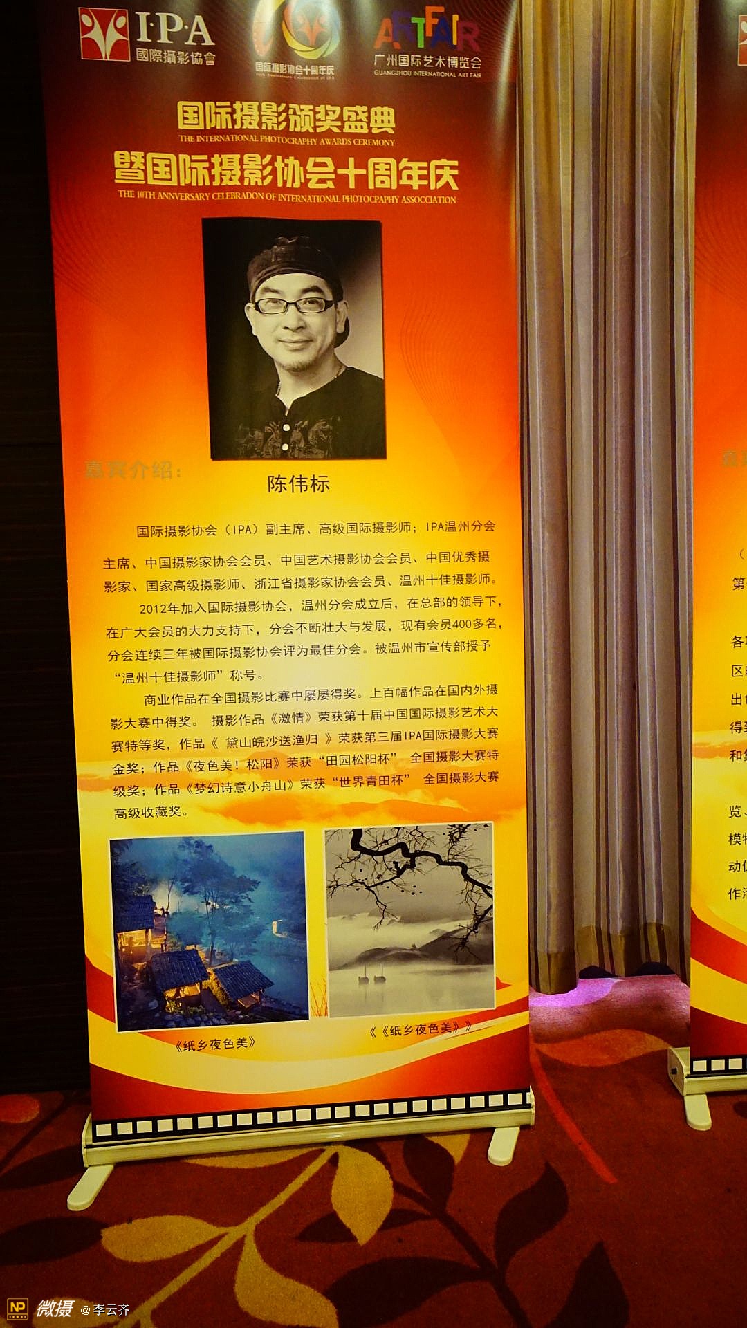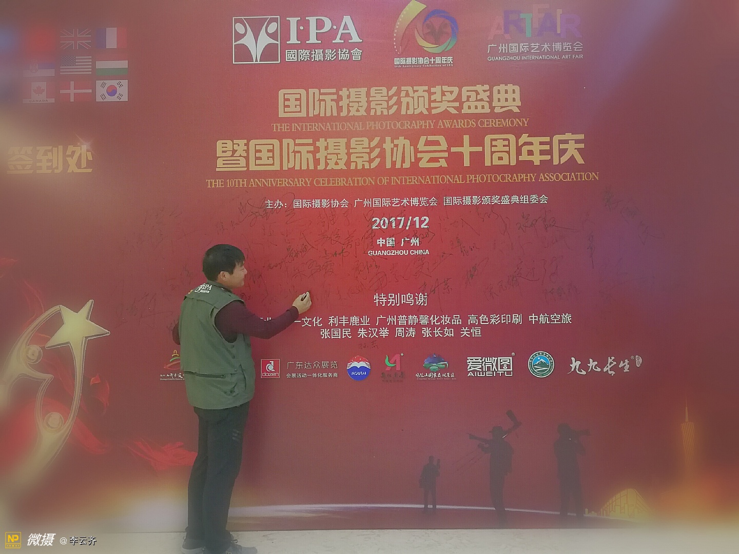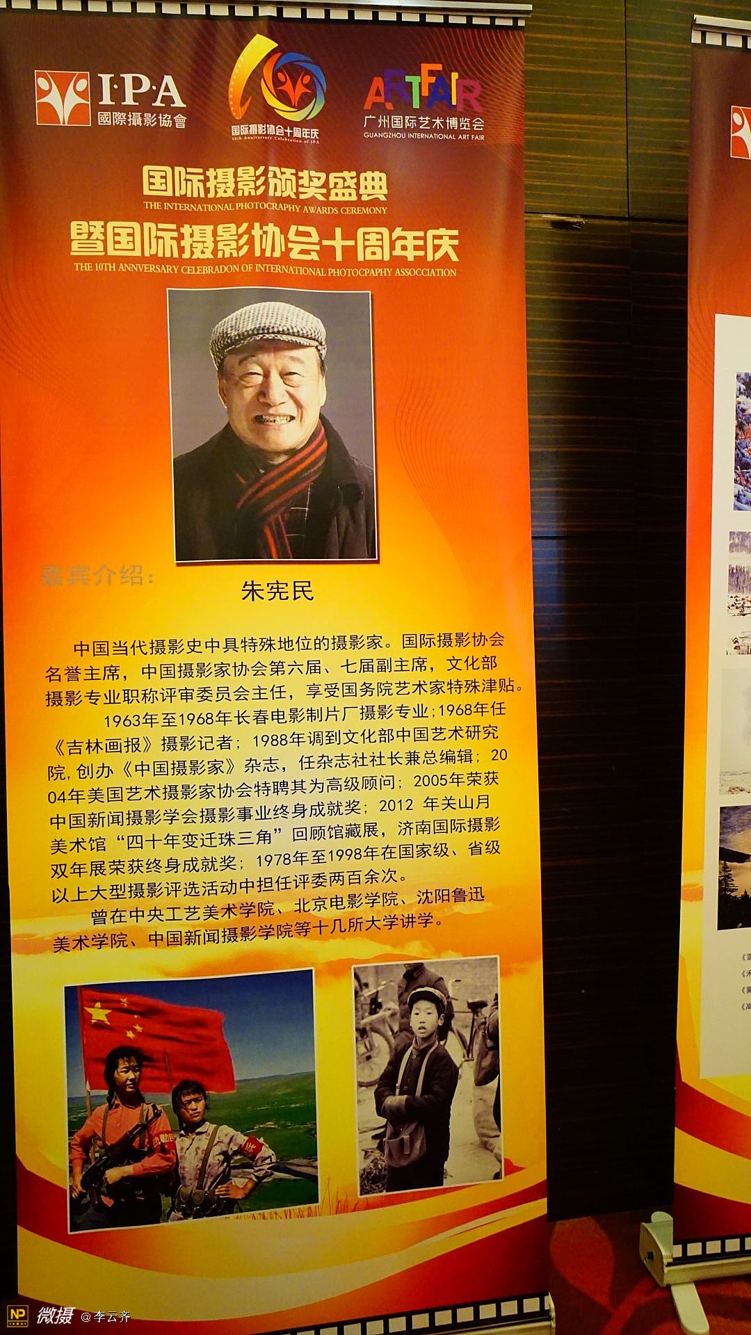 《国际摄影颁奖盛典暨国际摄影协会十周年庆典》在一片欢呼声中落下帷幕! 今夜无眠,因为我们是国际摄影协会大家庭的成员,因为我们许多摄影者在这里获得了荣誉证书和称号,因为我们都能在这里得到发展和鼓励鼓舞! 没有想到,这次盛典庆典组织的如此精彩和完美;没有想到,这次大会从筹划到落幕如此惊喜和感动;没有想到我们远道而来的摄影者从到达广州机场和火车站的那一刻起就得到大会工作人员的热情接待和安排,吃的住的行的都让我们放心和享受;没有想到大会晚宴如此丰盛和美味,还有精彩的演出,专业的歌喉,动听的音乐,主持人的完美演绎,礼仪小姐的婀娜多姿,十年历程的回顾,长枪短炮的咔嚓声响,不间断的摄像和拍照,领导和我们的互动和合照,与会者之间的交流和沟通,等等一切都使我们为之感叹和骄傲! 千言万语,只能说,我们的国际摄影协会是一个能让我们实现梦想的家园,我们尊敬的赵旭新主席是我们公认的最有实力能力和执行力的好领导好哥们好兄弟好园长好司令!