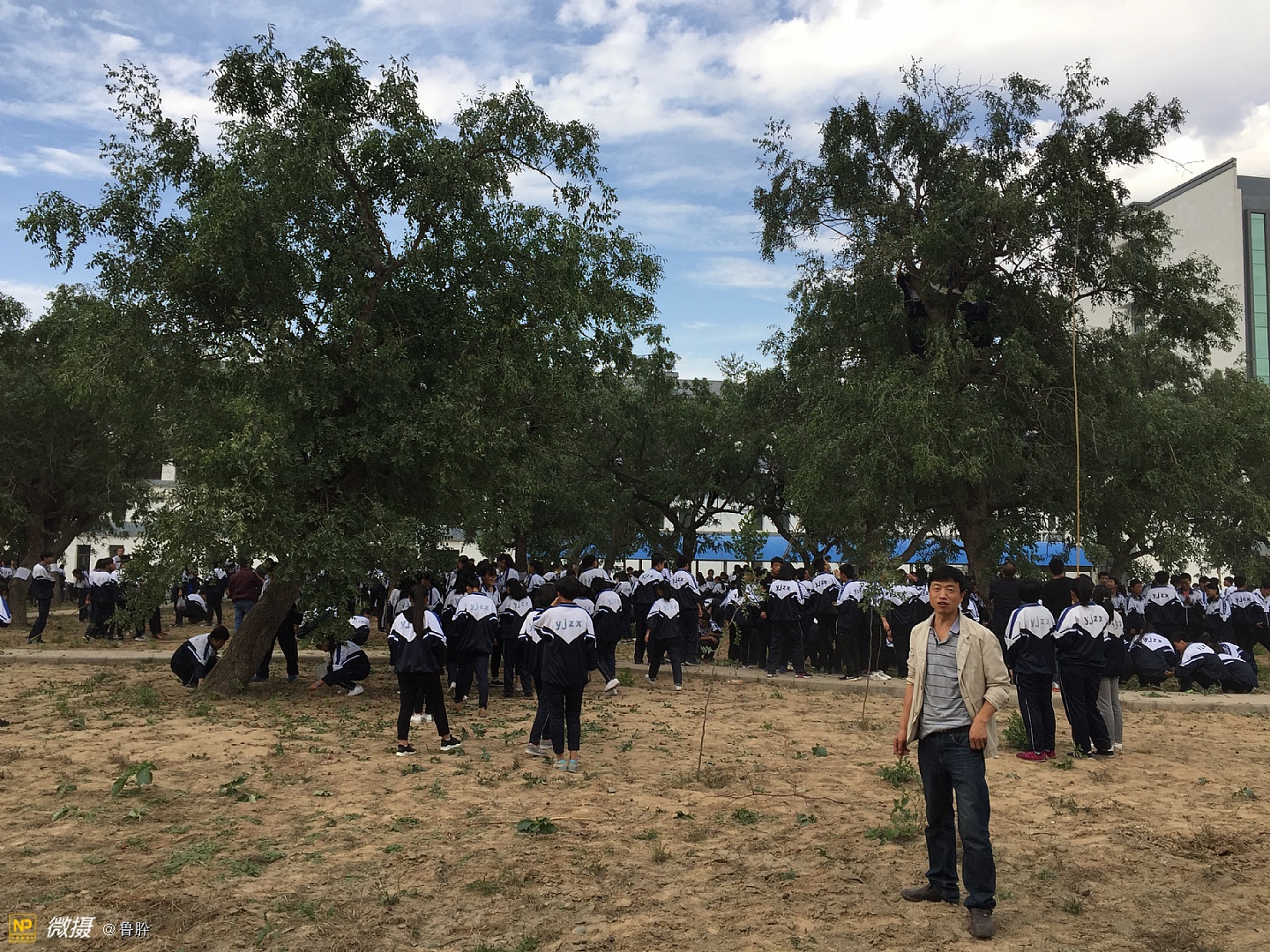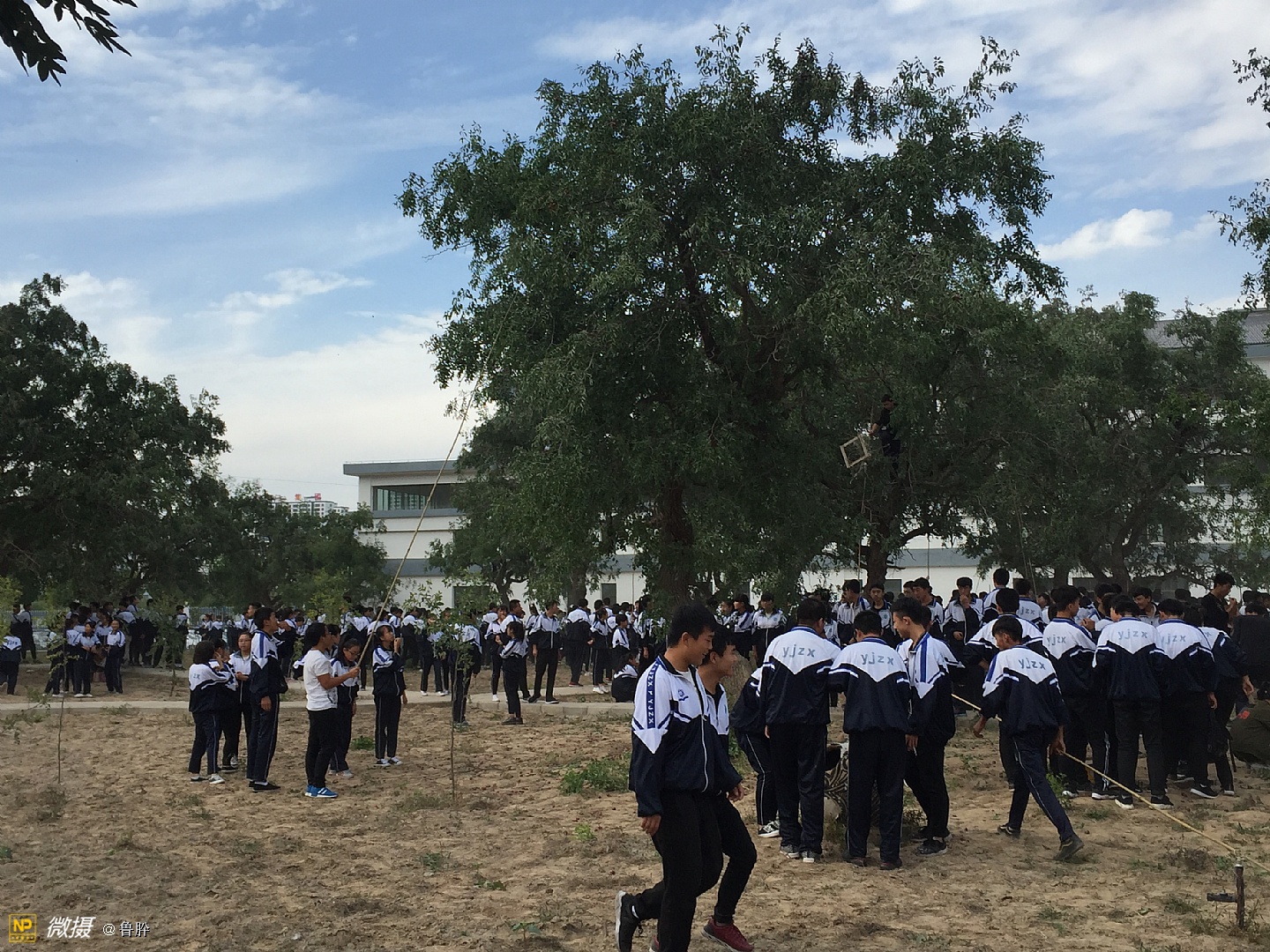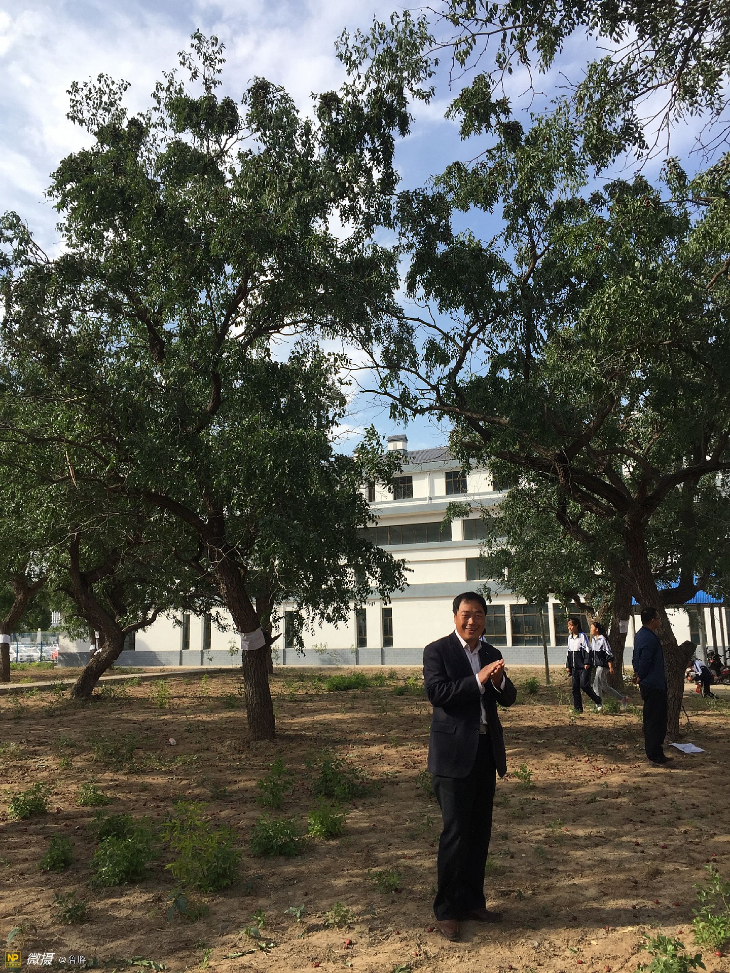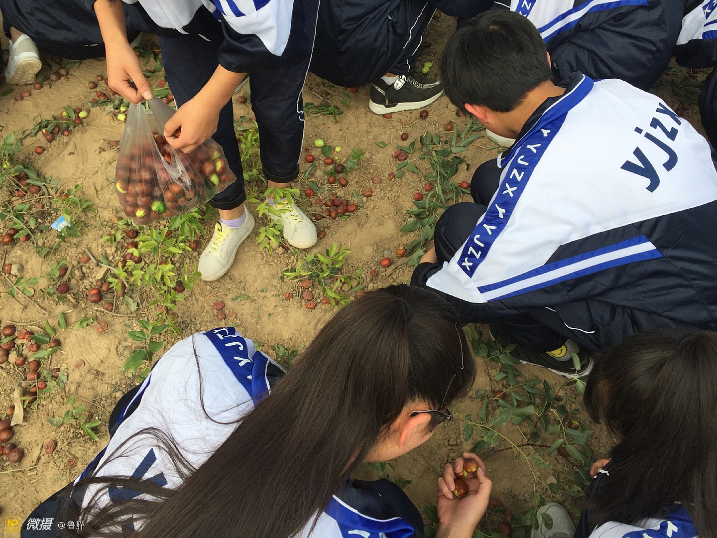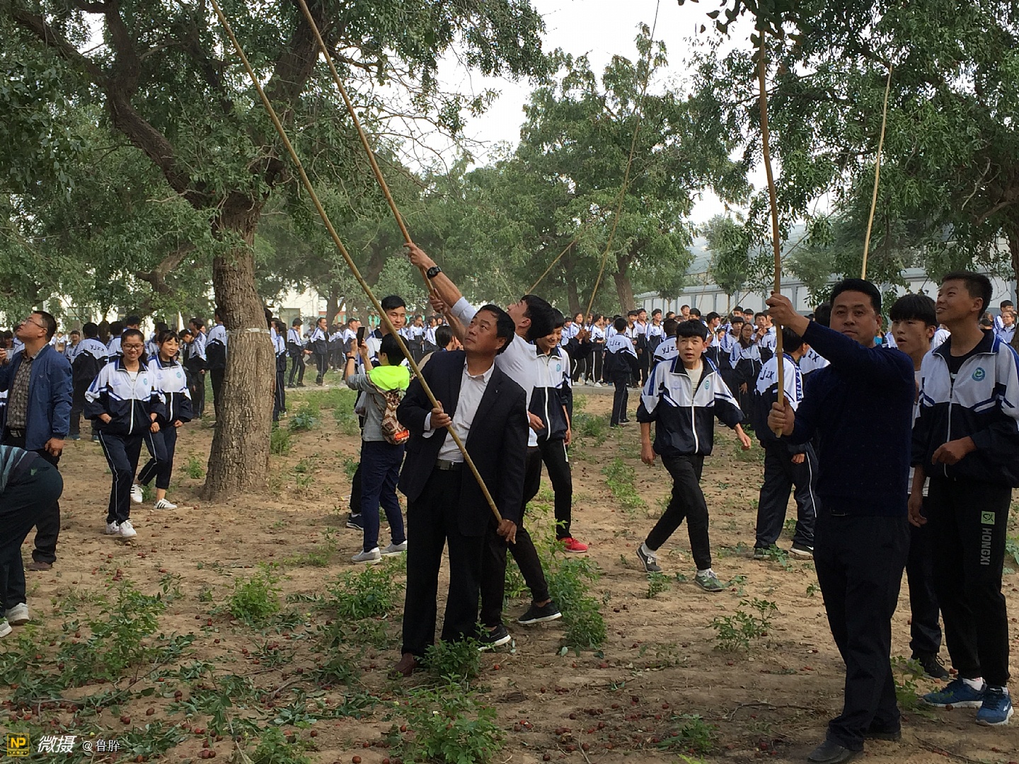 高二年级包级领导亲临现场,准备指挥打枣。亲自拿起竹杆和正教副主任开始了打枣。