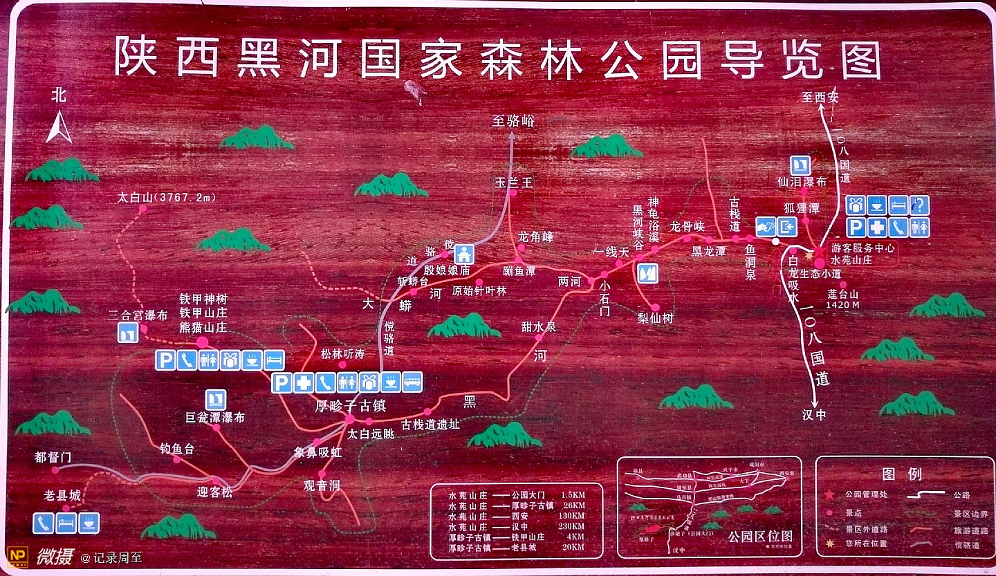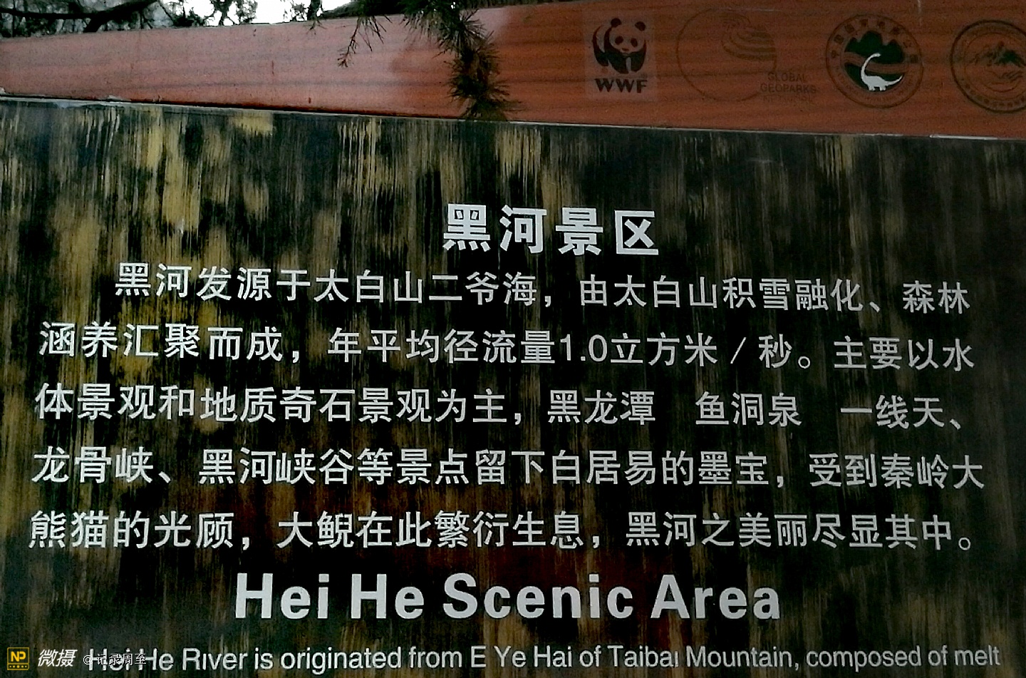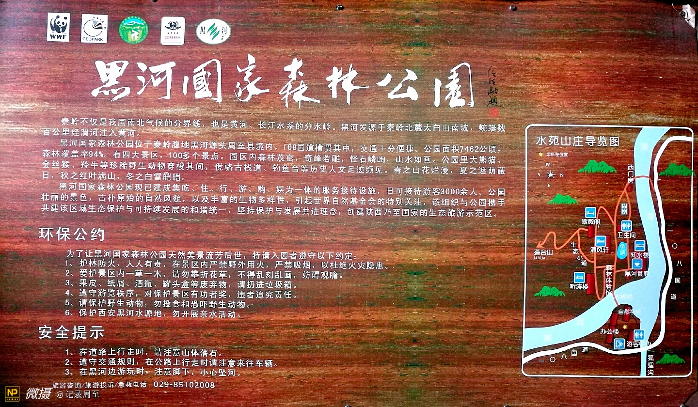 周至县南依秦岭,北濒渭水,襟山带河,以山重水复而得名,素有“金周至”之美誉。陕西黑河国家森林公园位于周至县境内黑河源头,面积7462公顷,森林覆盖率94%,公园有四大景区——黑河景区、大树沟景区、大蟒河景区、厚畛子景区,共有100多个景点。园区森林茂密,奇峰若雕,怪石嶙峋,山水如画。大熊猫、金丝猴、羚牛等珍稀野生动物徜徉其间,傥骆道、营盘梁、钓鱼台、大蟒河等历史人文景观坐落其中,凸显着深沉厚重的文化底蕴,被誉为北方的“香格里拉”。