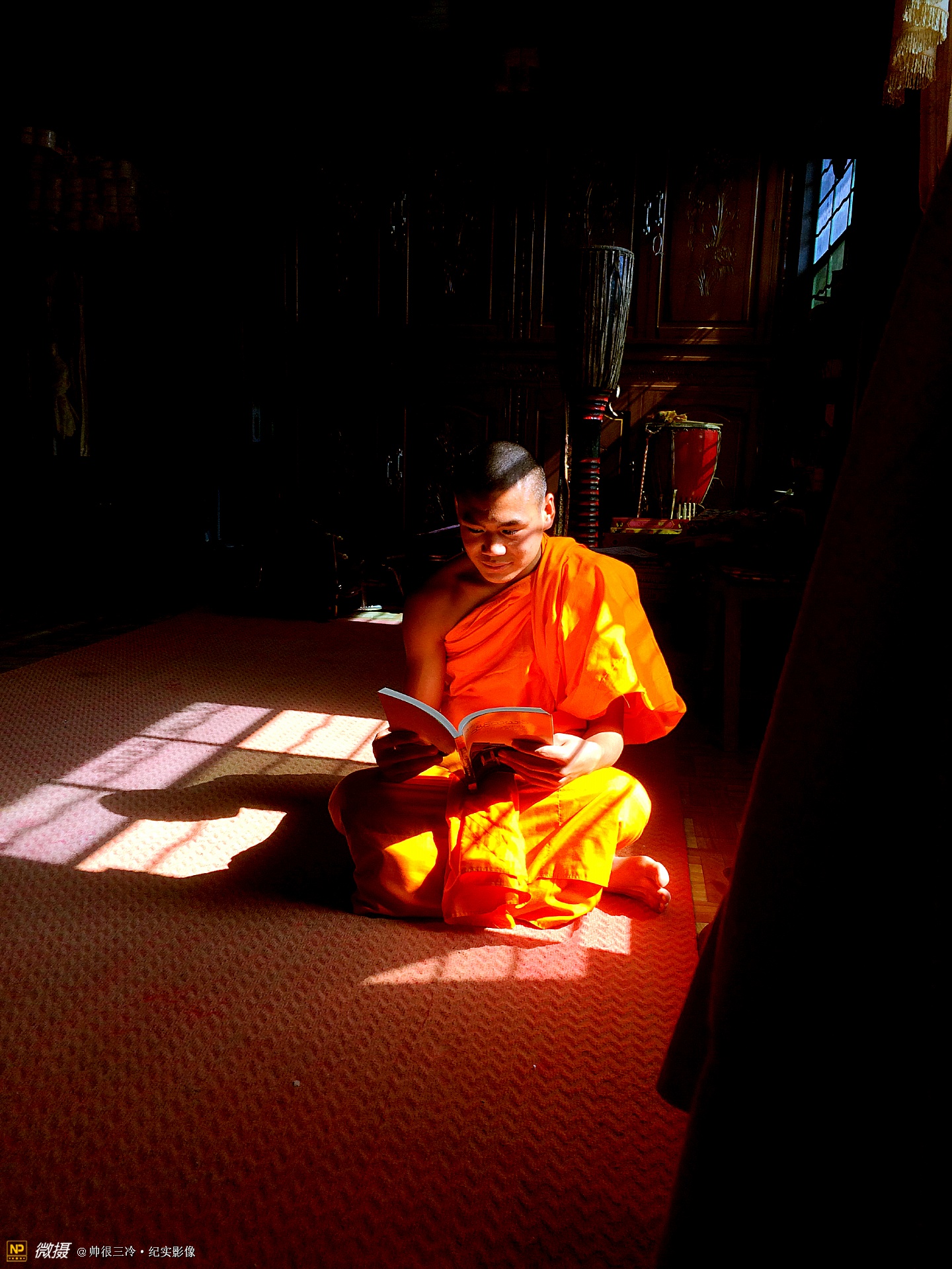 傣族信奉南传佛教,几乎每个村寨都建有奘房(寺庙),一个奘房都会供养3个左右的和尚或佛爷。《晨读,瑞丽小和尚》摄于云南瑞丽市弄岛镇等相寨子奘房