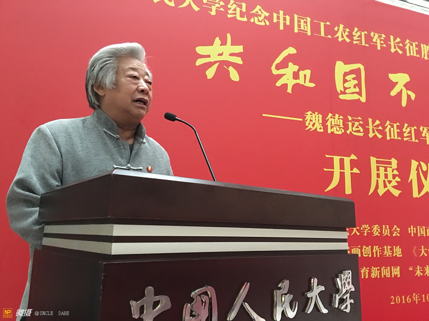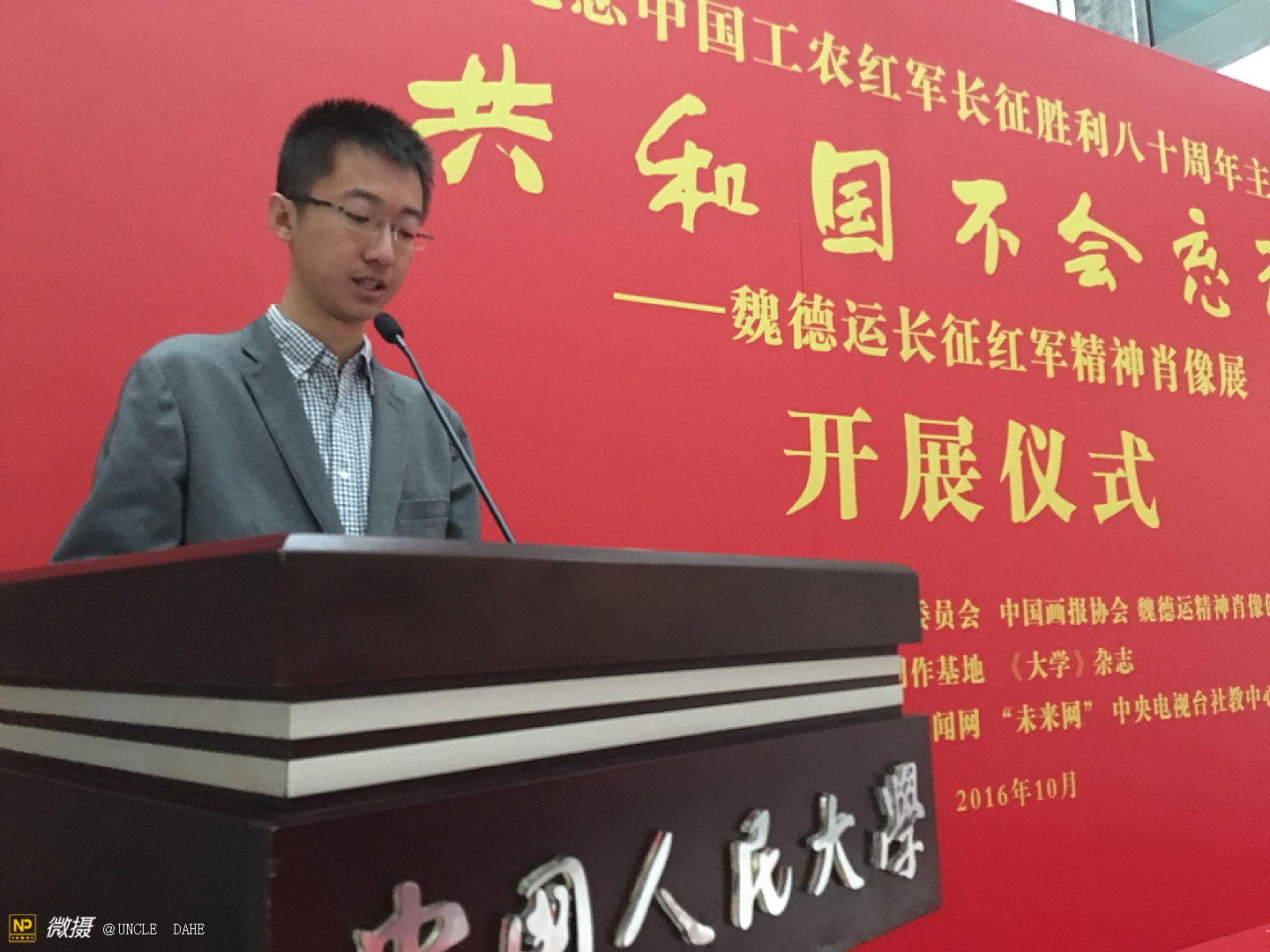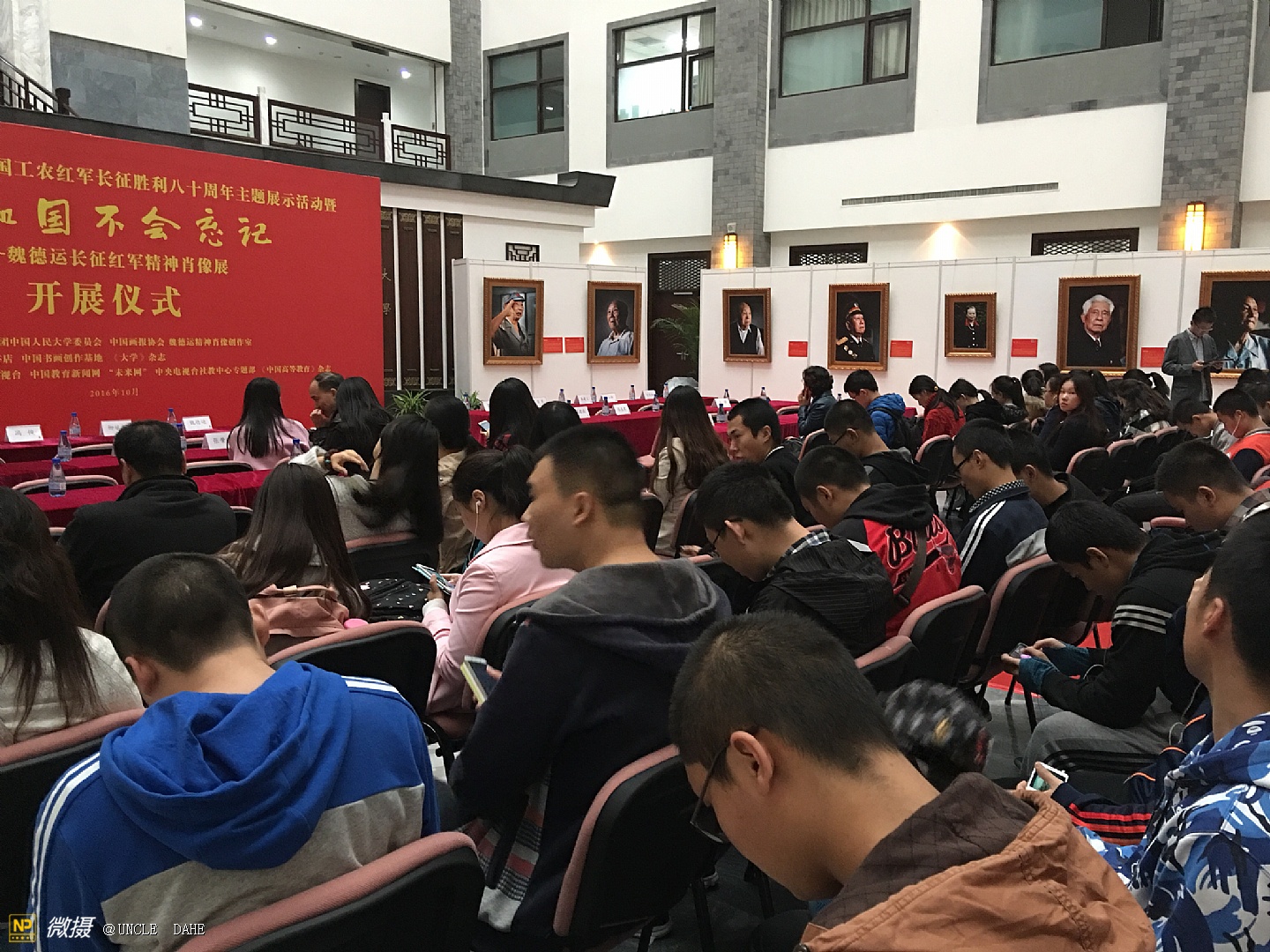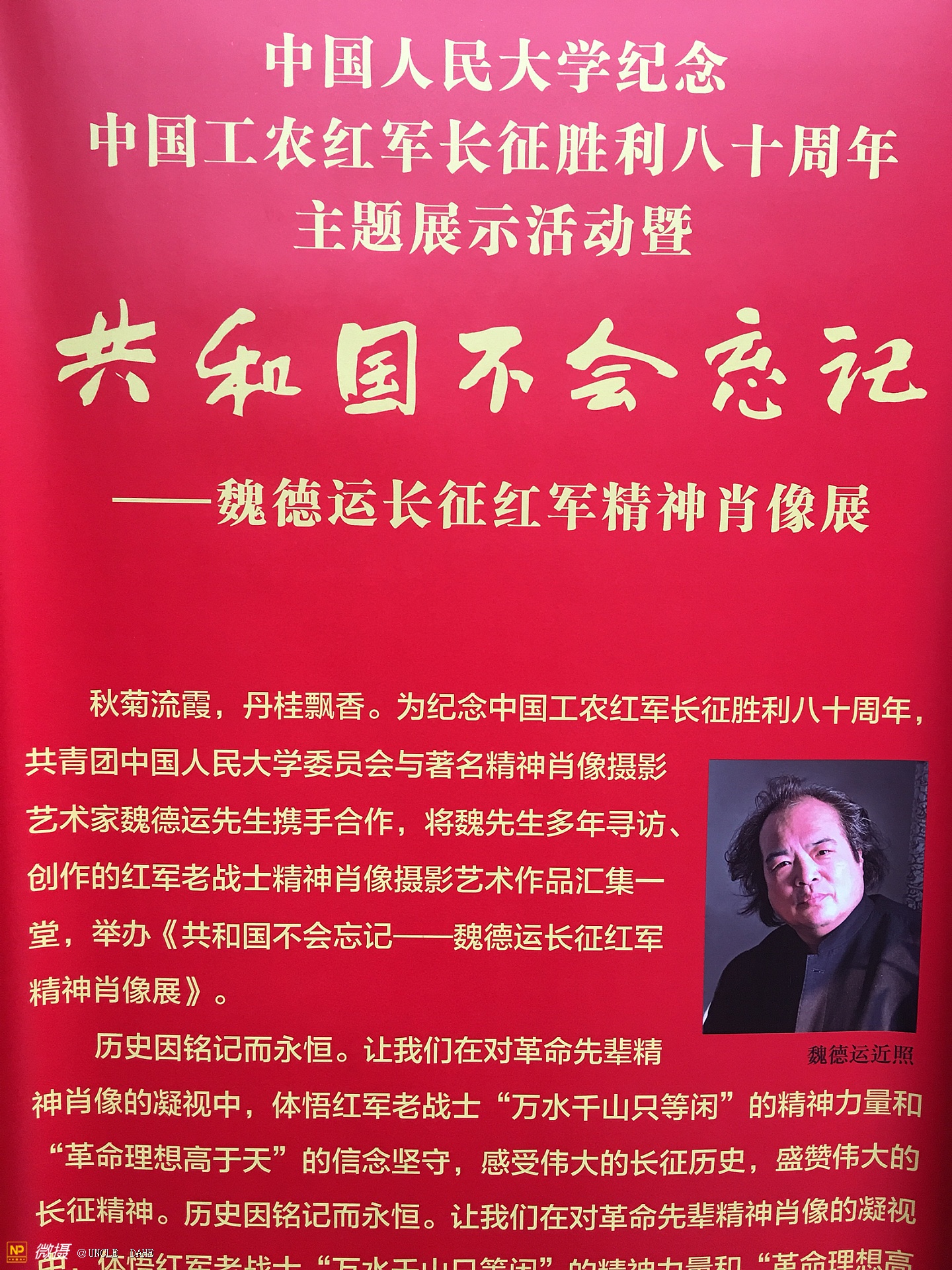 达盖尔奖获得者、著名领袖精神肖像摄影艺术大师魏徳运先生纪念中国工农红军长征胜利八十周年主题摄影展:《共和国不会忘记》今天下午在中国人民大学国学馆隆重举行。这是该展全国大规模高校巡展第二站。中国人民大学师生一起和来宾迎接老红军的精神肖像走进校园。中央党史研究室、中国人民大学、国家摄影等领导出席活动开幕式。微摄(APP)做为活动官方手机移动互联网图片社交平台正在全程直播中……