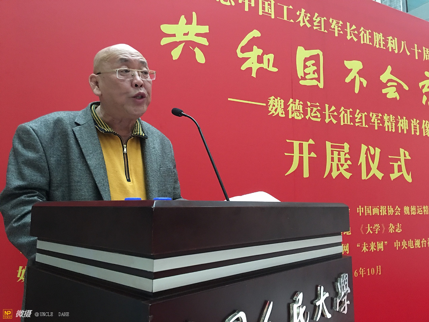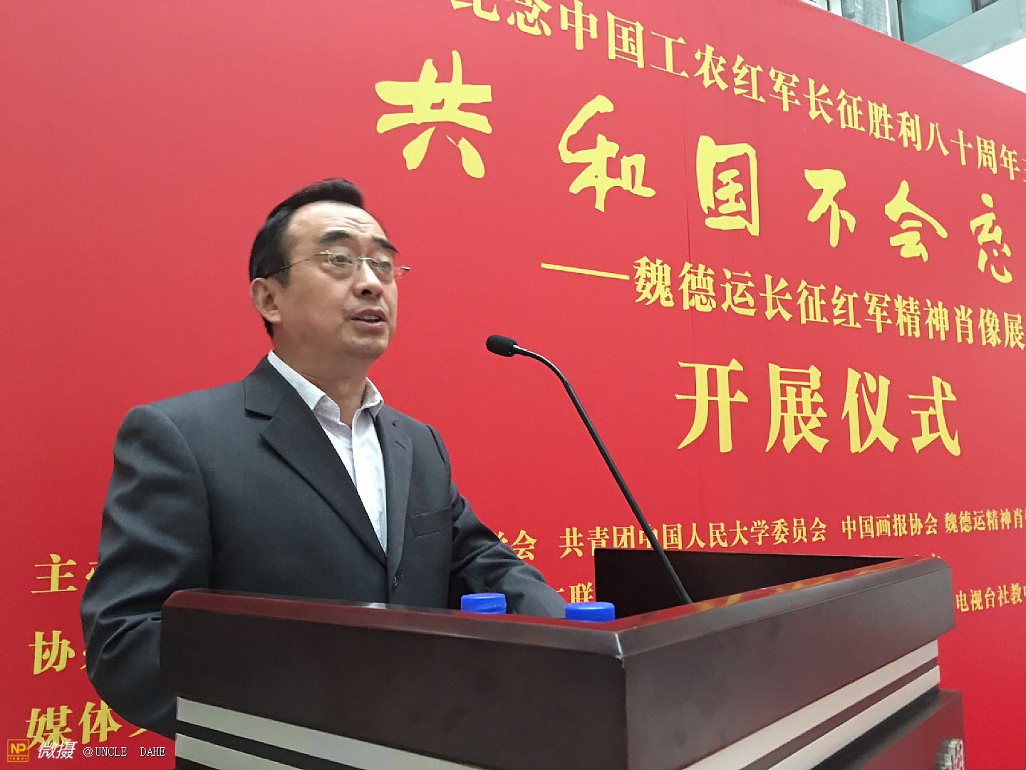 中央党史研究室研究员、中共党史学会副秘书长庞松宣读全国人大常委会教科文卫体主任柳斌杰为纪念中国工农红军长征胜利八十周年主题展示活动暨《共和国不会忘记》魏德运长征红军精神肖像展的祝贺辞。