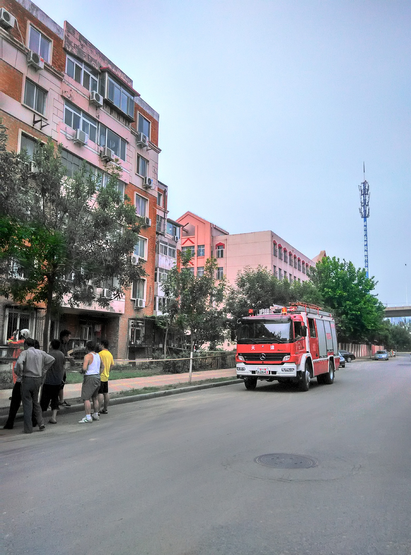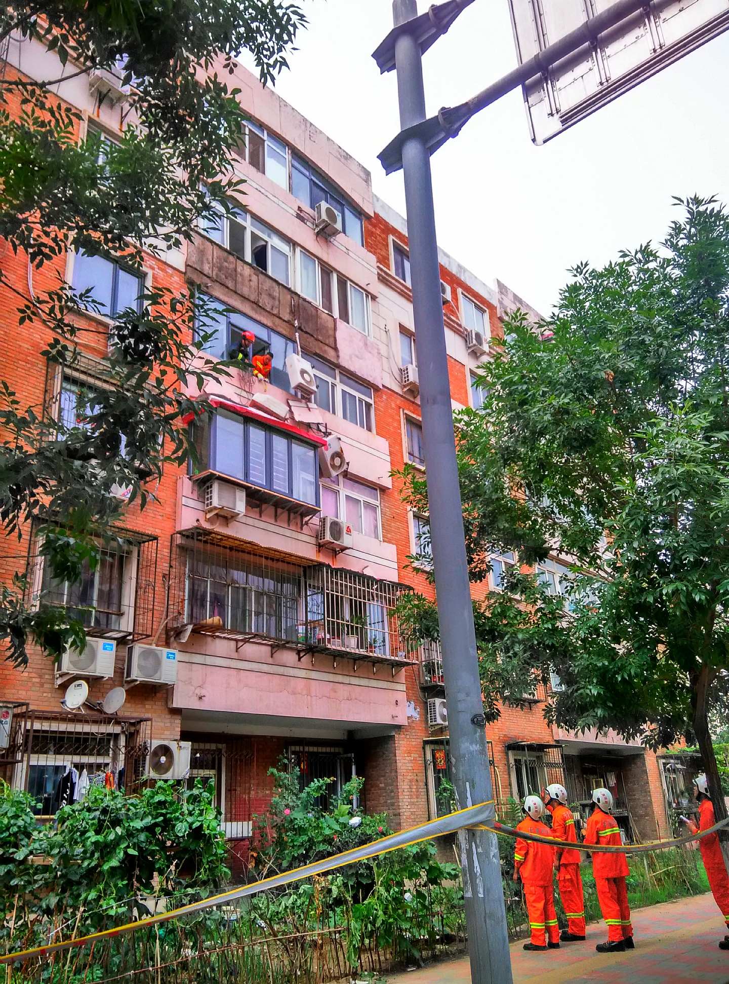 消防叔叔正清理脱落的外墙皮。