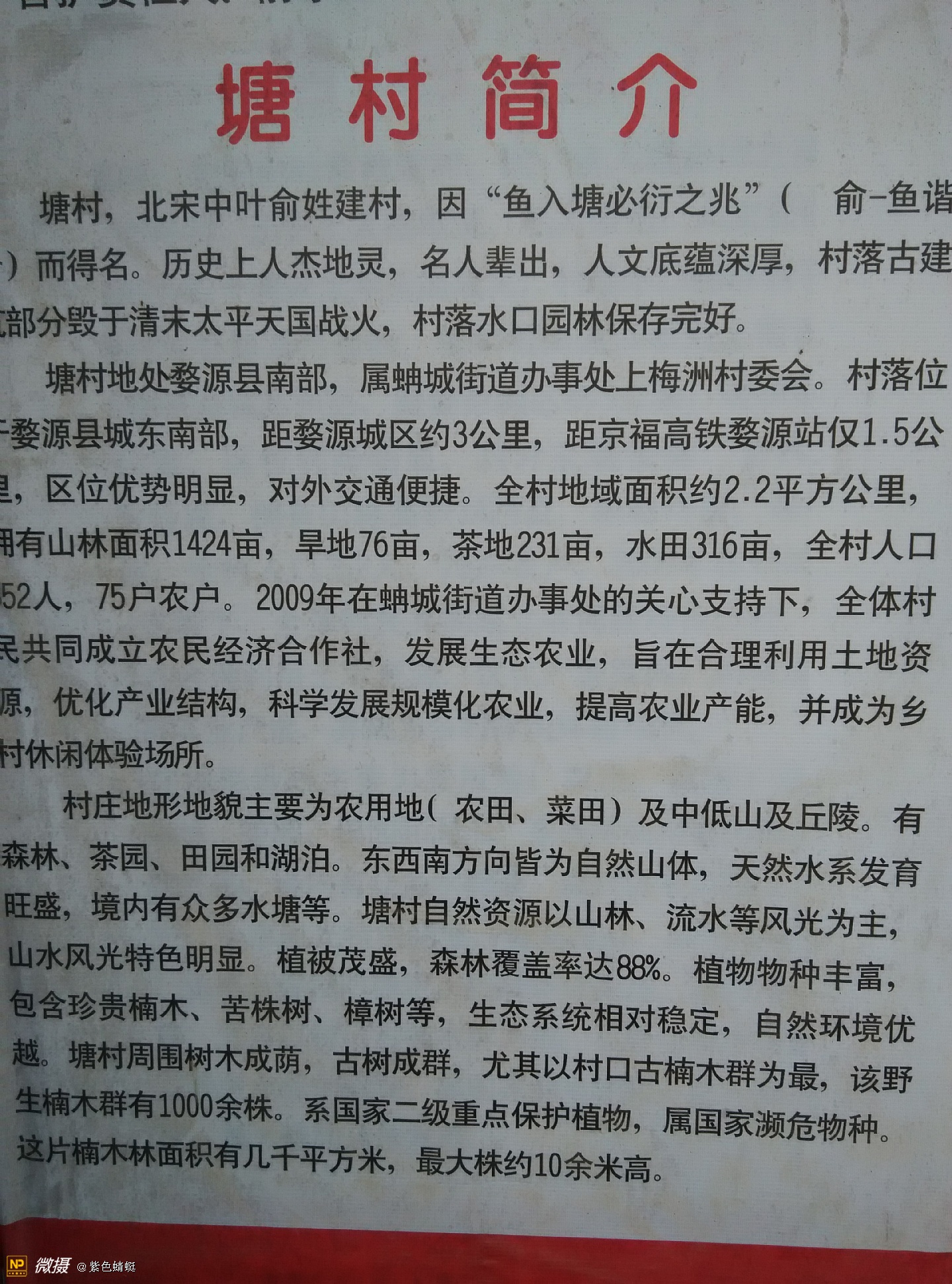 塘村,北宋中叶俞姓建村,因“鱼入塘必衍之兆”而得名,历史上人杰地灵,名人辈出,人文底蕴深厚,村落古建筑部分毁于清末太平天国战火,村落水口园林保持完好。