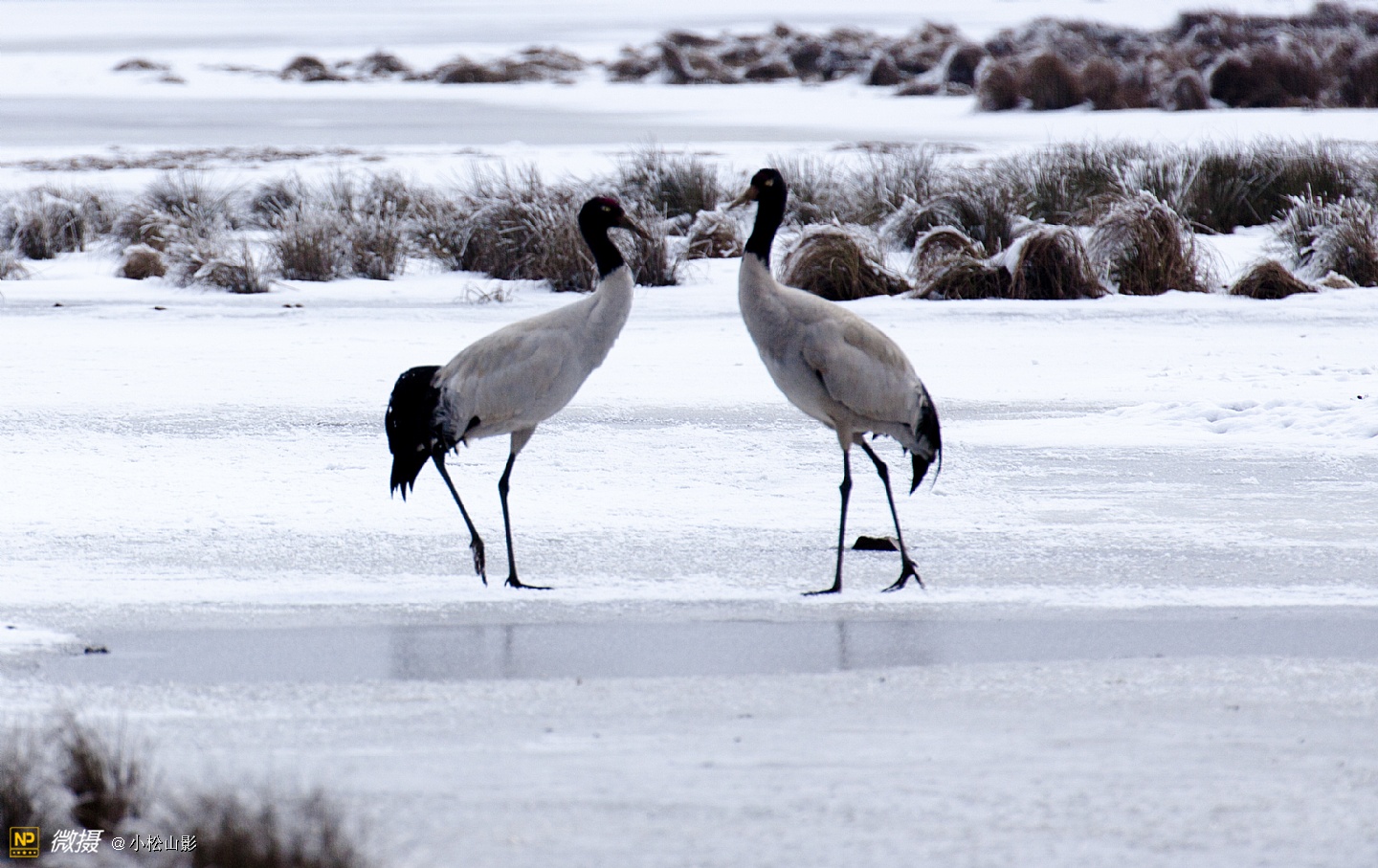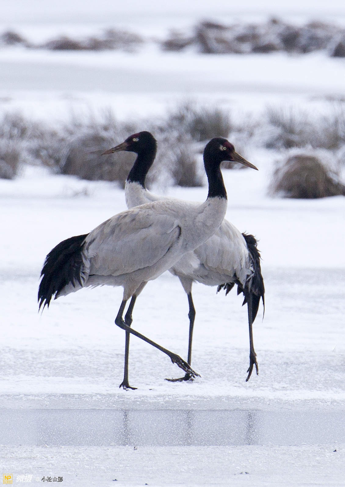 鹤夫妻在冰雪中相伴行走,欣赏它们似仙女一般飘逸的步伐令人陶醉。