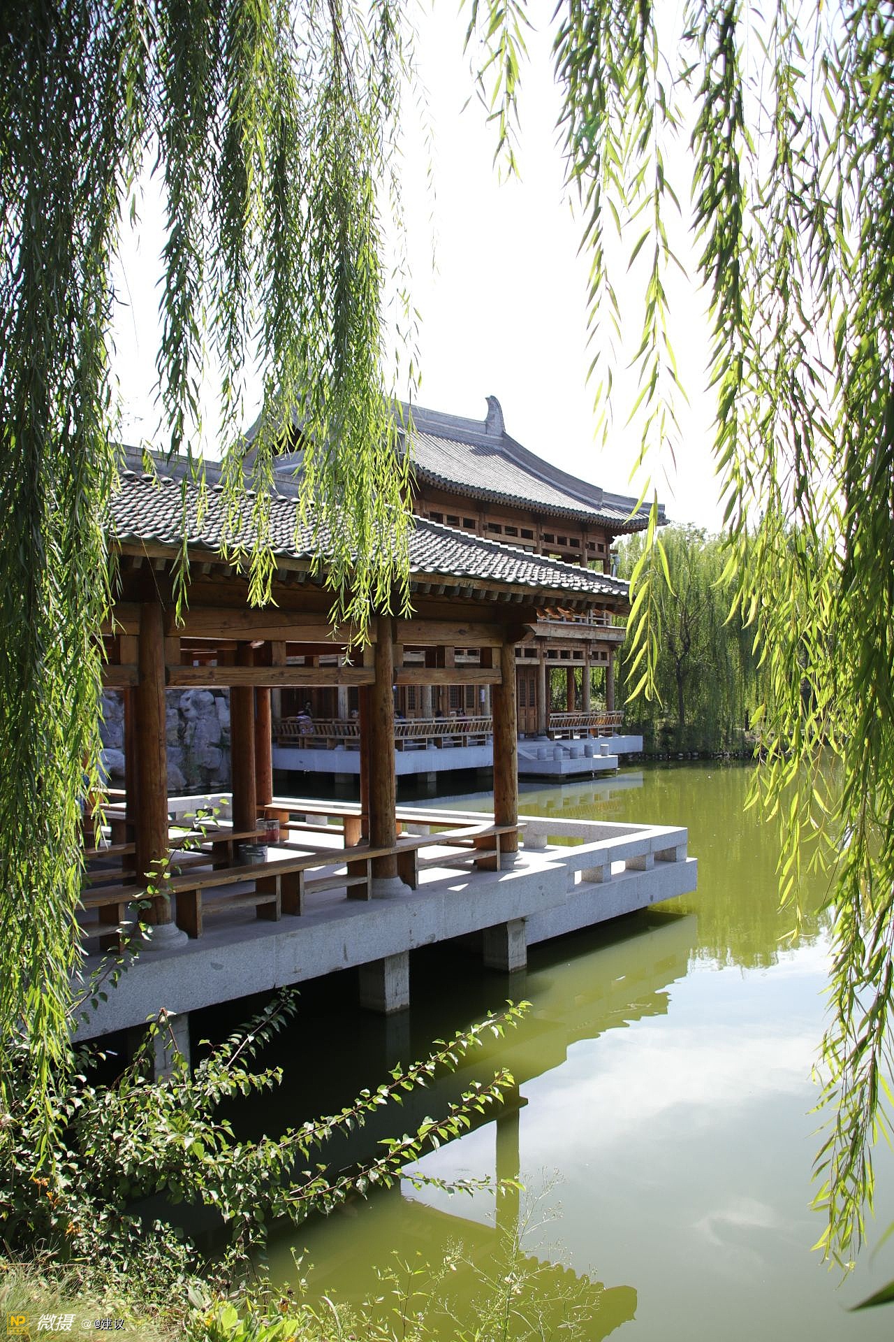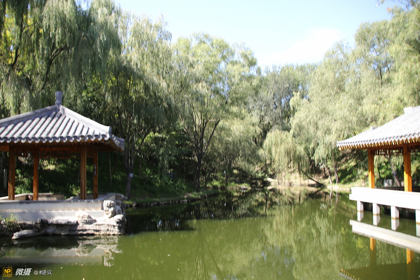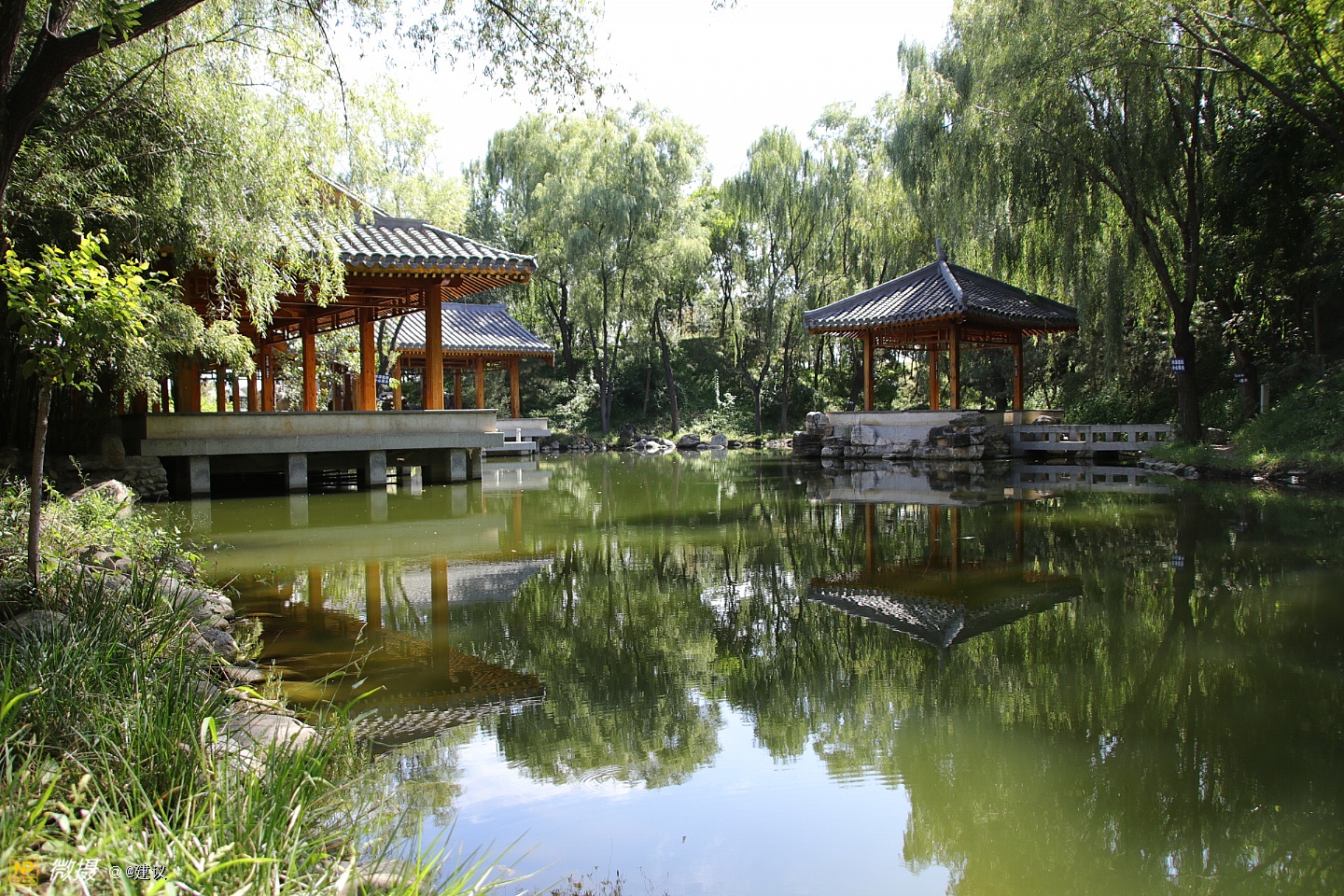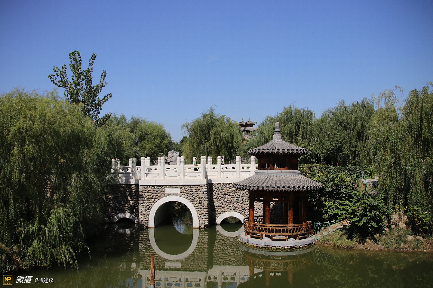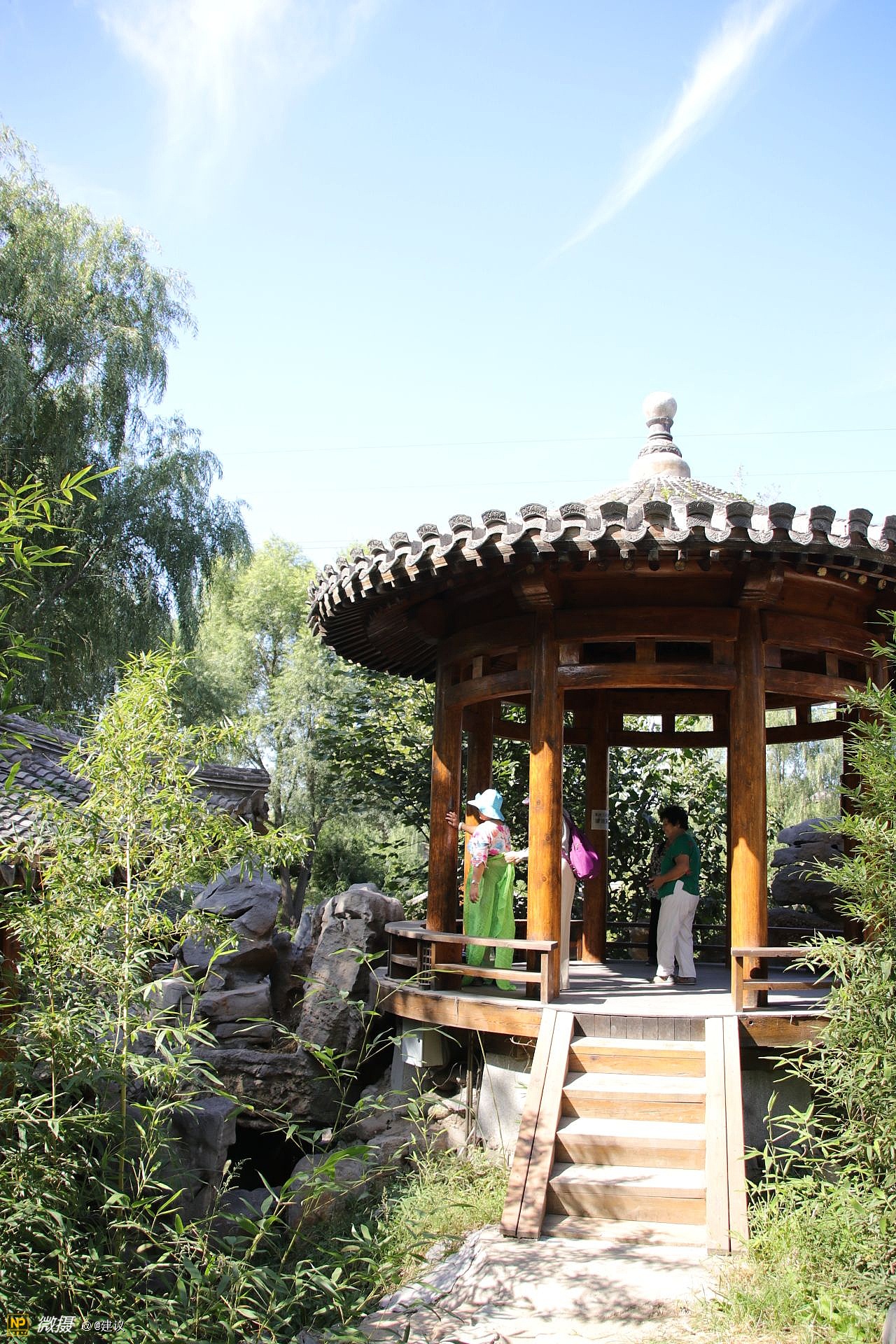 榆树庄公园,总规划面积768亩,水面40多亩。由清华大学建筑学院纪怀禄教授负责设计。分成四个区,分别为:湖泊景区、山岳景区、丘陵景区和平原景区。整个园林是以苏州园林为蓝图,在此基础上加上了隋唐建筑的精华,以木结构为主,不进行任何彩绘和油漆,呈现的是松木本身的色彩和花纹。