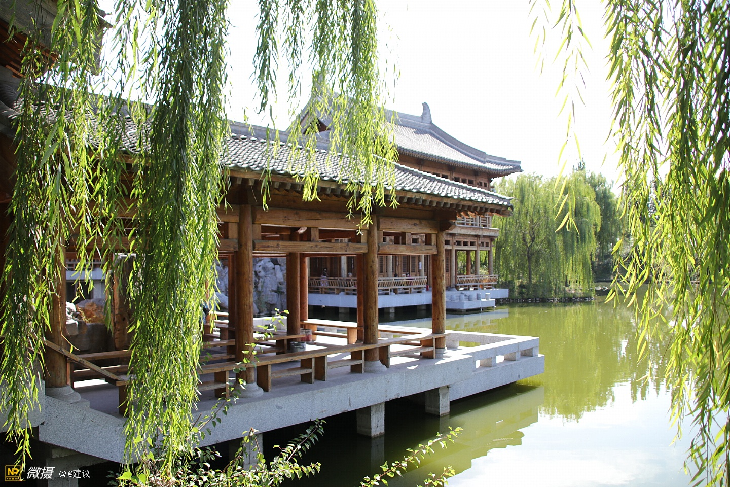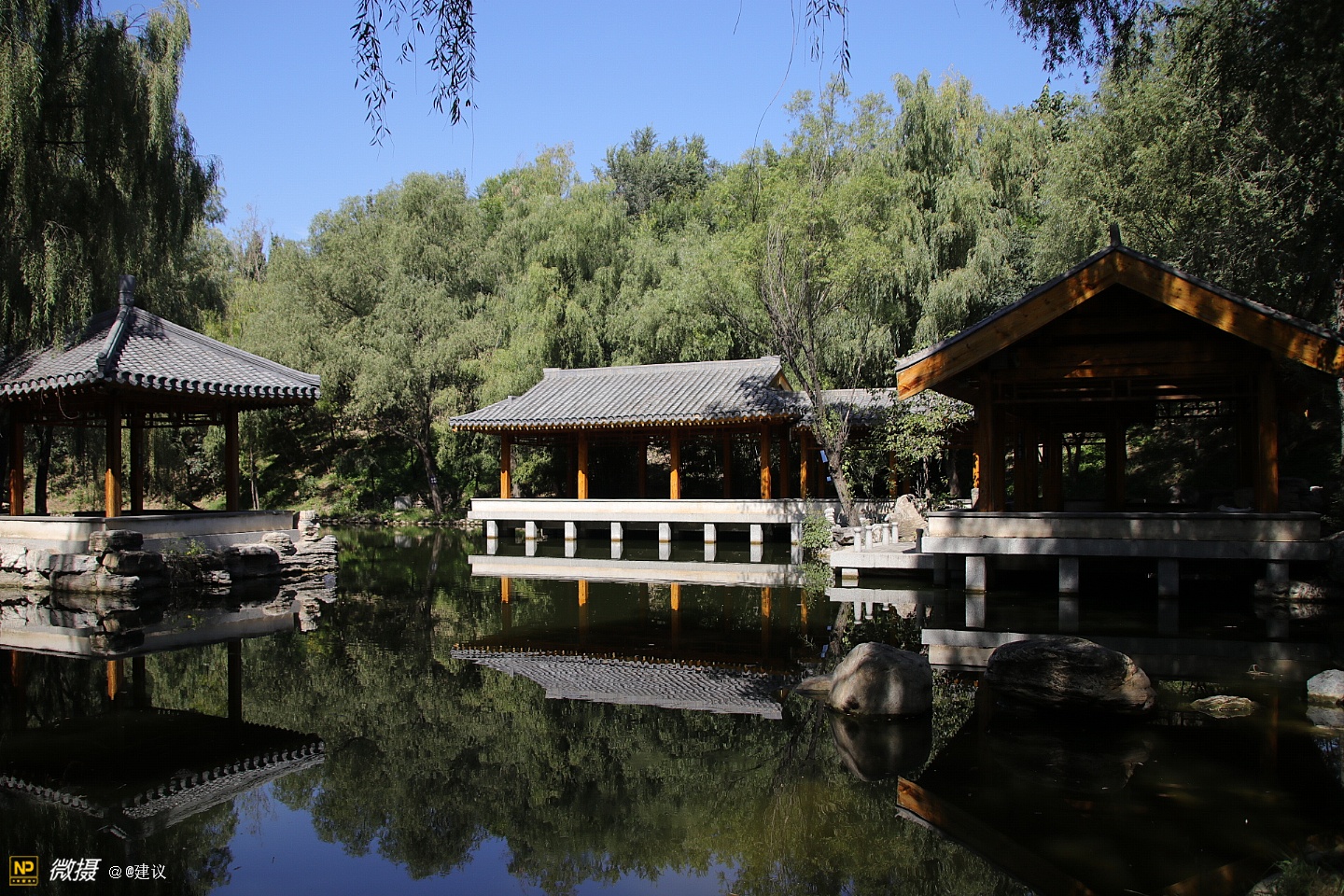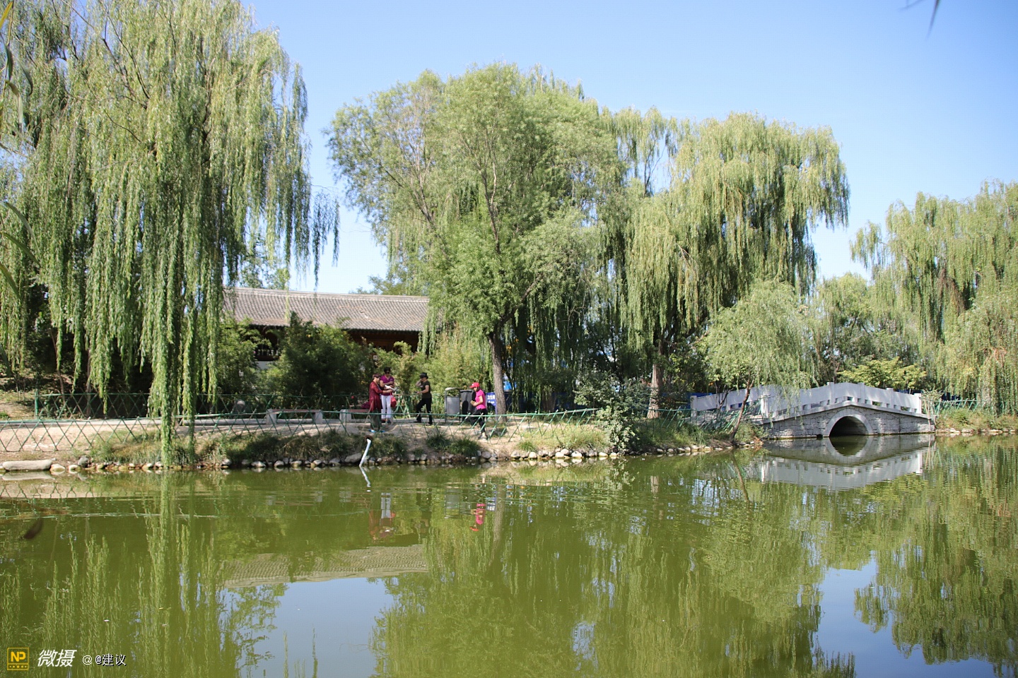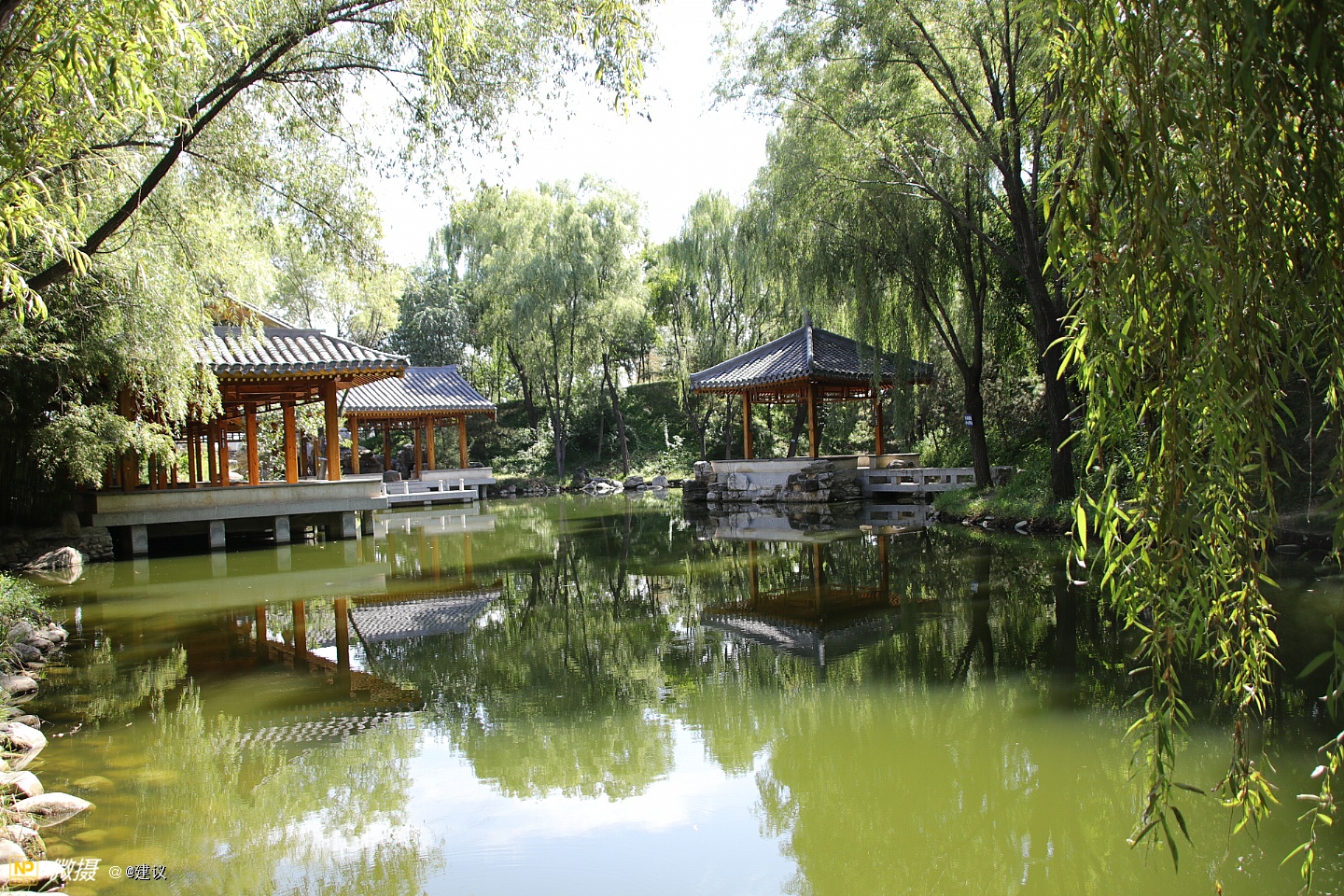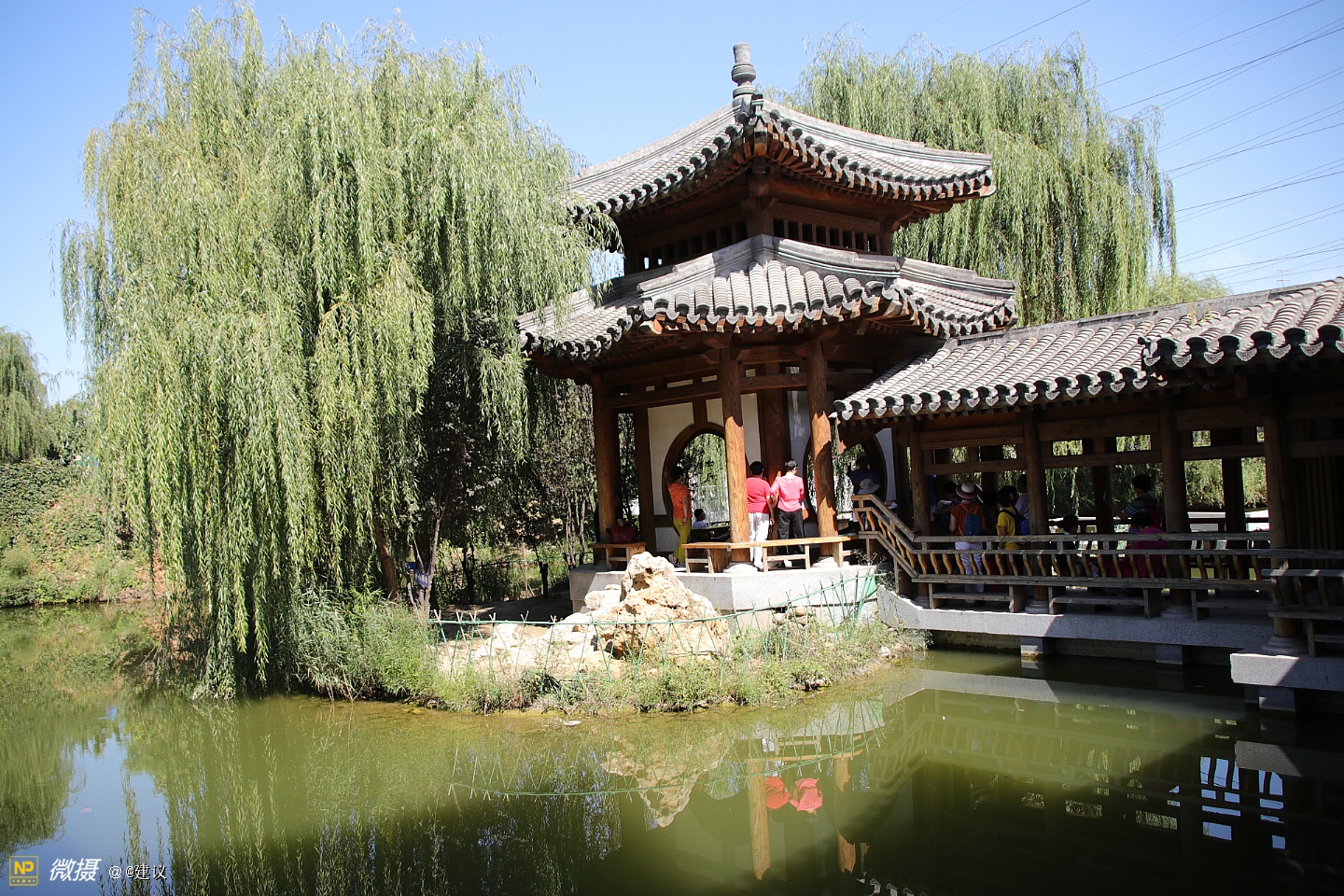 榆树庄公园,总规划面积768亩,水面40多亩。由清华大学建筑学院纪怀禄教授负责设计。分成四个区,分别为:湖泊景区、山岳景区、丘陵景区和平原景区。整个园林是以苏州园林为蓝图,在此基础上加上了隋唐建筑的精华,以木结构为主,不进行任何彩绘和油漆,呈现的是松木本身的色彩和花纹。