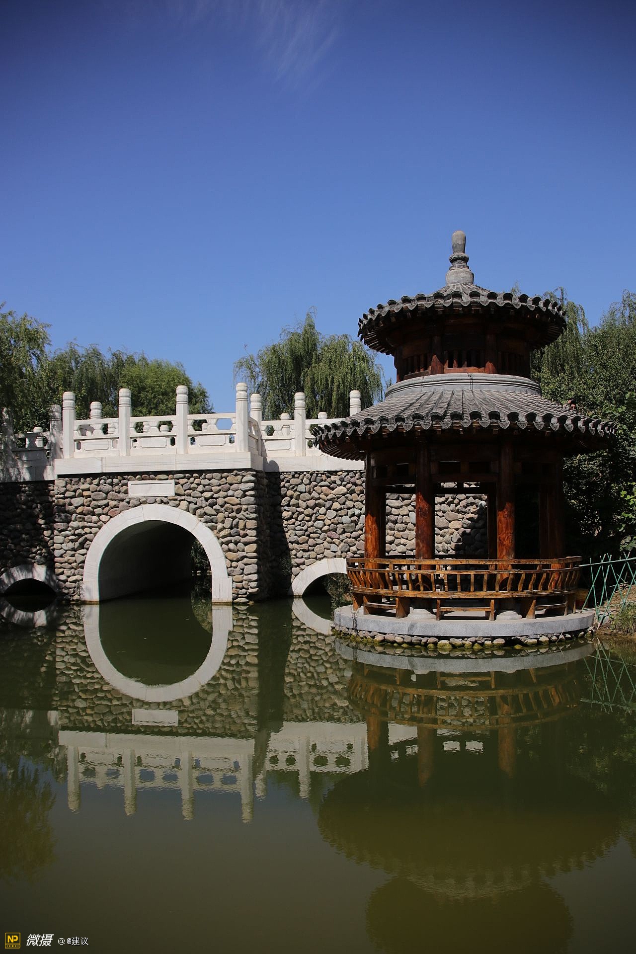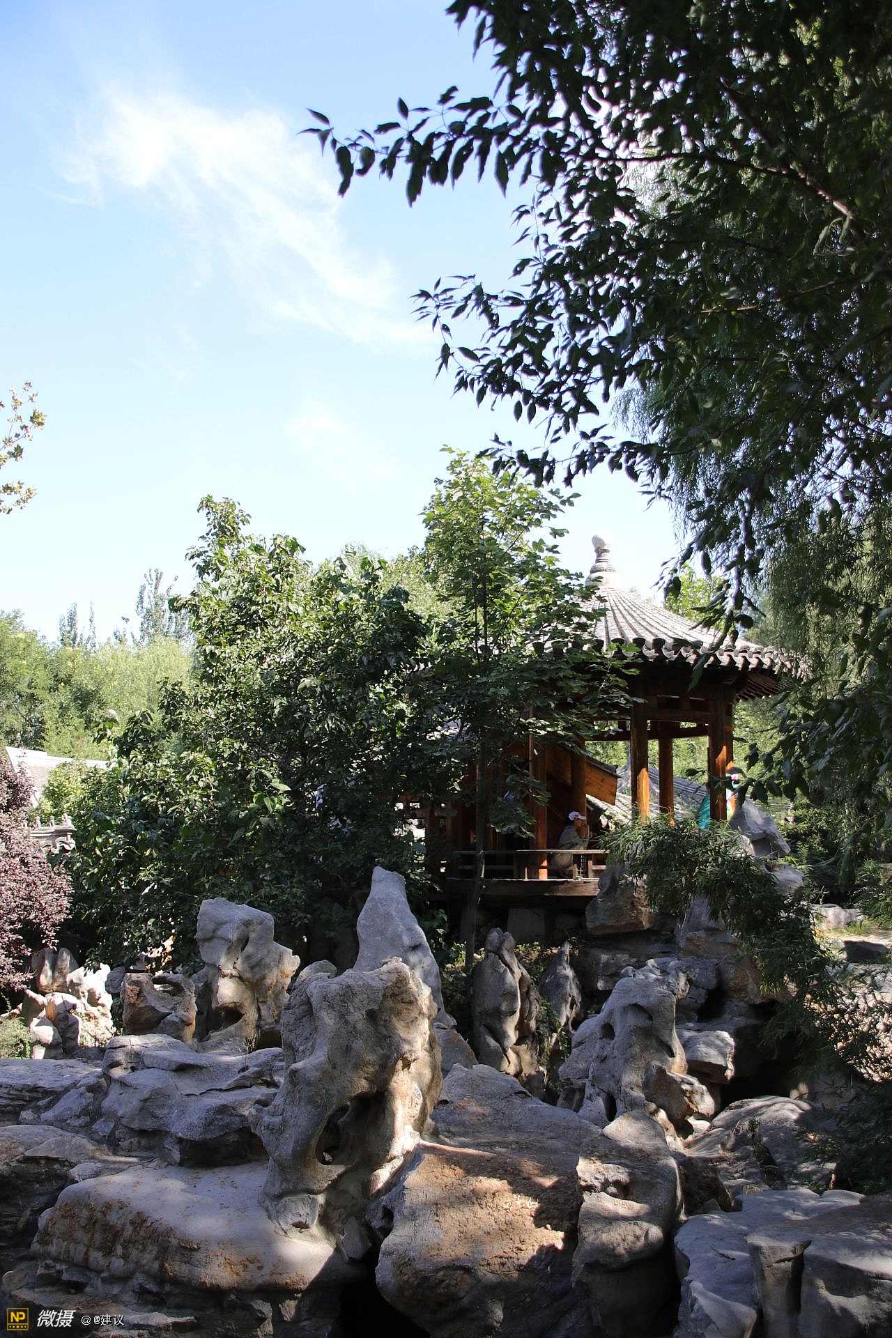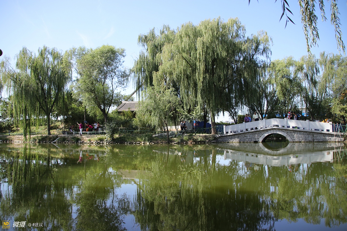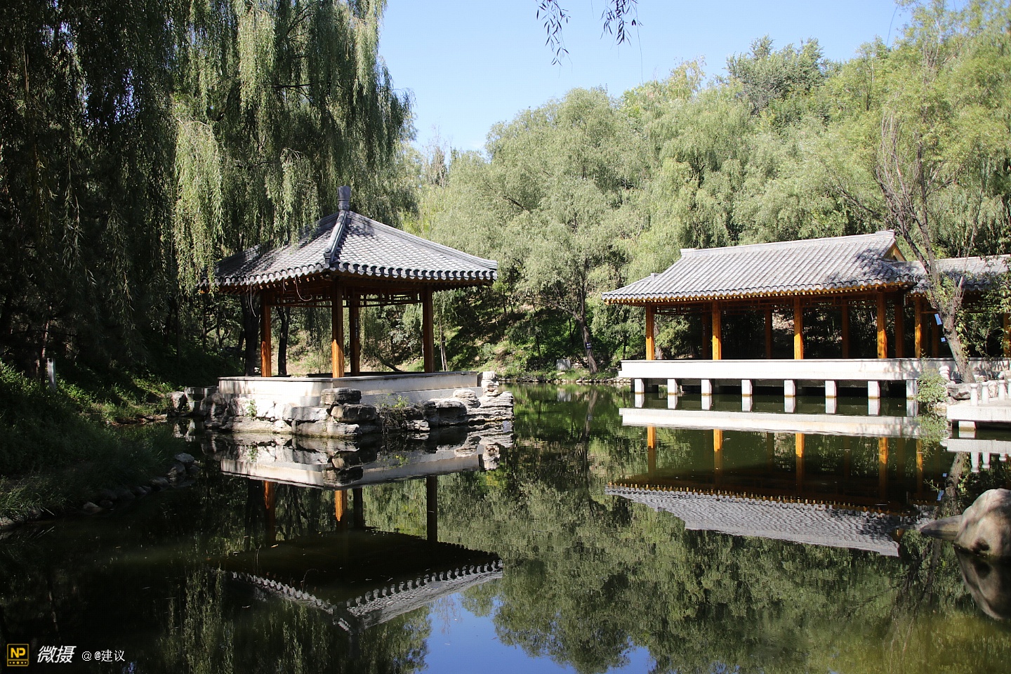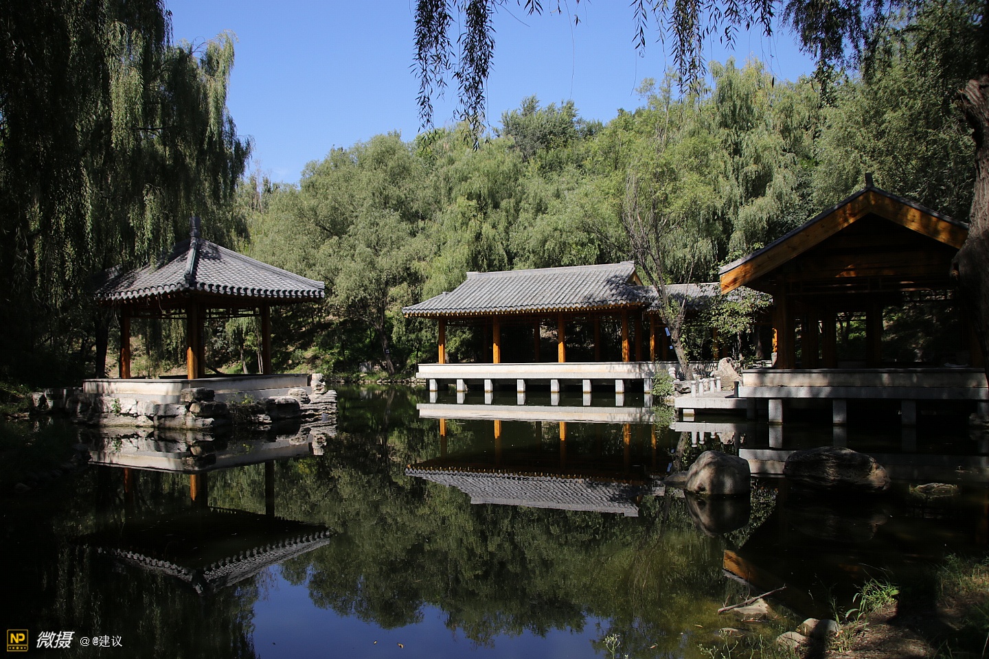 榆树庄公园,总规划面积768亩,水面40多亩。由清华大学建筑学院纪怀禄教授负责设计。分成四个区,分别为:湖泊景区、山岳景区、丘陵景区和平原景区。整个园林是以苏州园林为蓝图,在此基础上加上了隋唐建筑的精华,以木结构为主,不进行任何彩绘和油漆,呈现的是松木本身的色彩和花纹。