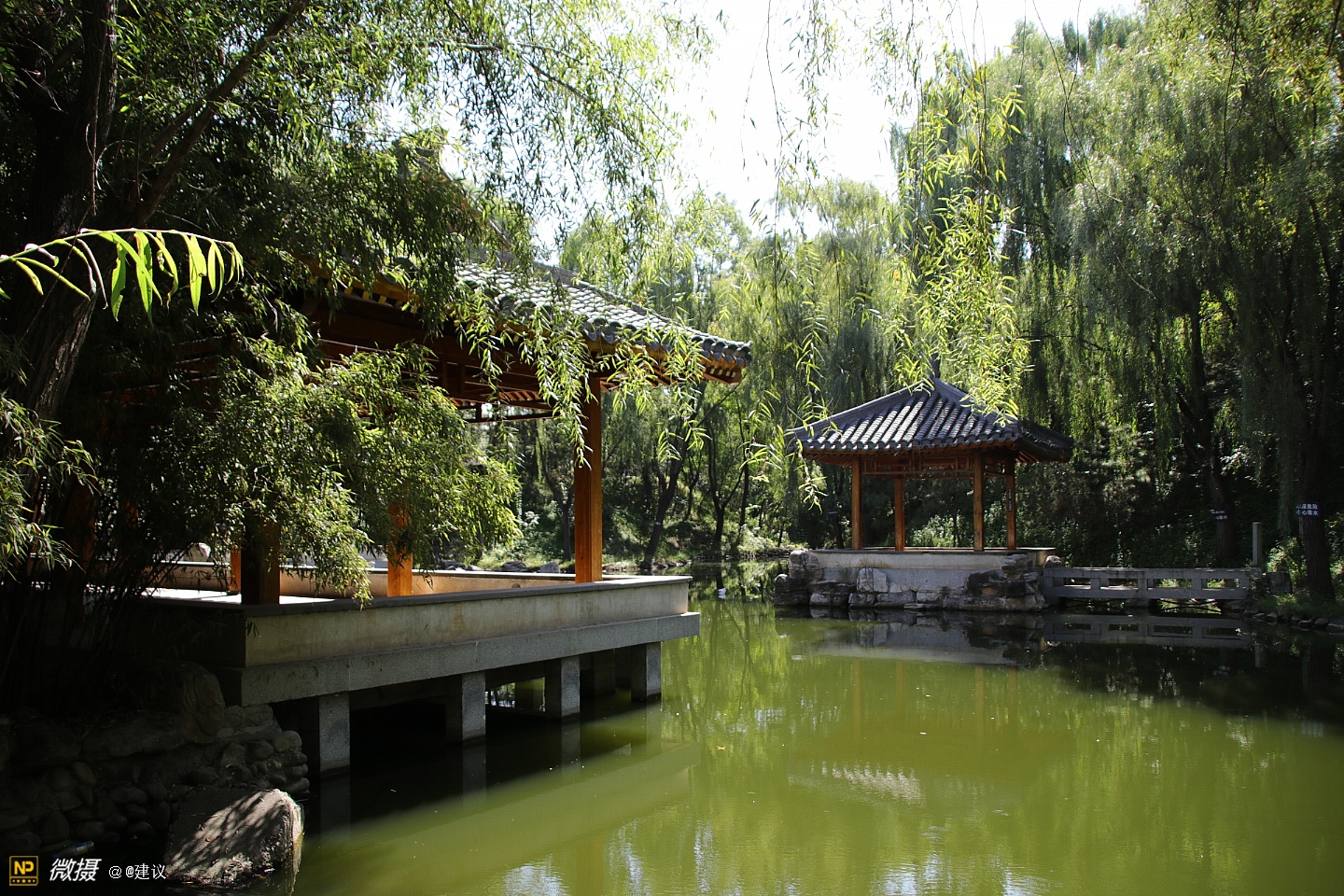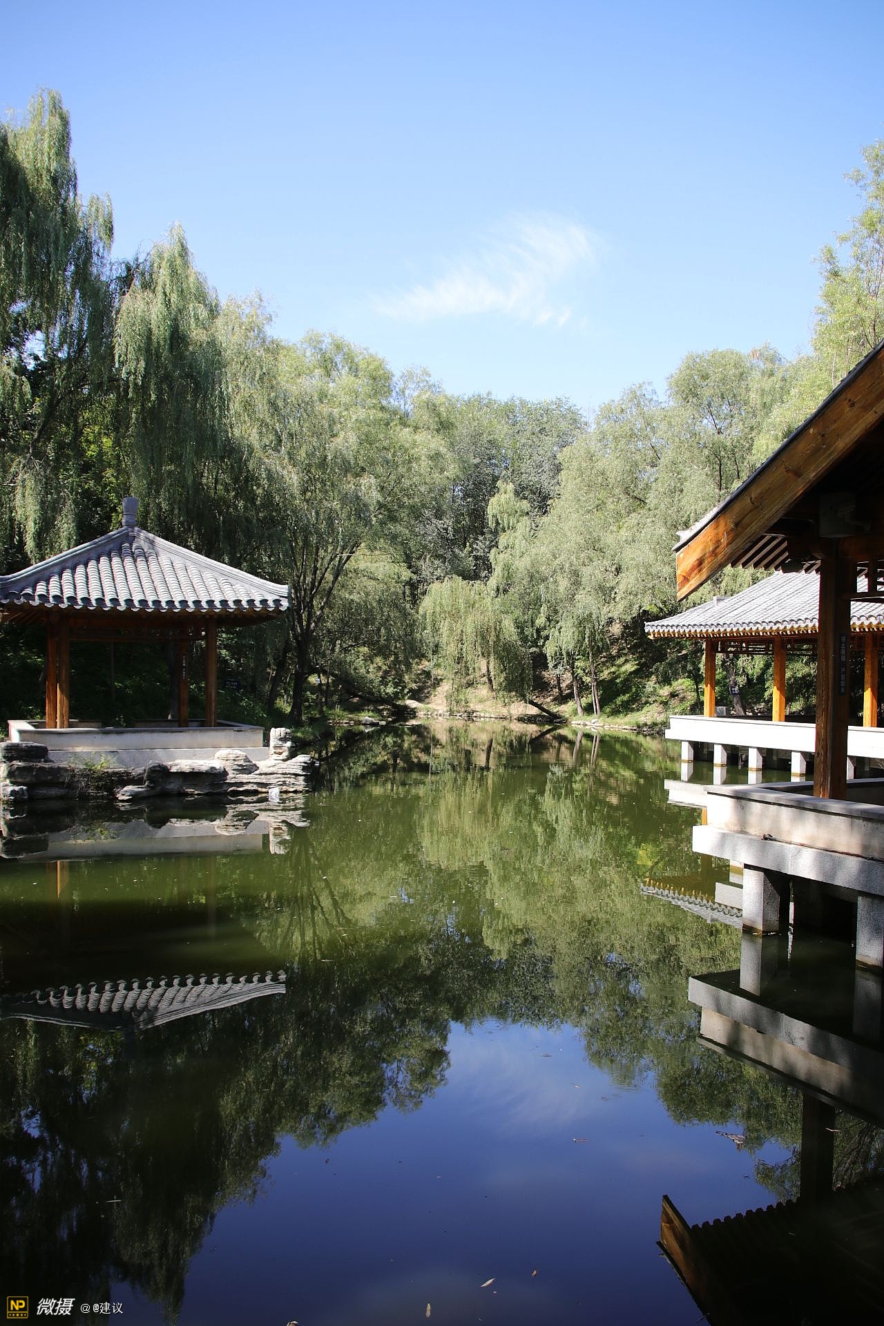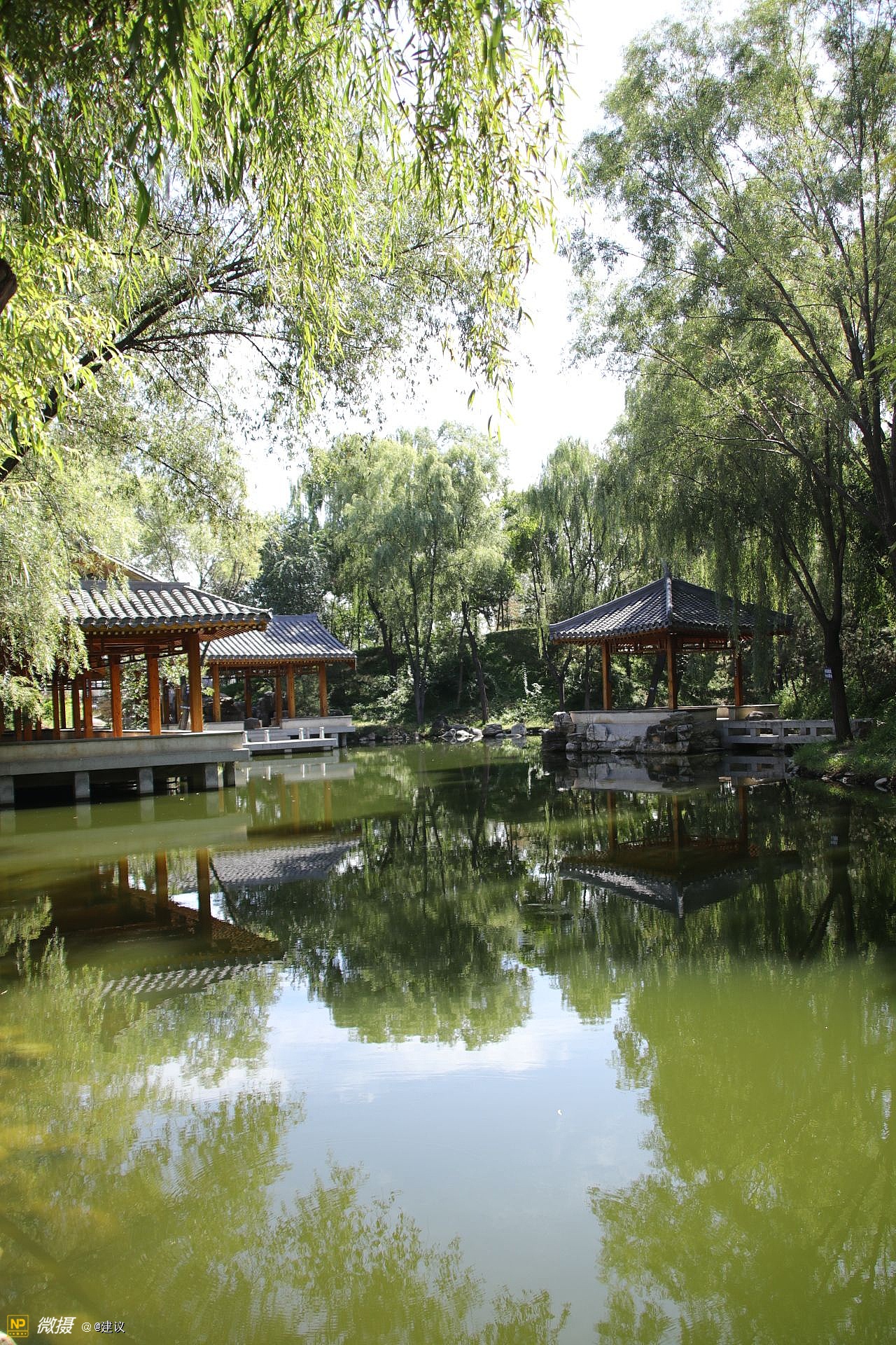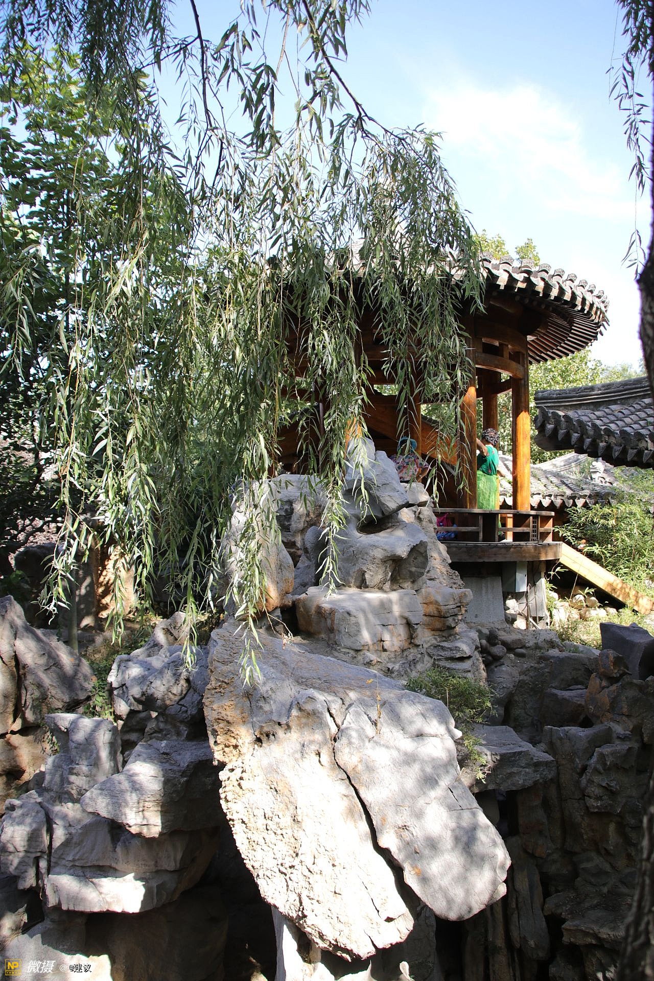 榆树庄公园,总规划面积768亩,水面40多亩。由清华大学建筑学院纪怀禄教授负责设计。分成四个区,分别为:湖泊景区、山岳景区、丘陵景区和平原景区。整个园林是以苏州园林为蓝图,在此基础上加上了隋唐建筑的精华,以木结构为主,不进行任何彩绘和油漆,呈现的是松木本身的色彩和花纹。