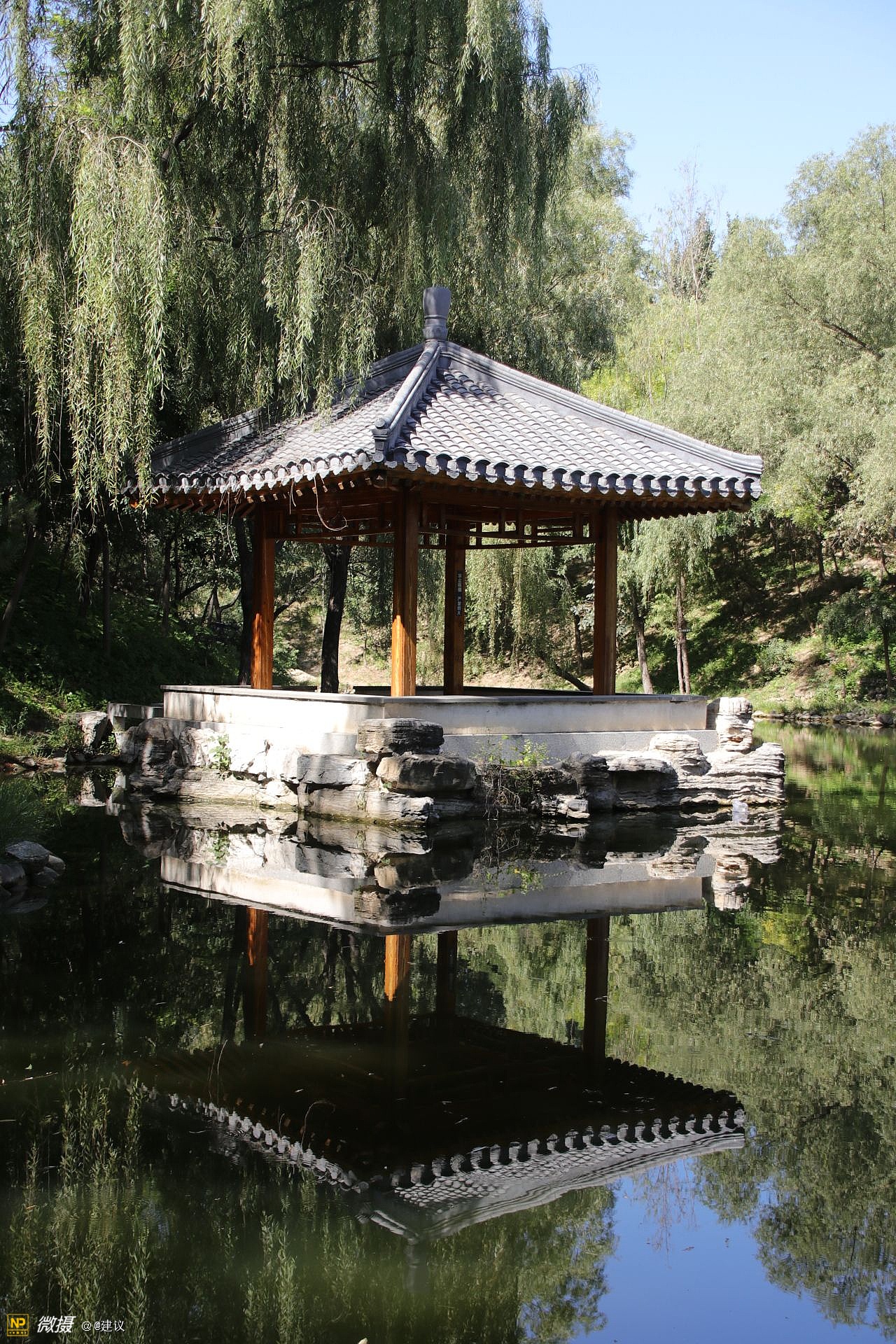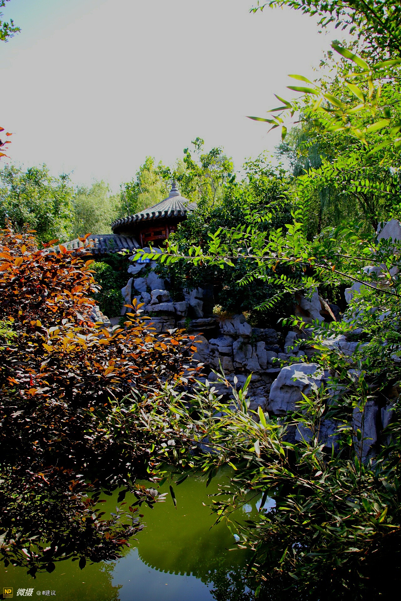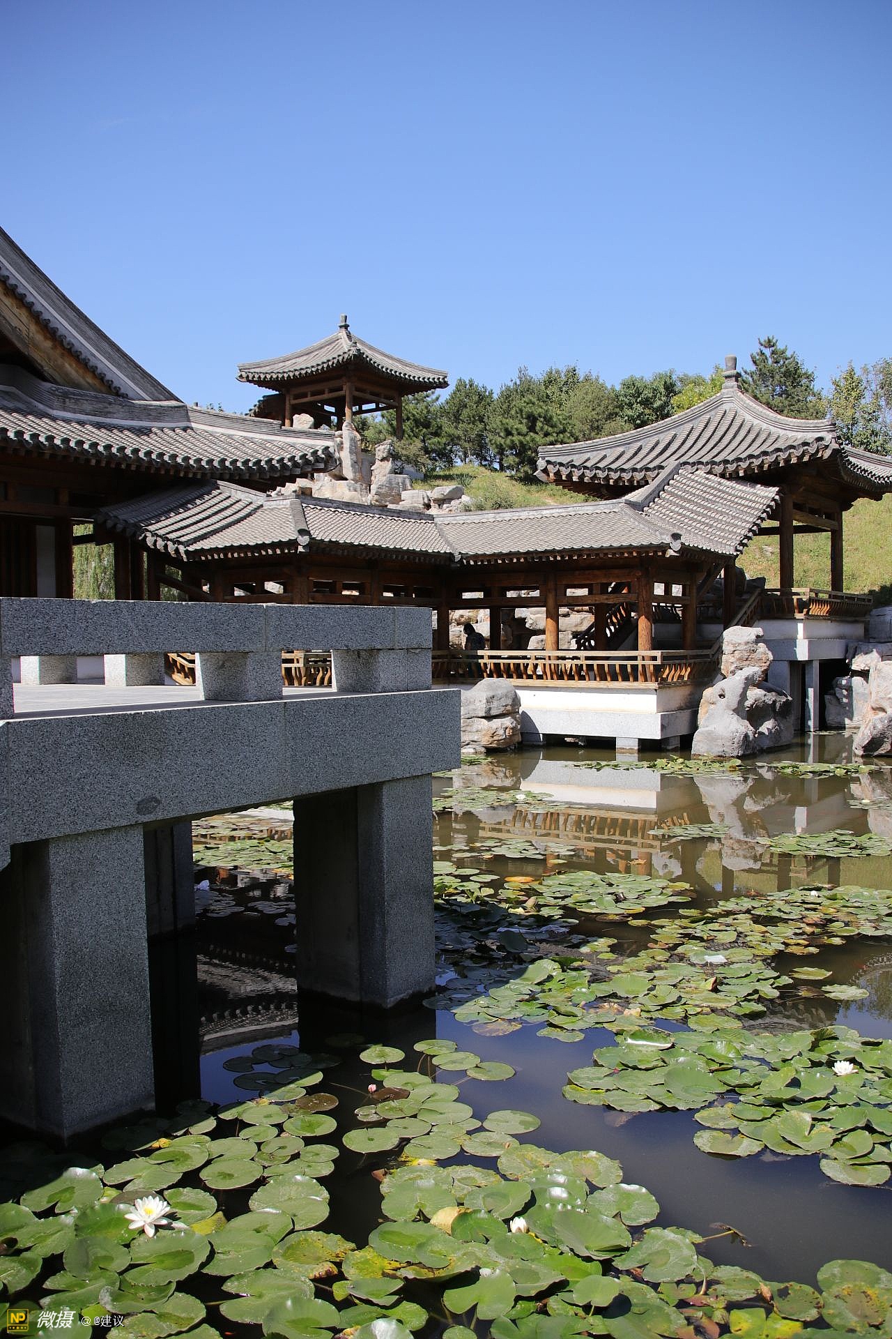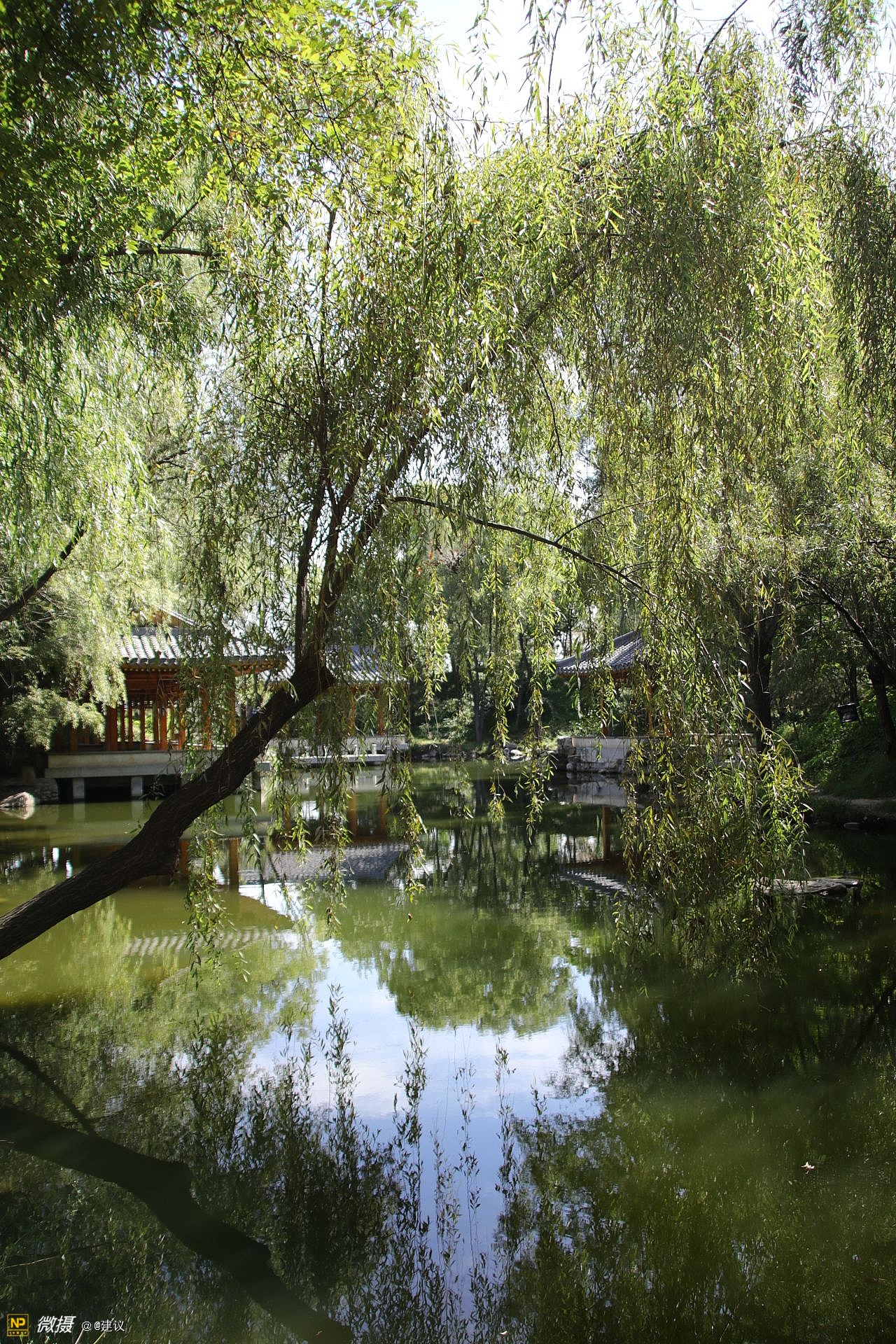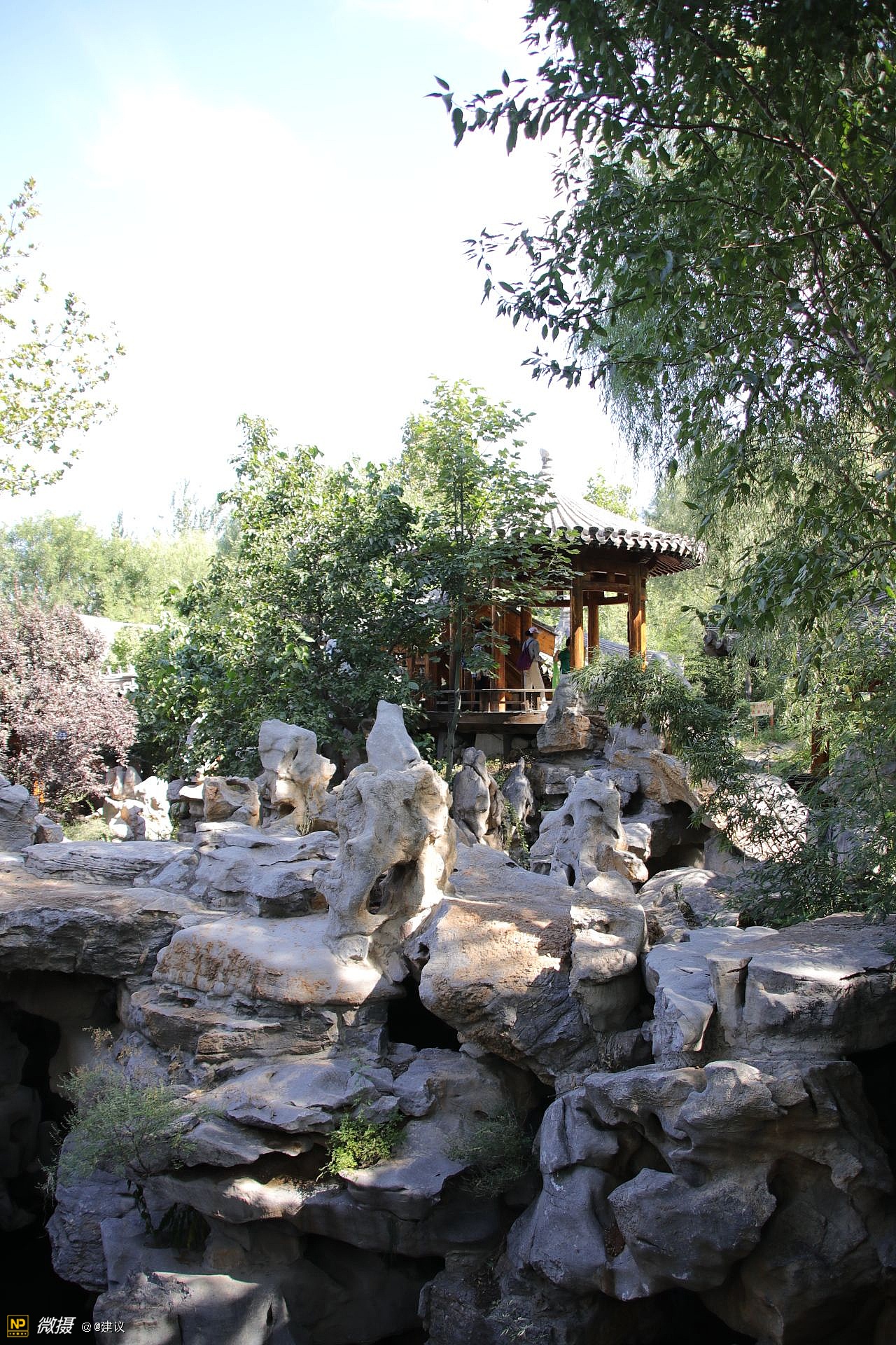 榆树庄公园,总规划面积768亩,水面40多亩。由清华大学建筑学院纪怀禄教授负责设计。分成四个区,分别为:湖泊景区、山岳景区、丘陵景区和平原景区。整个园林是以苏州园林为蓝图,在此基础上加上了隋唐建筑的精华,以木结构为主,不进行任何彩绘和油漆,呈现的是松木本身的色彩和花纹。