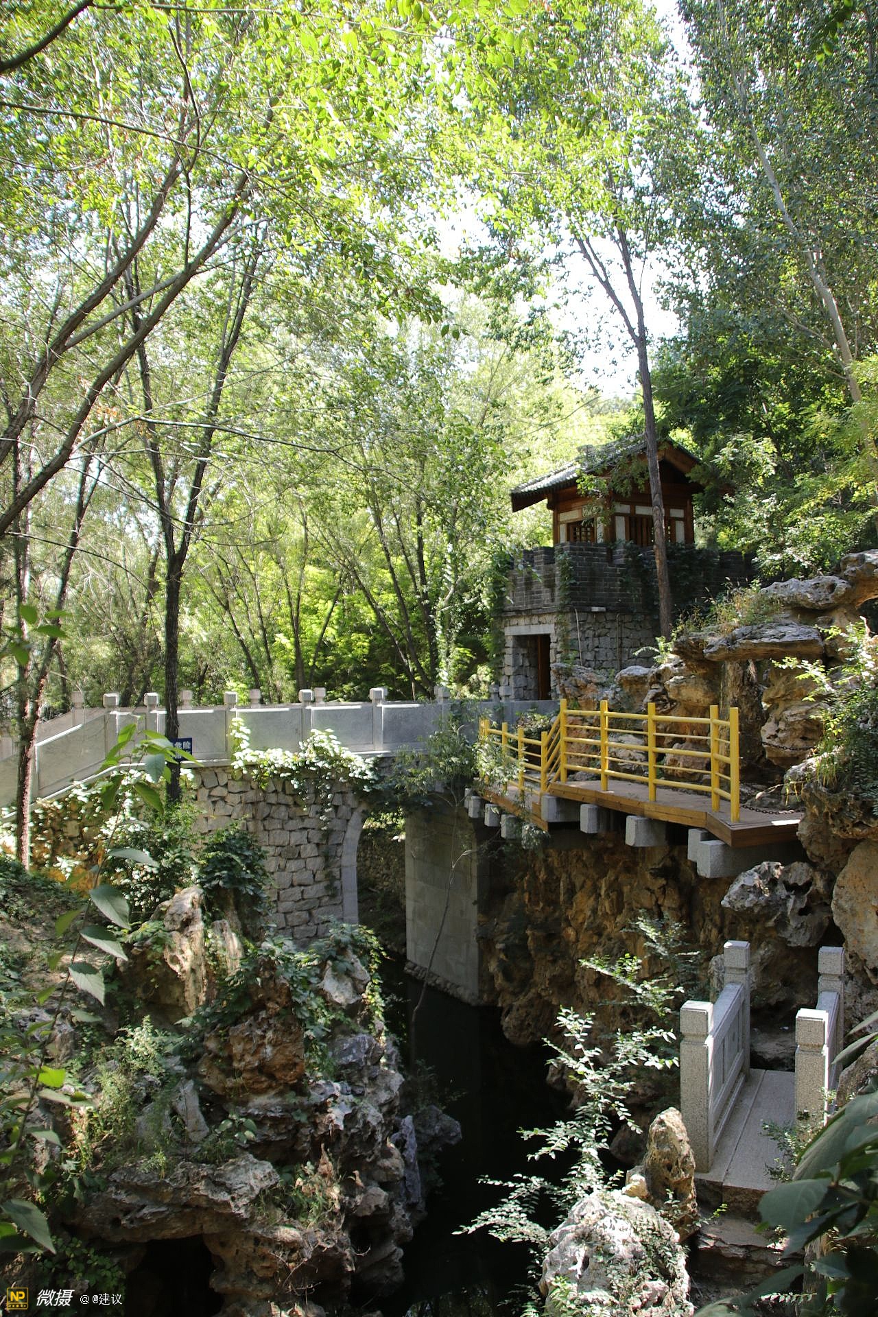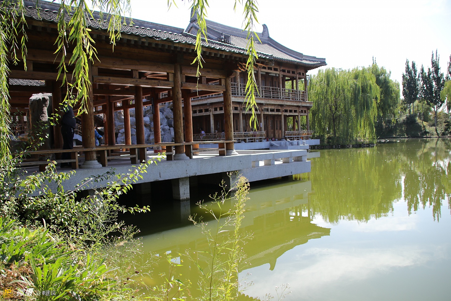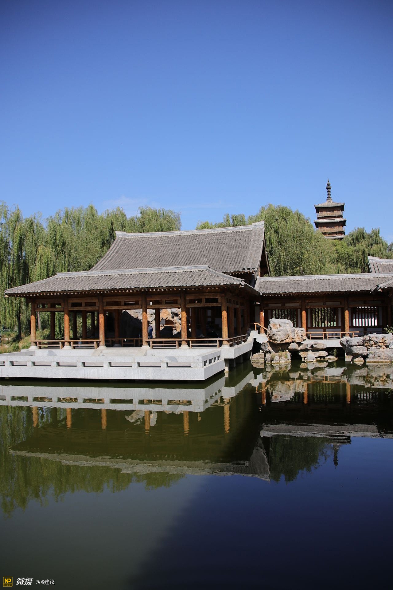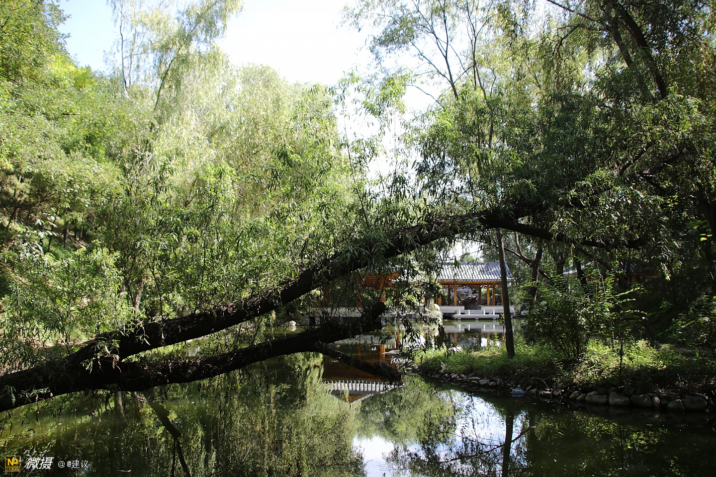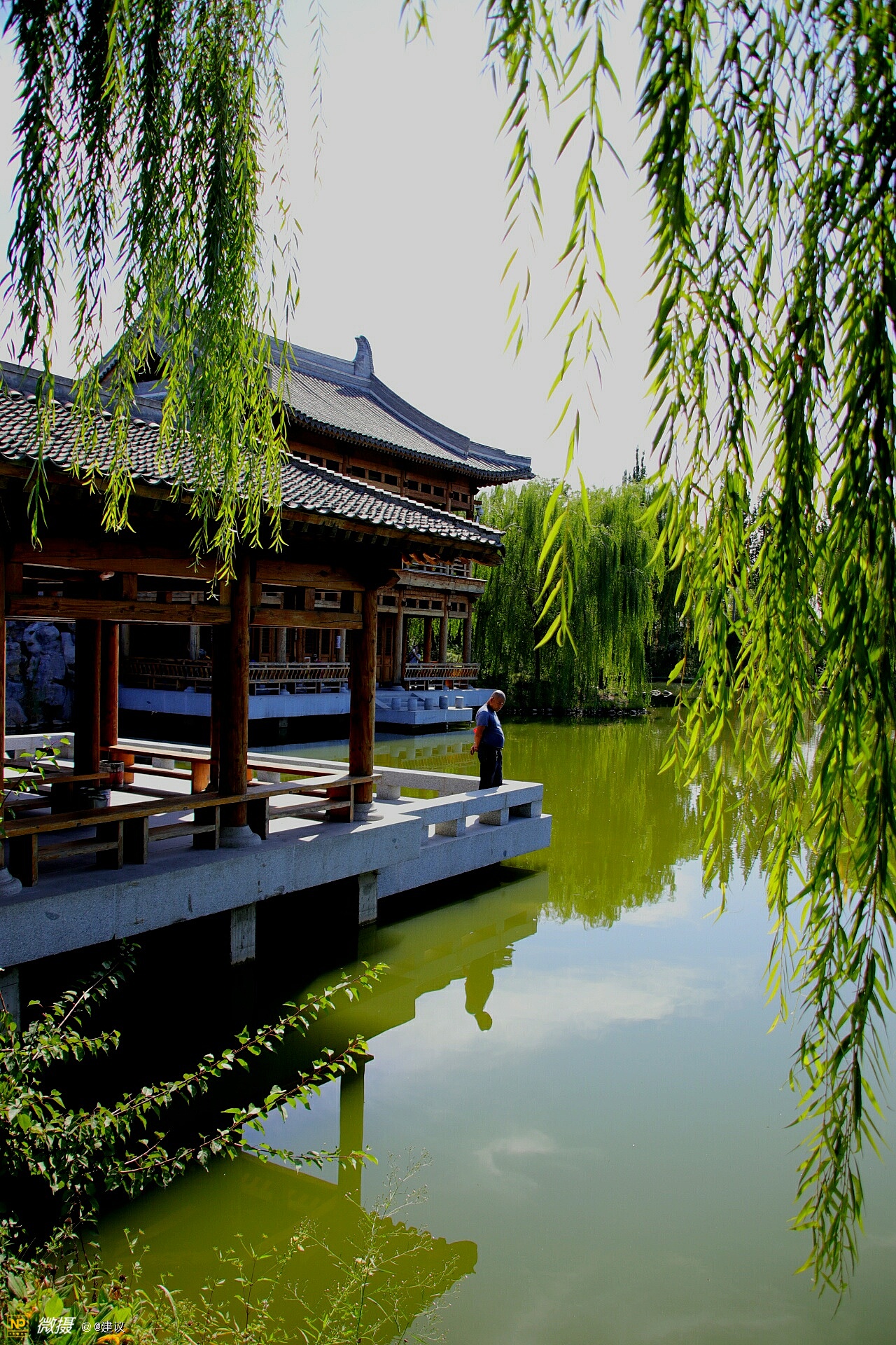 榆树庄公园,总规划面积768亩,水面40多亩。由清华大学建筑学院纪怀禄教授负责设计。分成四个区,分别为:湖泊景区、山岳景区、丘陵景区和平原景区。整个园林是以苏州园林为蓝图,在此基础上加上了隋唐建筑的精华,以木结构为主,不进行任何彩绘和油漆,呈现的是松木本身的色彩和花纹。
