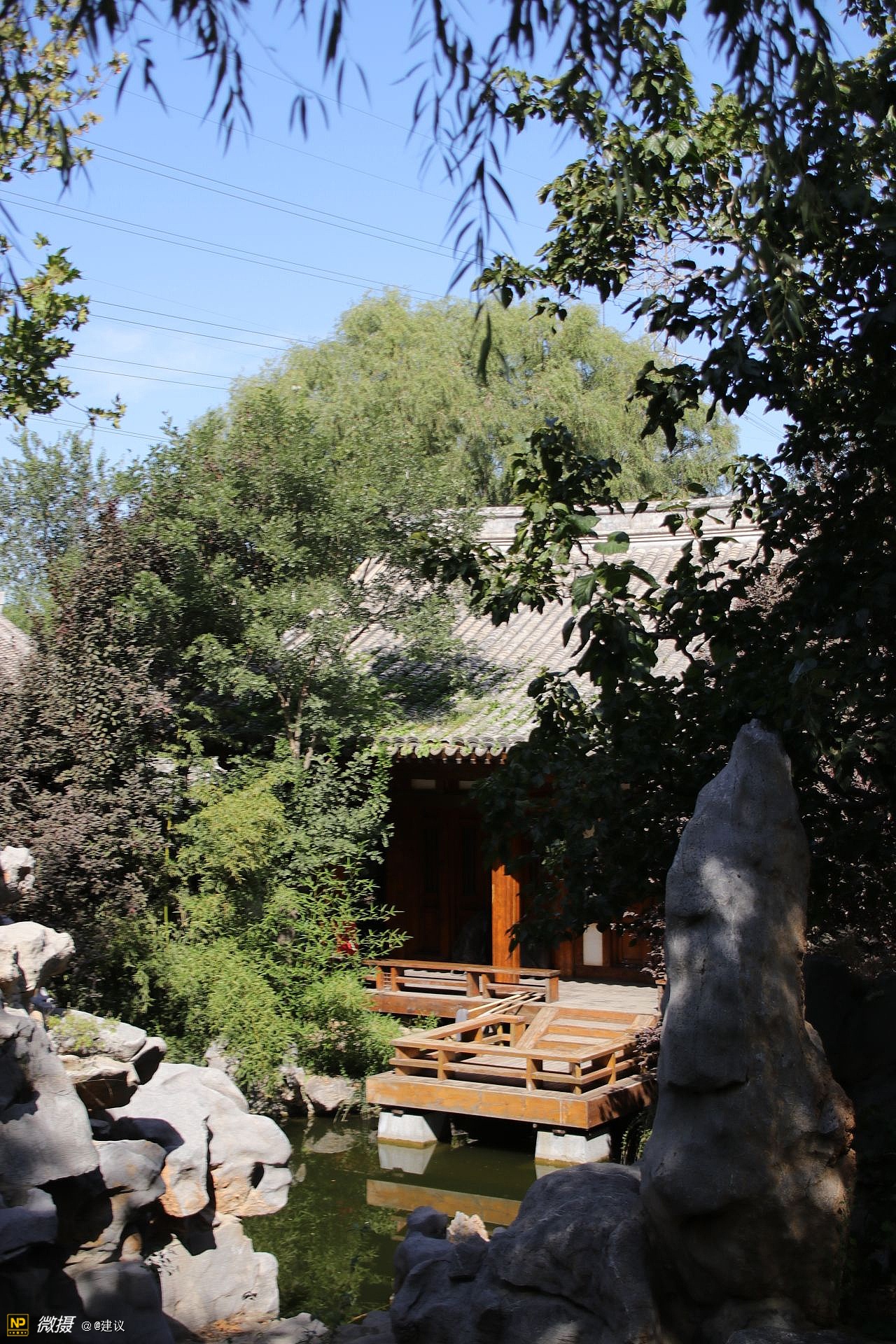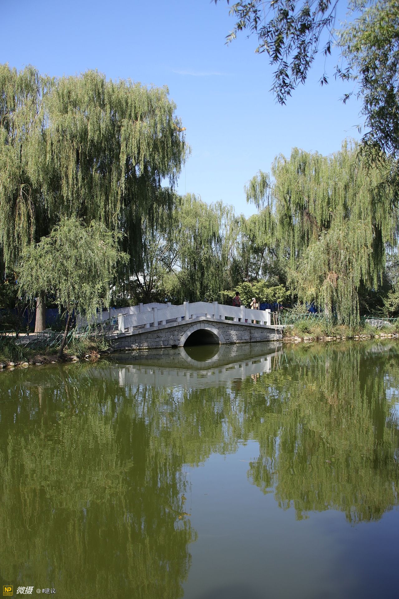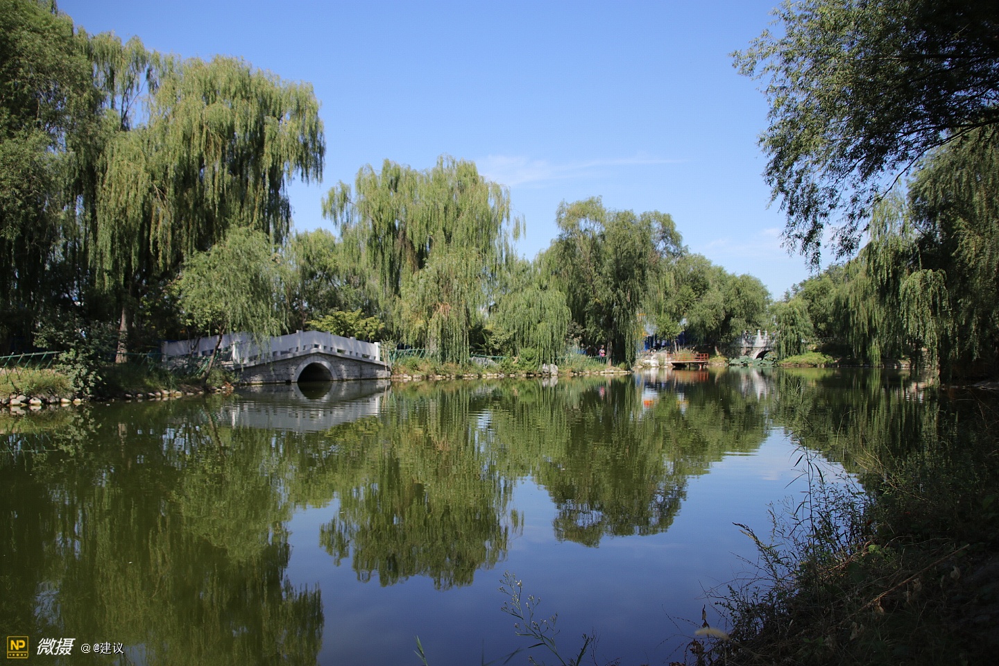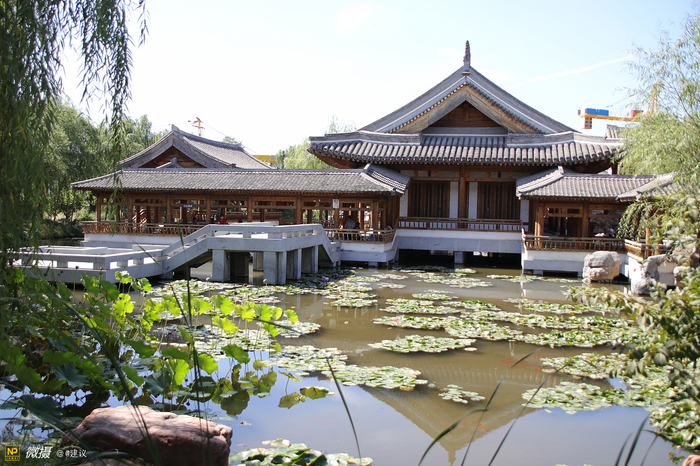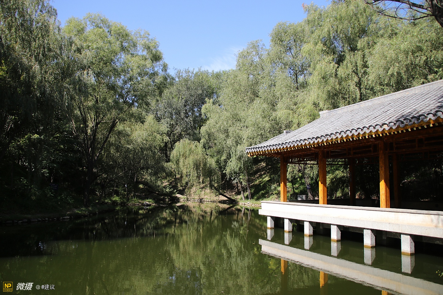 榆树庄公园,总规划面积768亩,水面40多亩。由清华大学建筑学院纪怀禄教授负责设计。分成四个区,分别为:湖泊景区、山岳景区、丘陵景区和平原景区。整个园林是以苏州园林为蓝图,在此基础上加上了隋唐建筑的精华,以木结构为主,不进行任何彩绘和油漆,呈现的是松木本身的色彩和花纹。