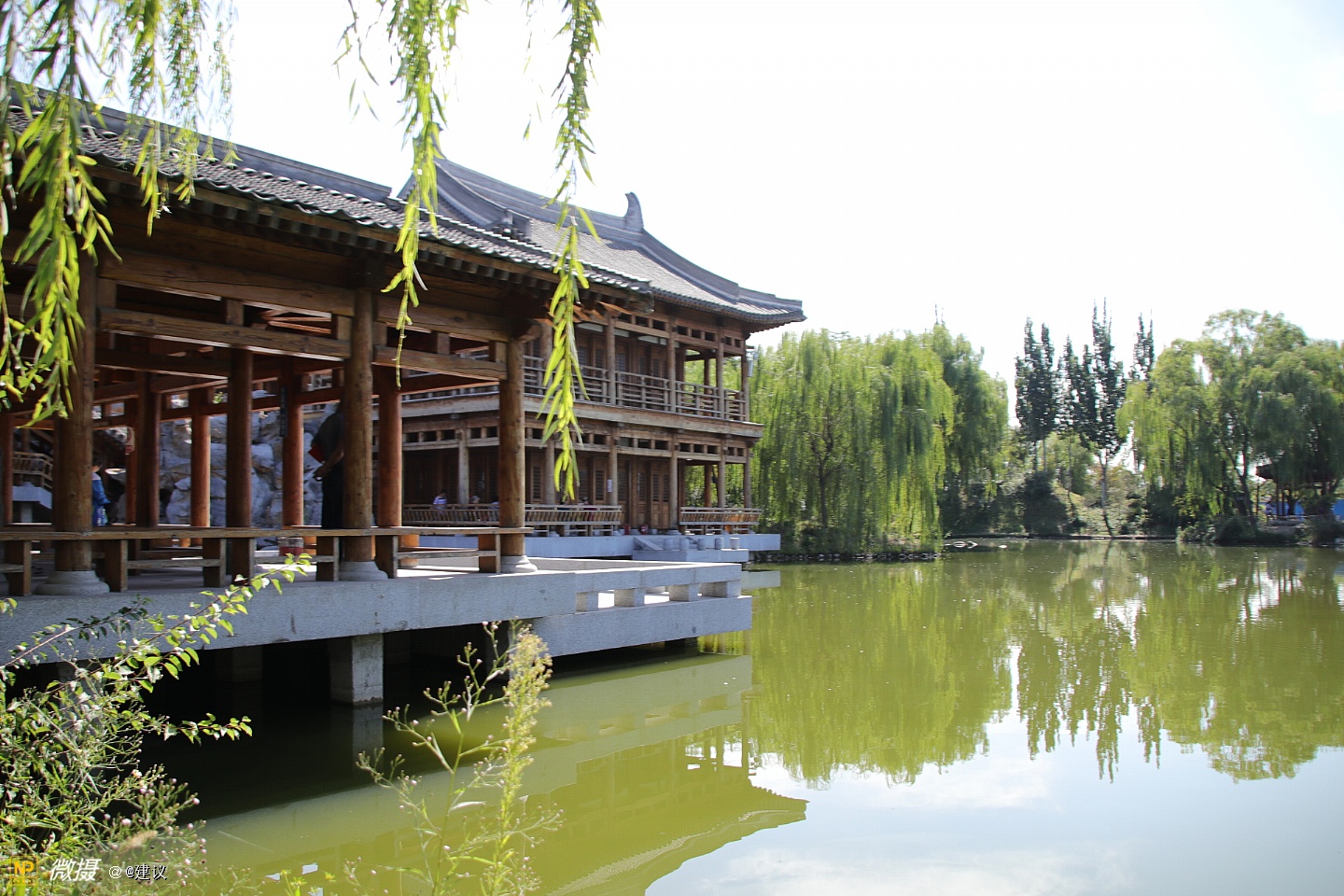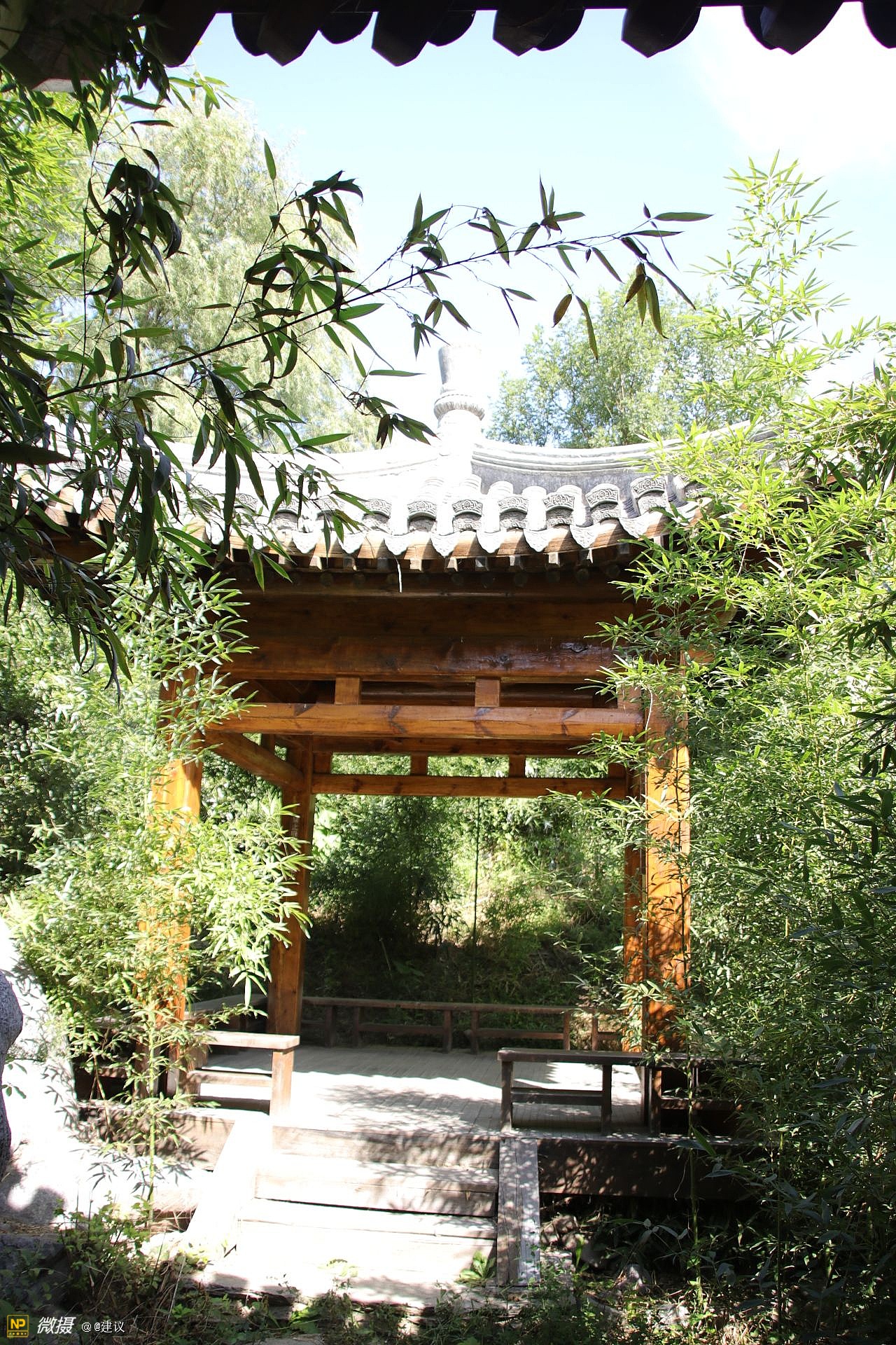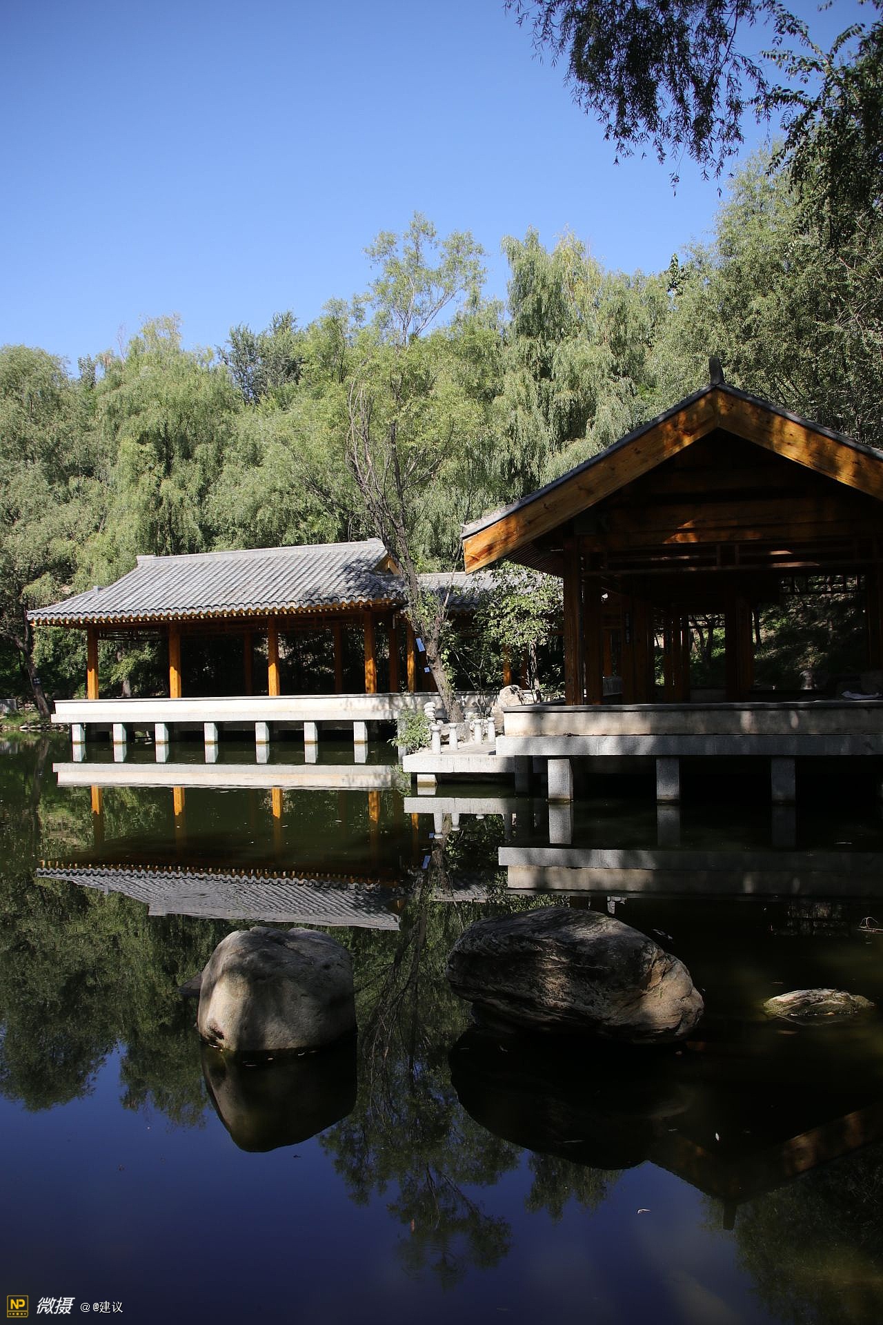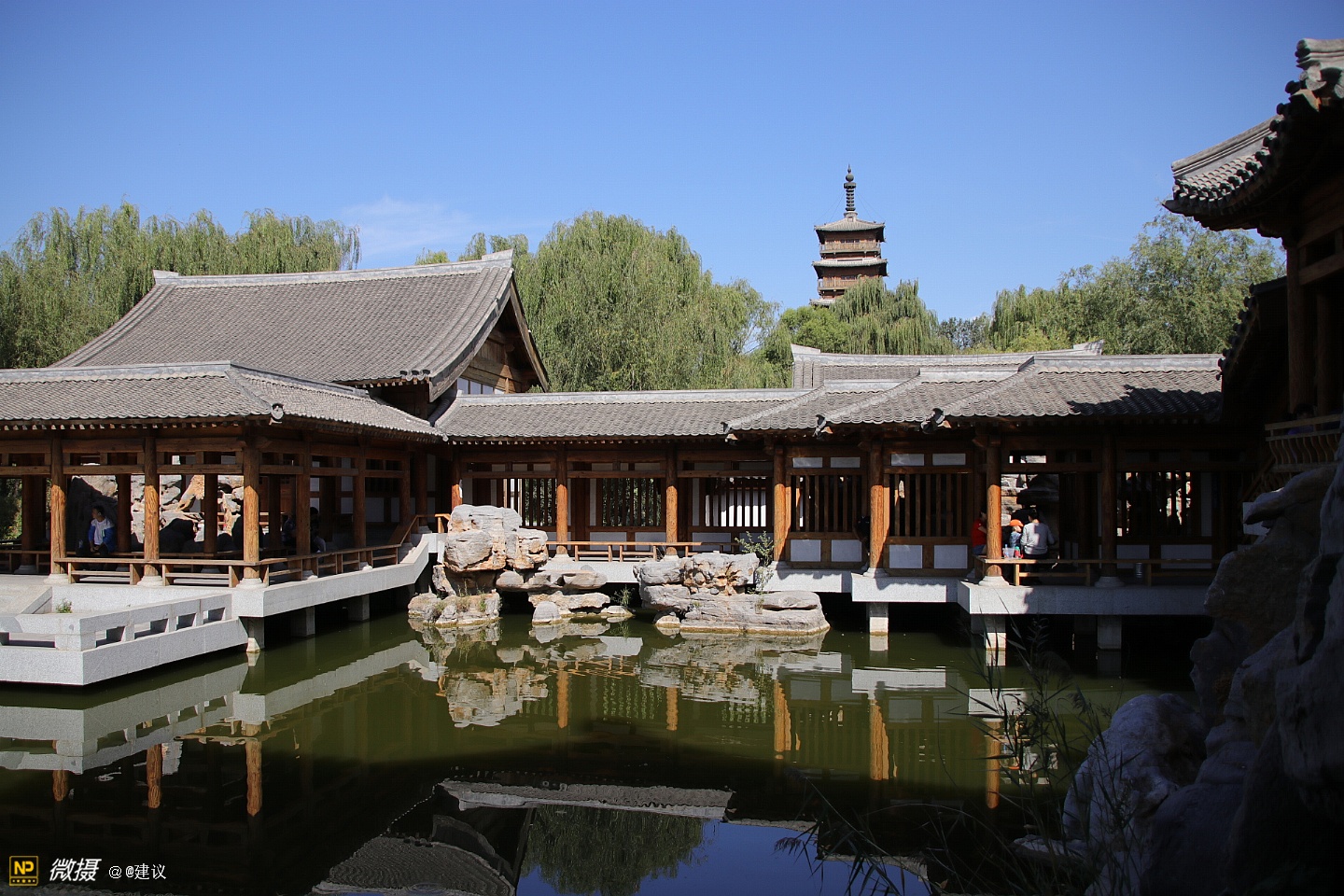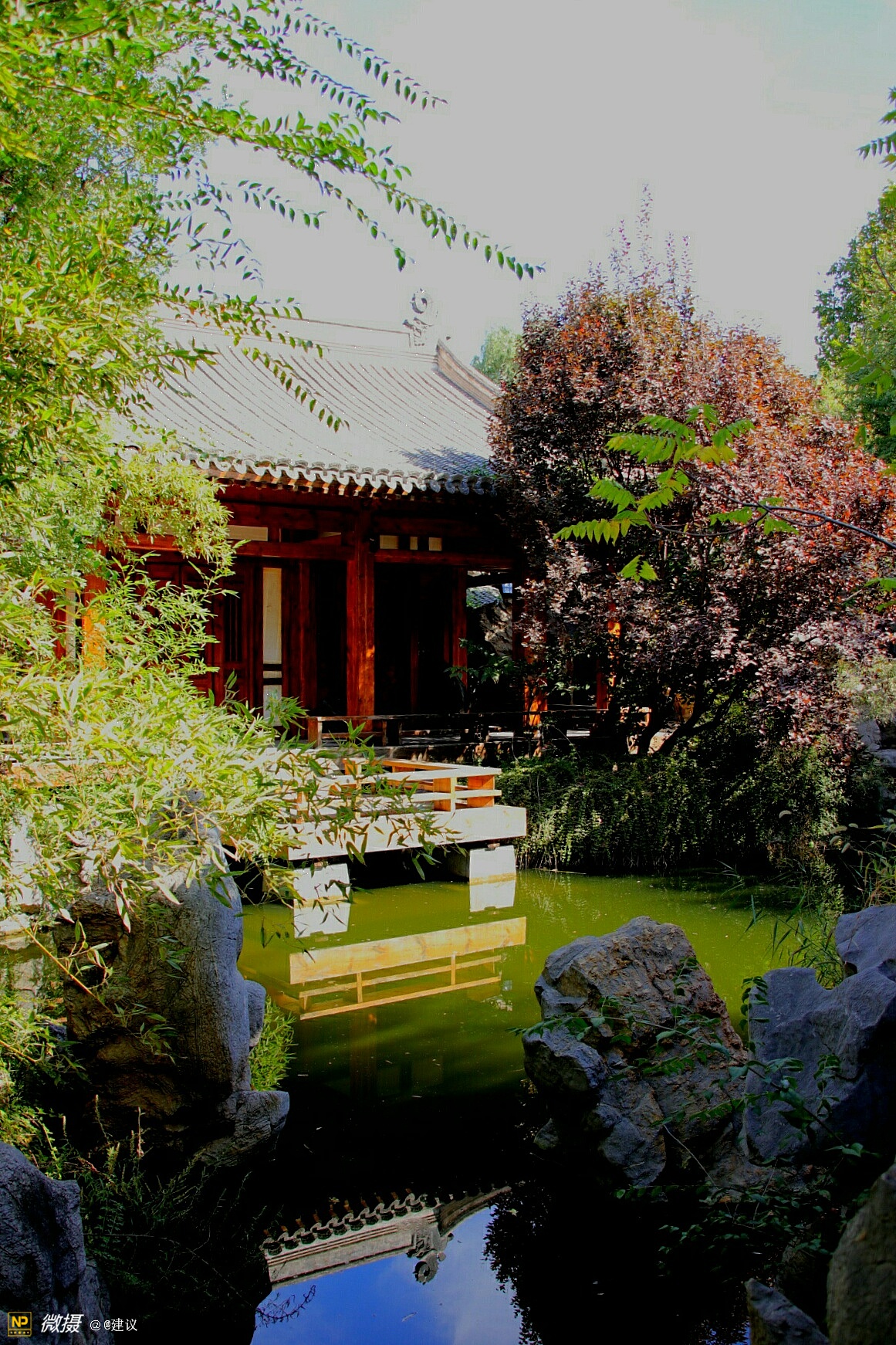 榆树庄公园,总规划面积768亩,水面40多亩。由清华大学建筑学院纪怀禄教授负责设计。分成四个区,分别为:湖泊景区、山岳景区、丘陵景区和平原景区。整个园林是以苏州园林为蓝图,在此基础上加上了隋唐建筑的精华,以木结构为主,不进行任何彩绘和油漆,呈现的是松木本身的色彩和花纹。