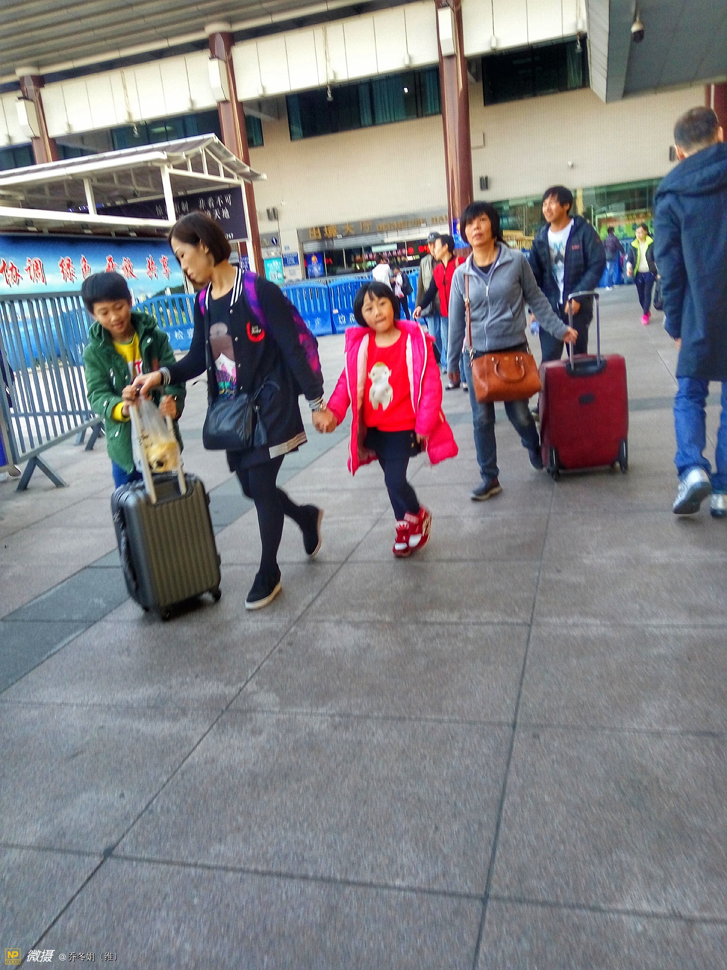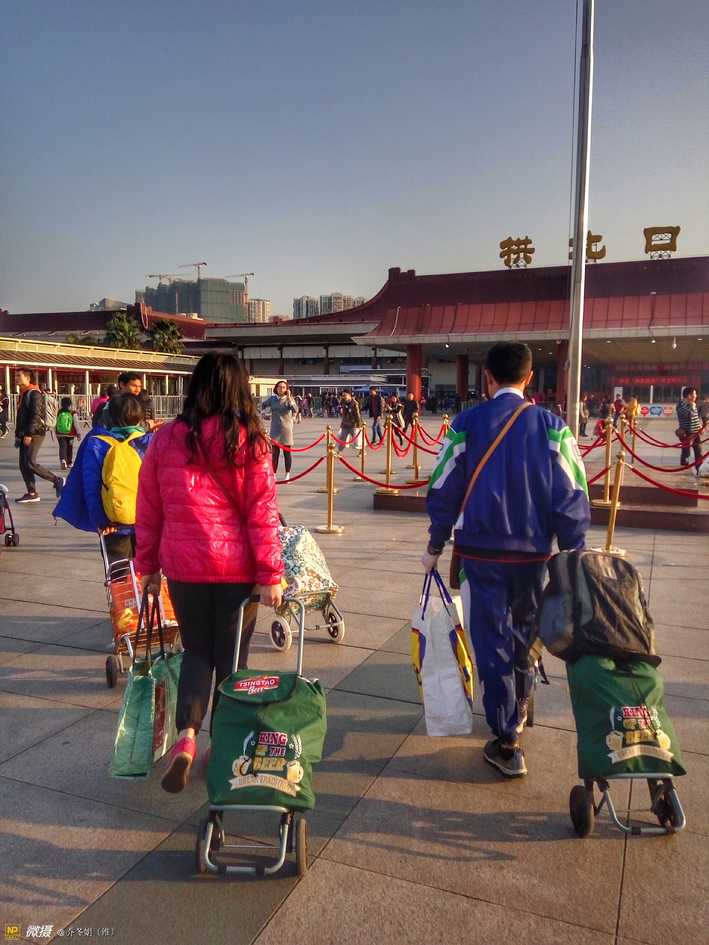 人们拖儿带女、大包小裹的,脸上满是喜悦和幸福……
