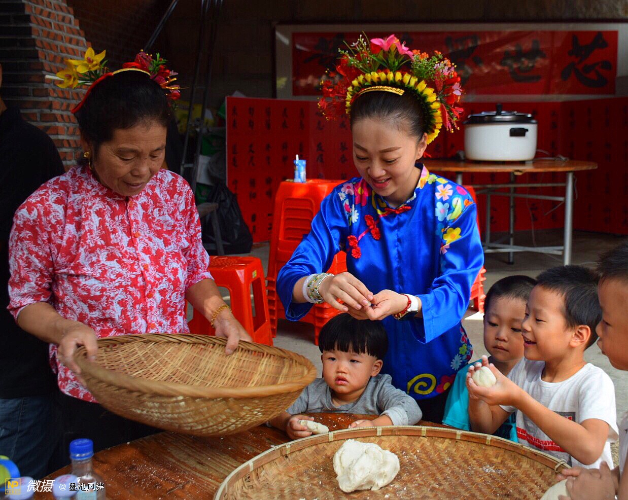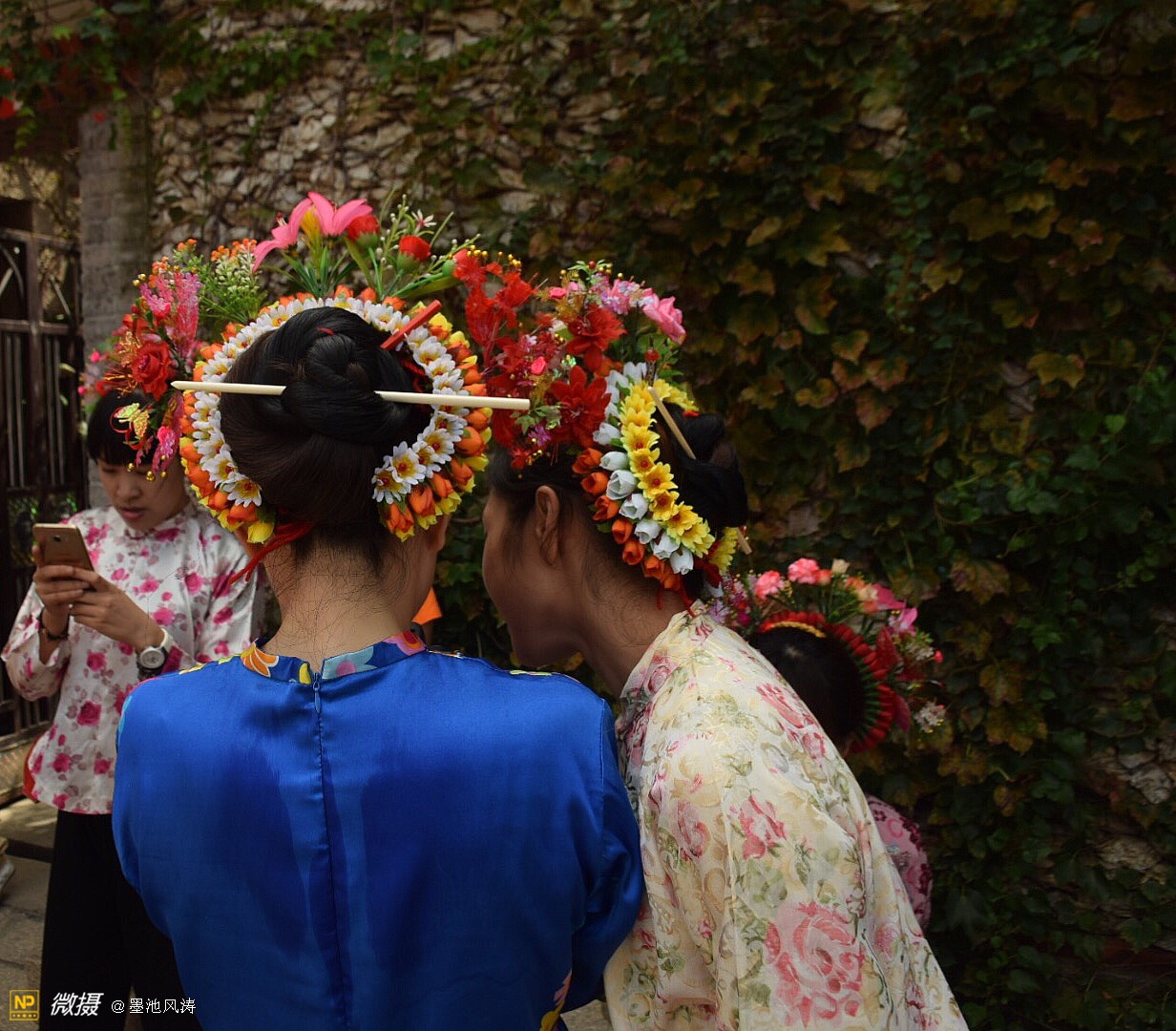 蟳埔女头饰俗称“簪花围”,将秀发盘于脑后,系上红头绳,梳成圆髻,然后再穿上一支“骨髻”,打扮得犹如一座春意盎然的小花坛。