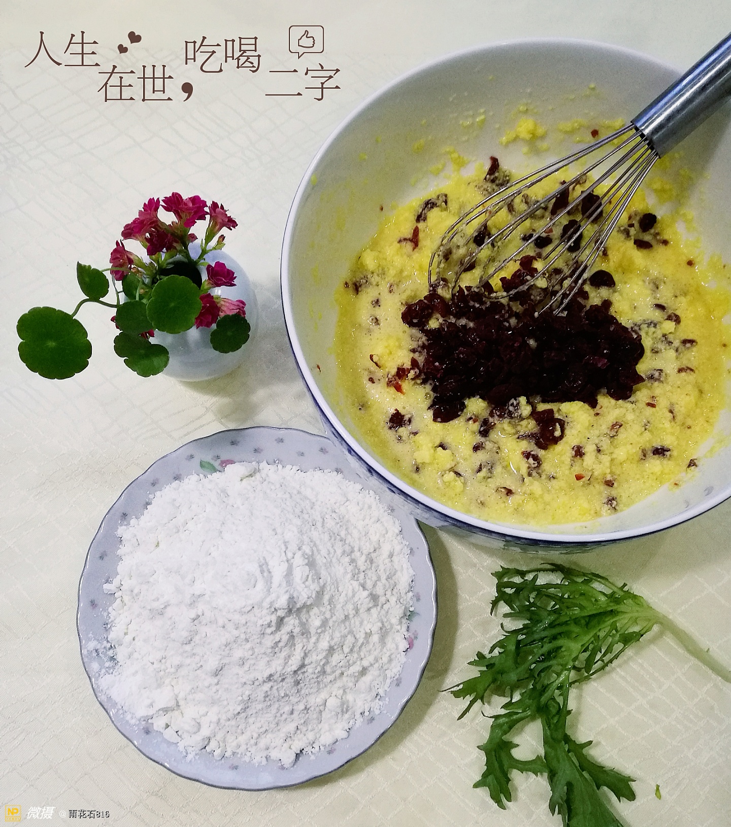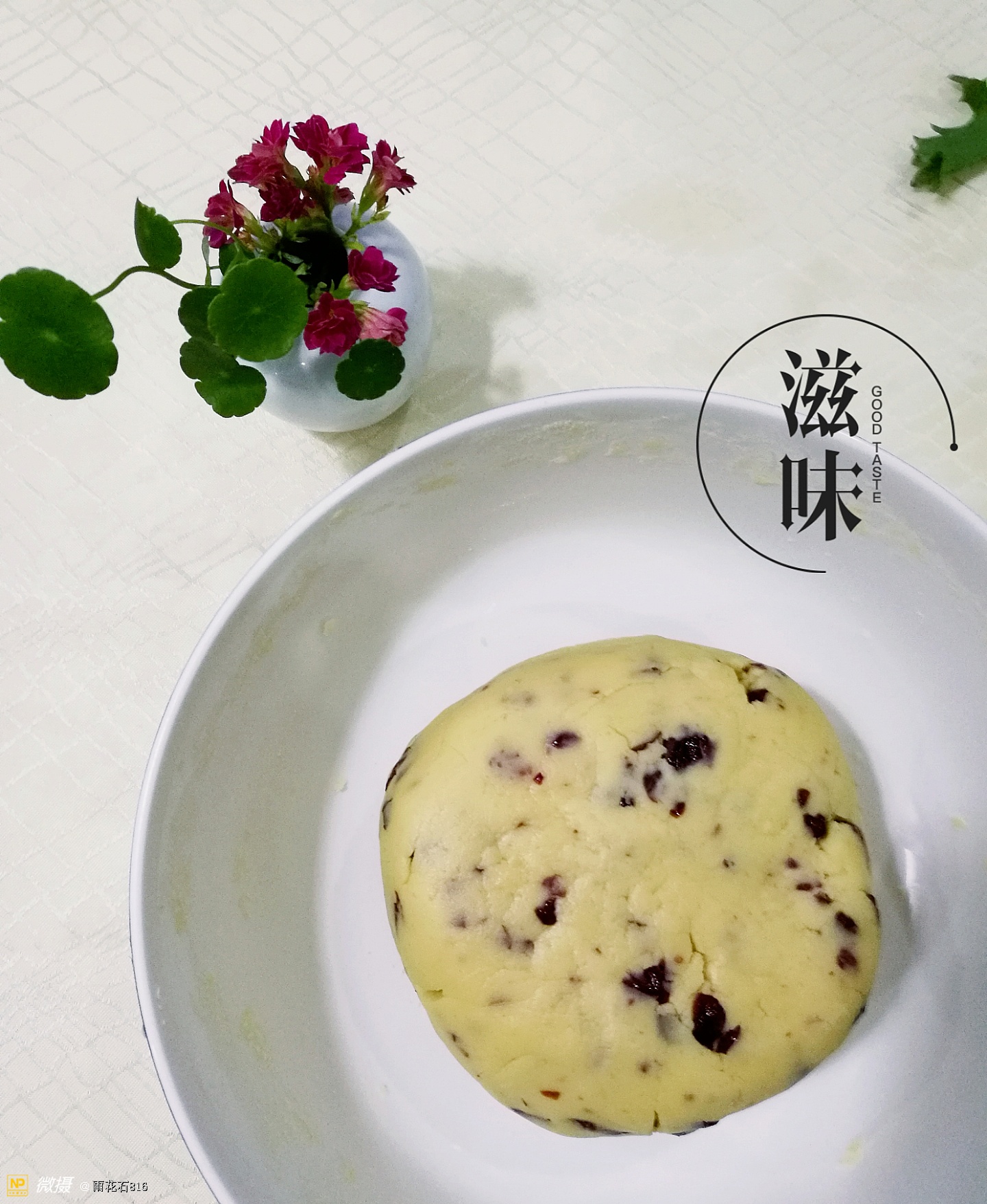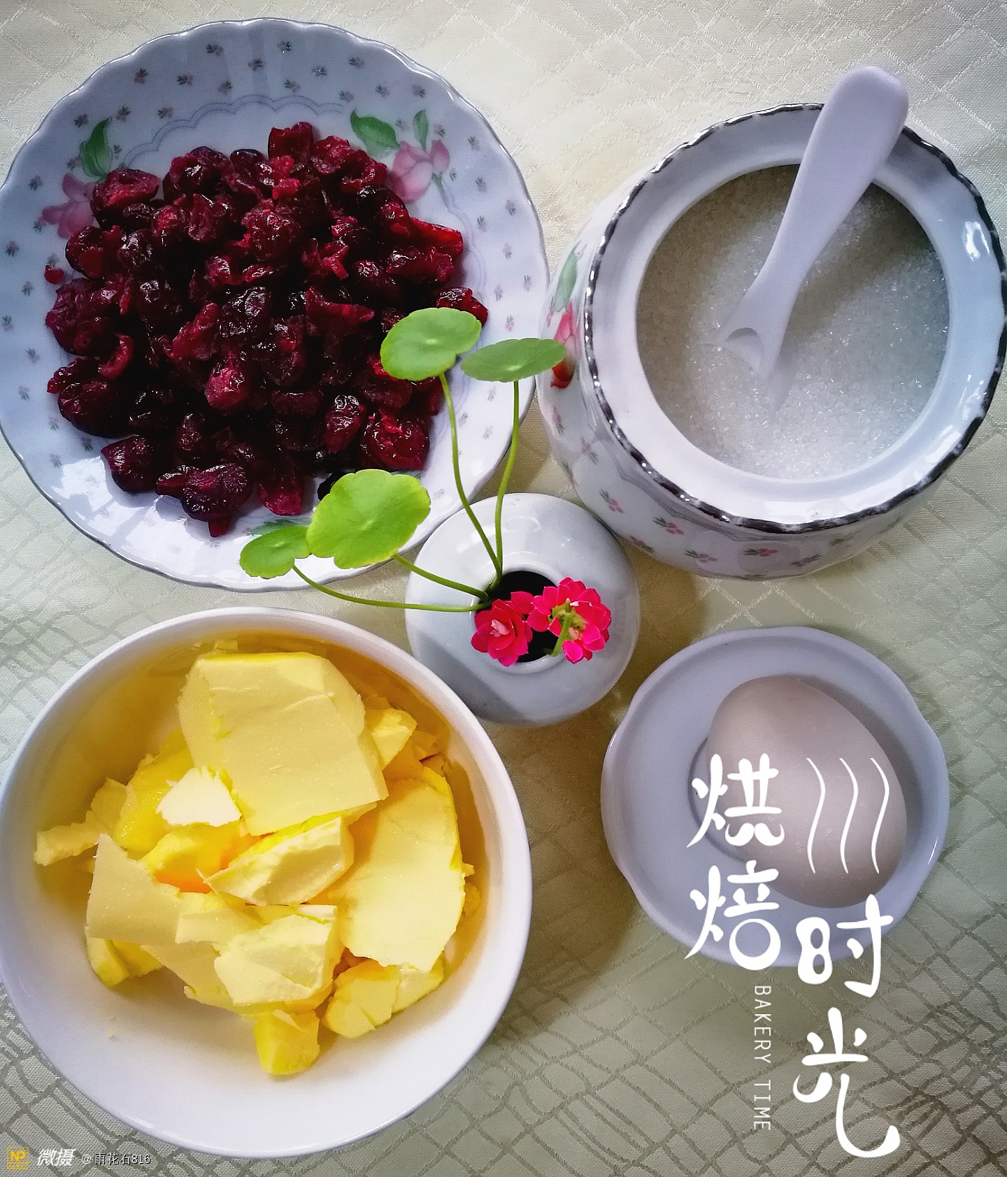 原料低粉115克、全蛋液1大勺(15ML)、黄油75克、糖粉60克、蔓越莓干35克。