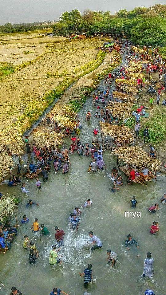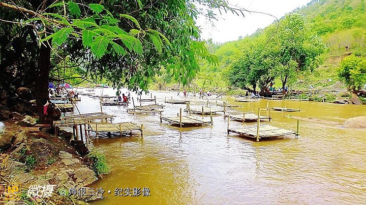 这是我们寨子,看看全寨子人热得都来玩水了。
