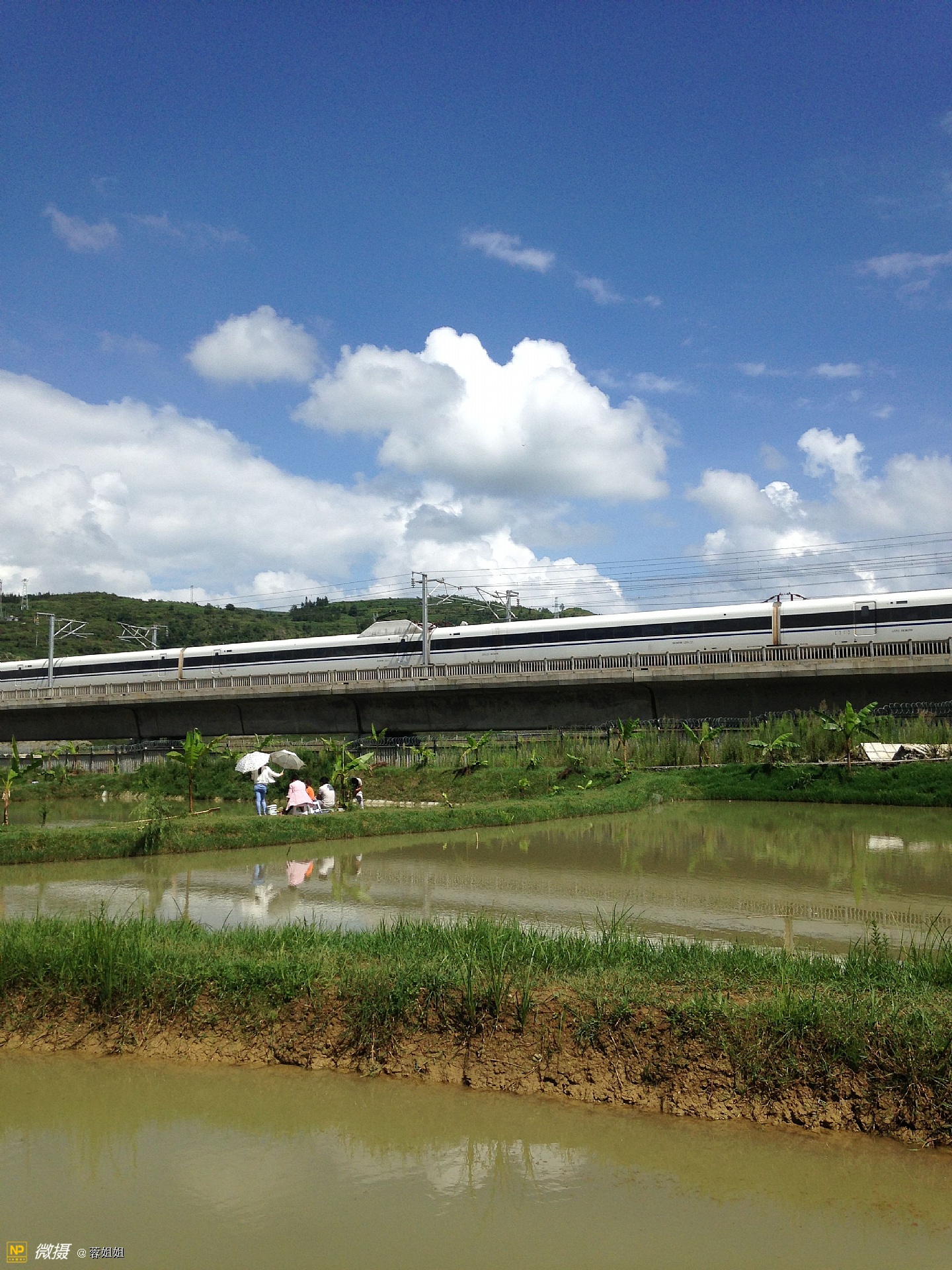 呼啸而过的高铁列车、蓝天白云,构成一幅美丽的画面。