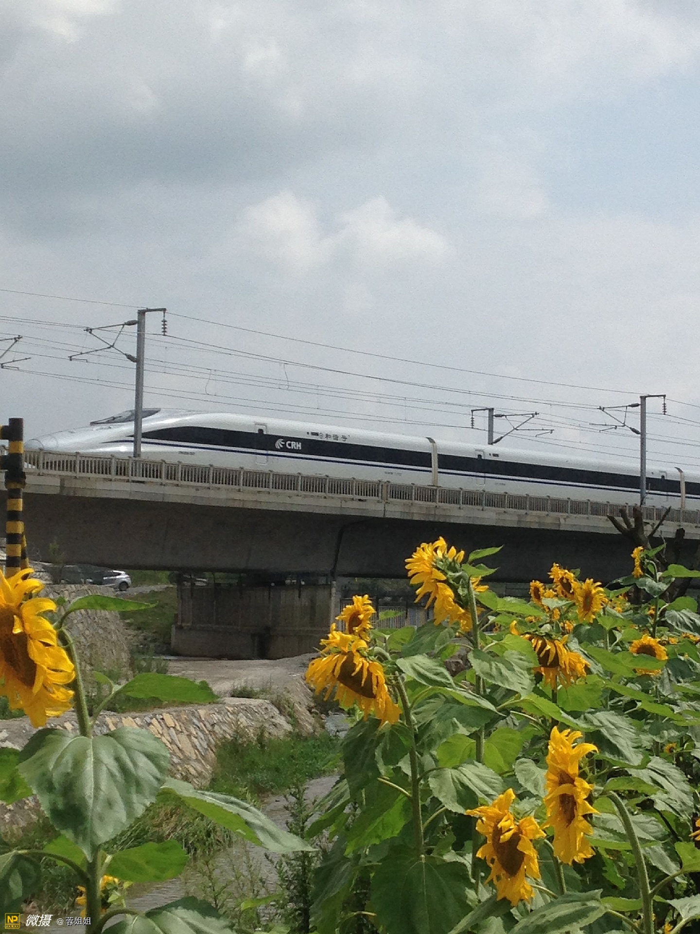 蓝天白云下呼啸而过的高铁列车和向日葵