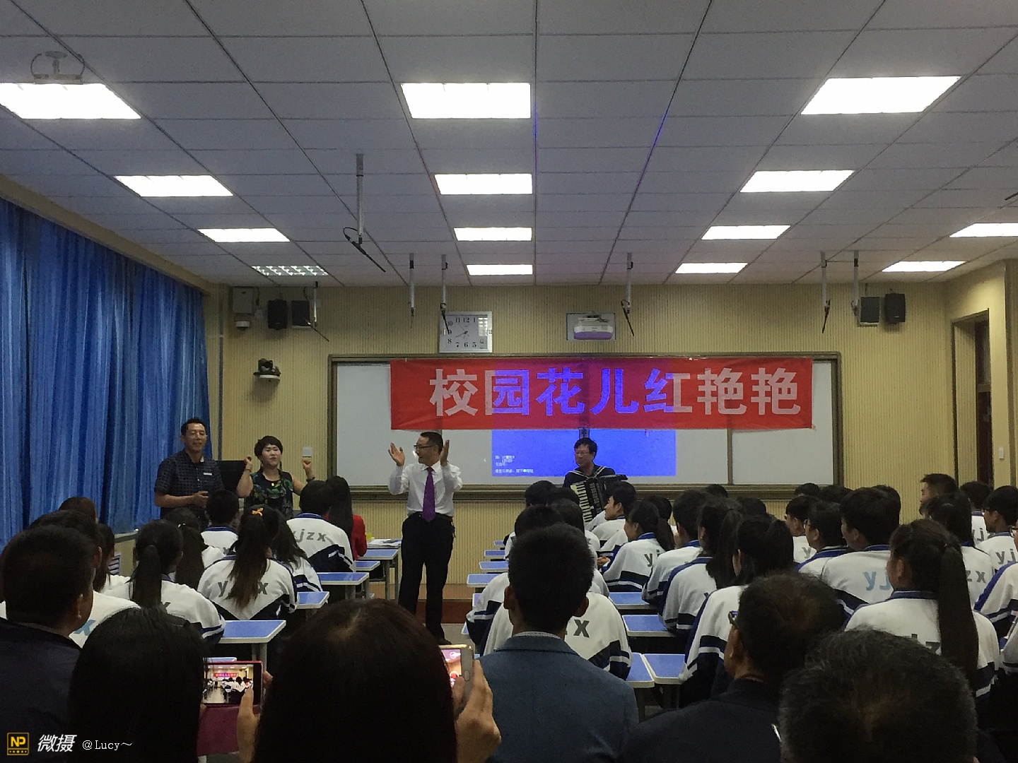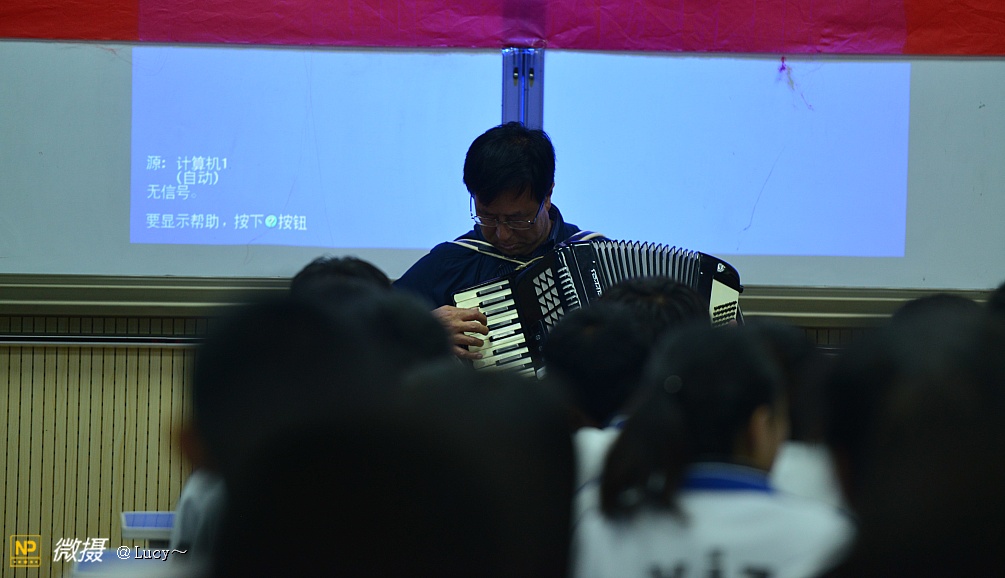 他精通电子琴、手风琴、二胡、葫芦丝、笛子等多种乐器。他给师生表演了手风琴独奏《花儿与少年》。