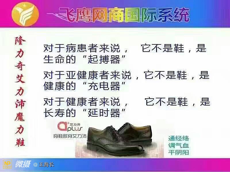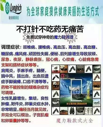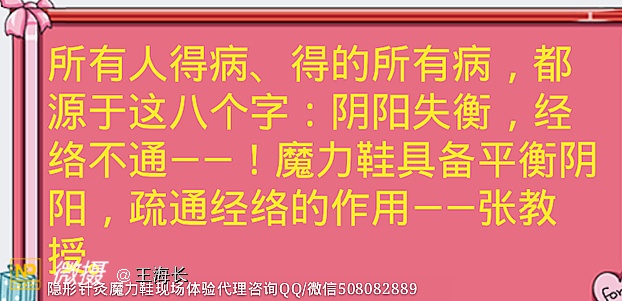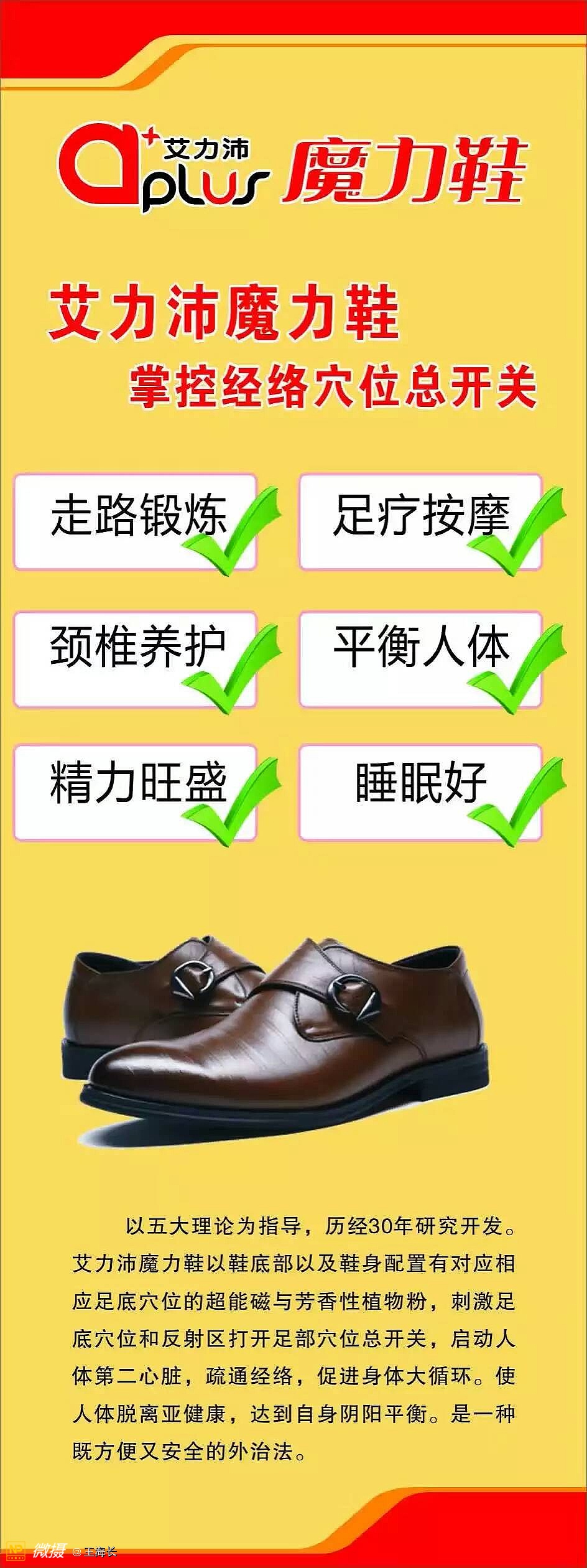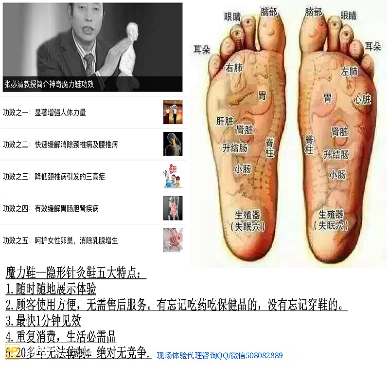 当年脑白金以一款产品打天下至今!而今一双能让瘫痪的人站起来的全球唯一对足底(64穴位)66相应反射区而迅速打通人体经络的针灸魔力鞋经六代中医世家张教授30年研发而横空降世,人人都需要市场空间之大,机会.健康与商机...你懂的...你可以拿市场上任何**产品来现场PK,带上你身边有疾病的人来现场体验30分钟立竿见影!不打针不吃药,无副作用,调理身体所有问题就是打通经络。我说的你可以不信,你来亲自体验!!3月7日苏州等你现场体验。送父母孝心鞋,送亲戚朋友健康鞋。招兼职业务若干名。隐形针灸魔力鞋微讯 :http://zjxwwz.flzhan.com/index.html?rd=0.4667956070625616&from=singlemessage&isappinstalled=0