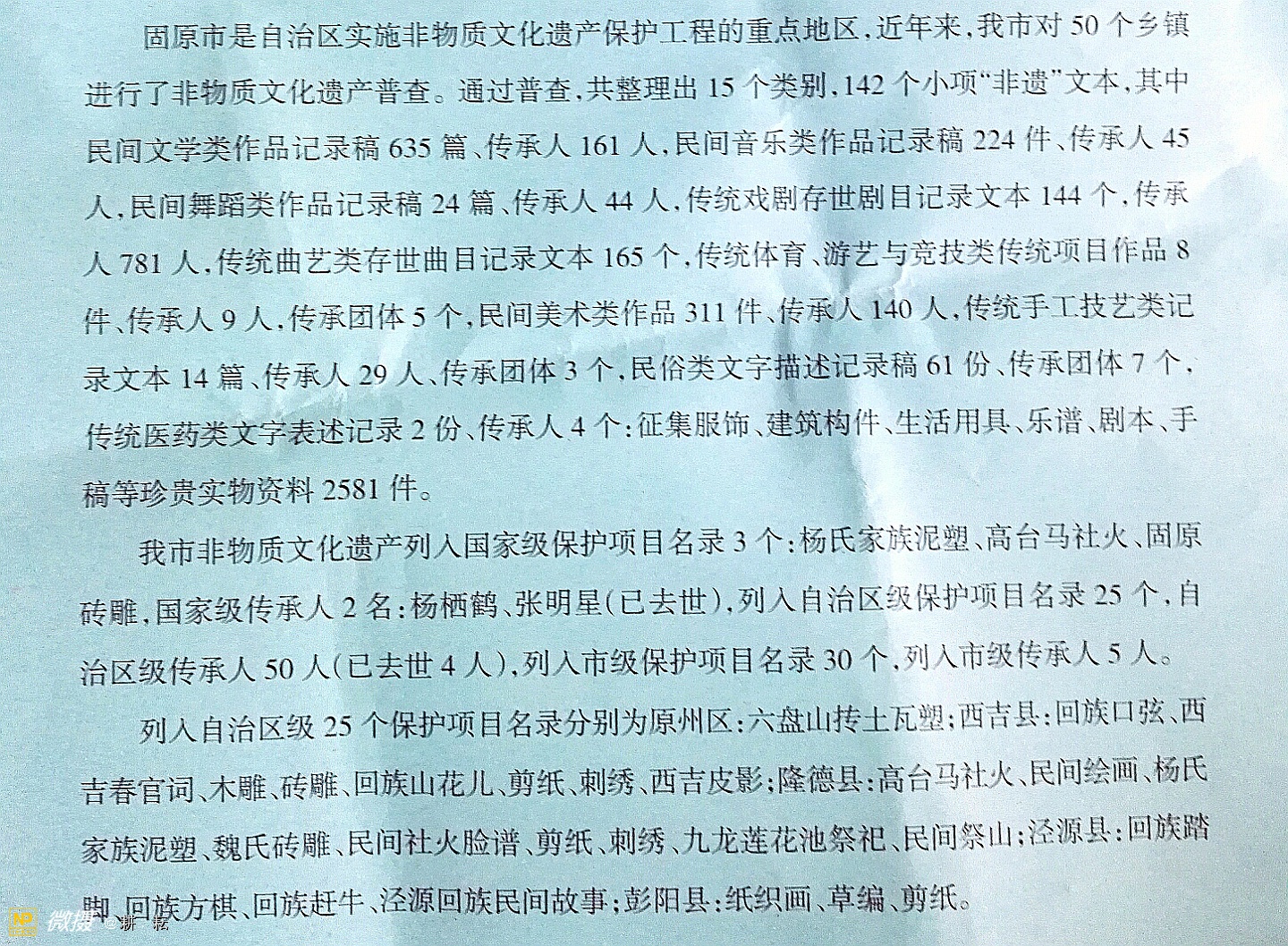 今年6月10日为我国首个“文化和自然遗产日”,活动主题为“文化遗产与 一带一路 ”。为进一步普及文化遗产知识,让文化遗产走进民众,6月6日,由市文广局主办,市群众艺术馆、市文物管理局、市非遗保护中心承办的固原市2017年“文化和自然遗产日”宣传展示活动在固原博物馆广场隆重举行。活动现场,通过展板宣传、悬挂宣传标语、印发宣传资料、文化遗产代表作品展示、民间艺人现场传授技艺、歌舞演出等群众喜闻乐见的形式,向群众宣传非物质文化遗产、文物保护知识及我市非物质文化遗产保护工作成果、非物质文化遗产项目和传承人情况,宣传《中华人民共和国非物质文化遗产法》、《文物法》等。众多群众驻足观看图片、欣赏作品、翻阅资料、观看演出,宣传活动氛围浓厚,效果良好。 近年来,固原市全面贯彻落实“保护为主、抢救第一、合理利用、传承发展”的方针,不断加强文化遗产保护工作,积极申报国家、自治区级非物质文化遗产保护项目和传承人,建立非物质文化遗产档案,稳步推进丝绸之路申遗工作,文化遗产保护工作不断取得新成绩,为全市乃至全区文化旅游发展做出了积极贡献。此次宣传活动的成功举办,让更多的人了解了文化遗产、增强了保护文化遗产的意识,使文化和自然遗产日主题和文化遗产保护理念深入人心,营造了广全民自觉参与文化遗产保护实践的良好氛围。