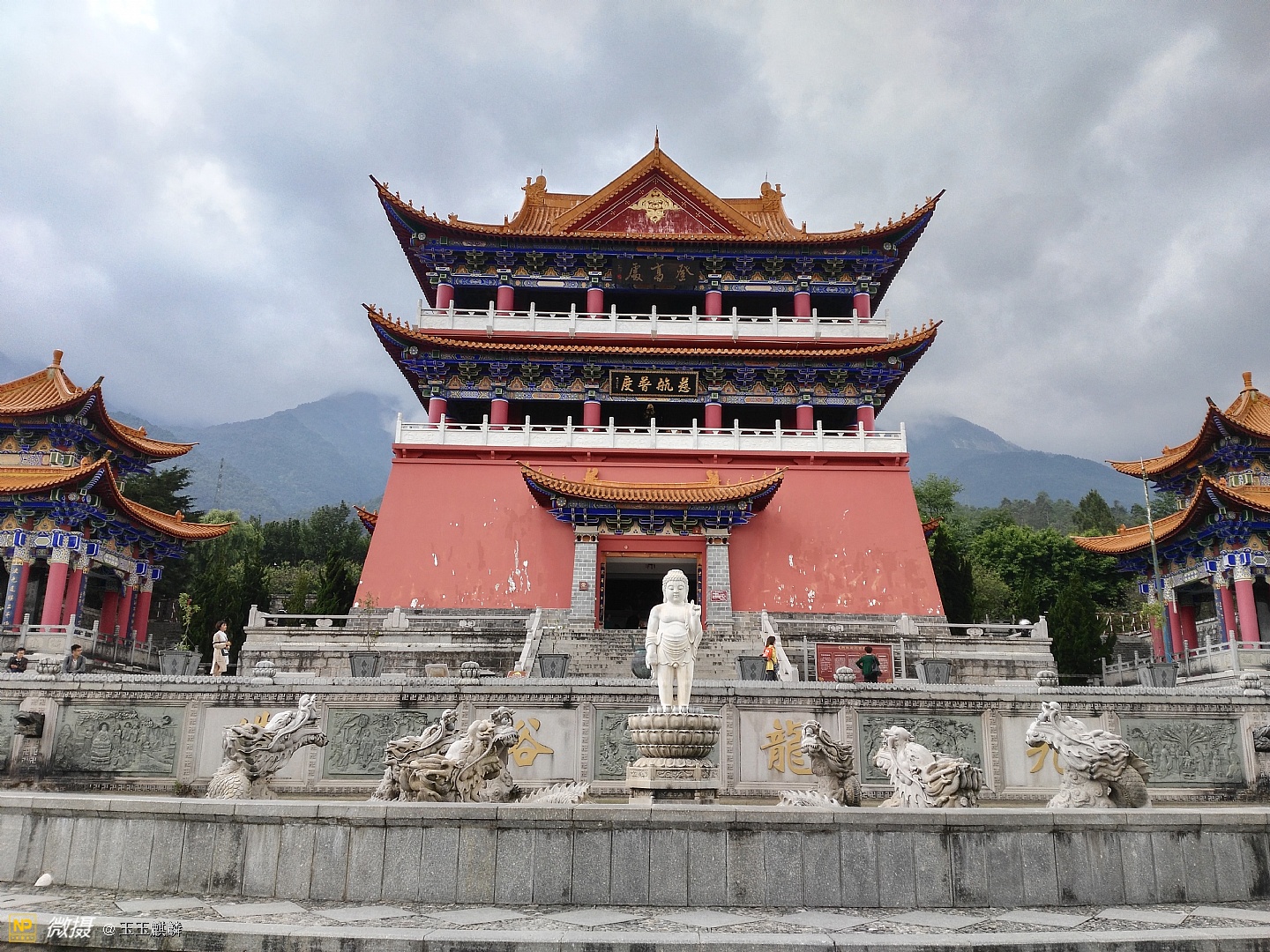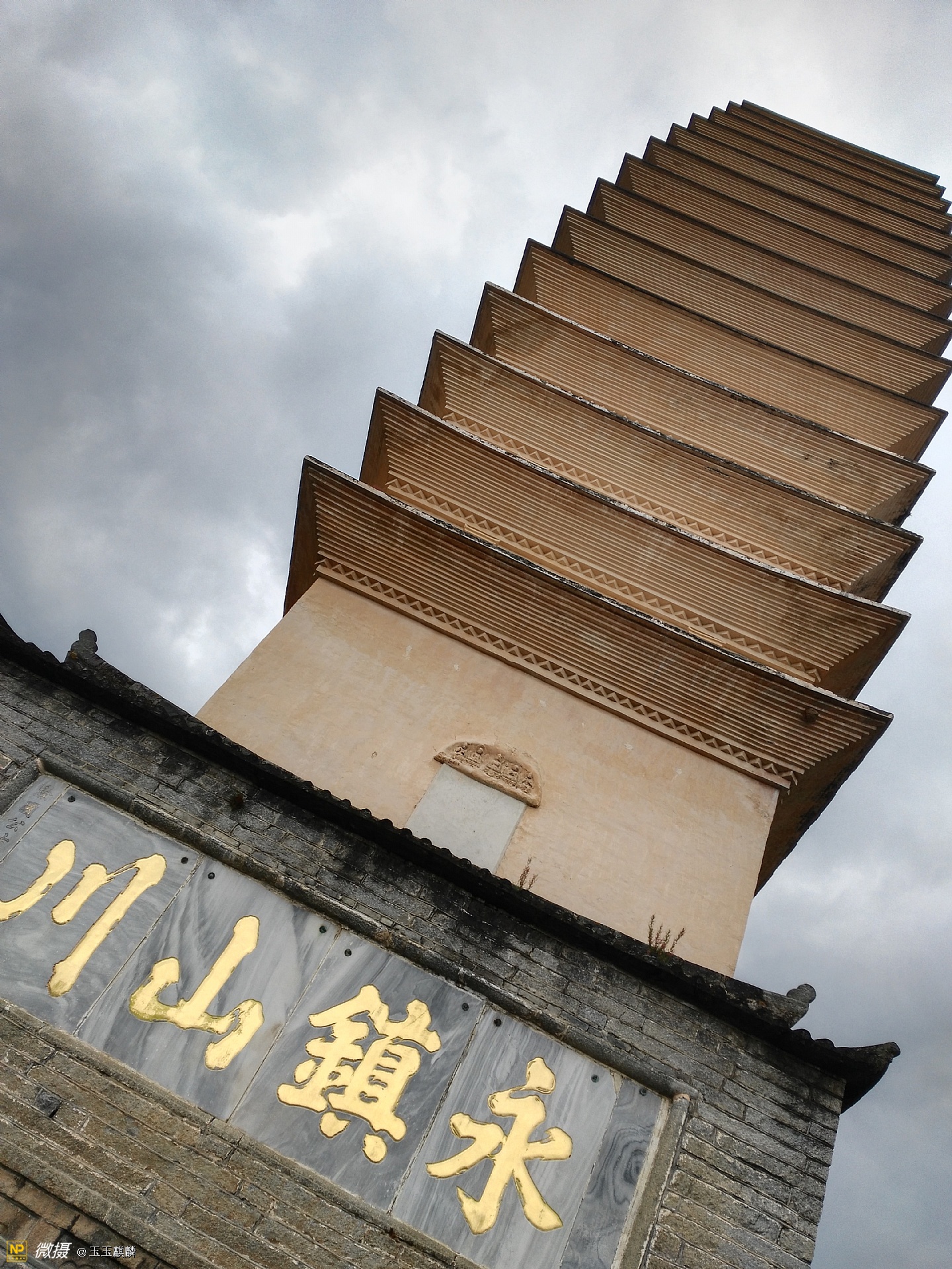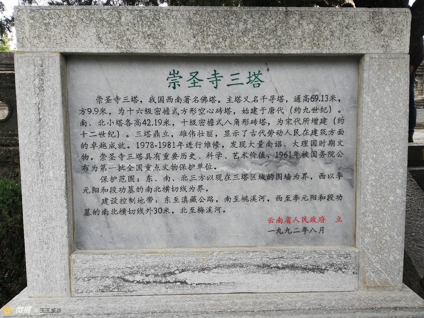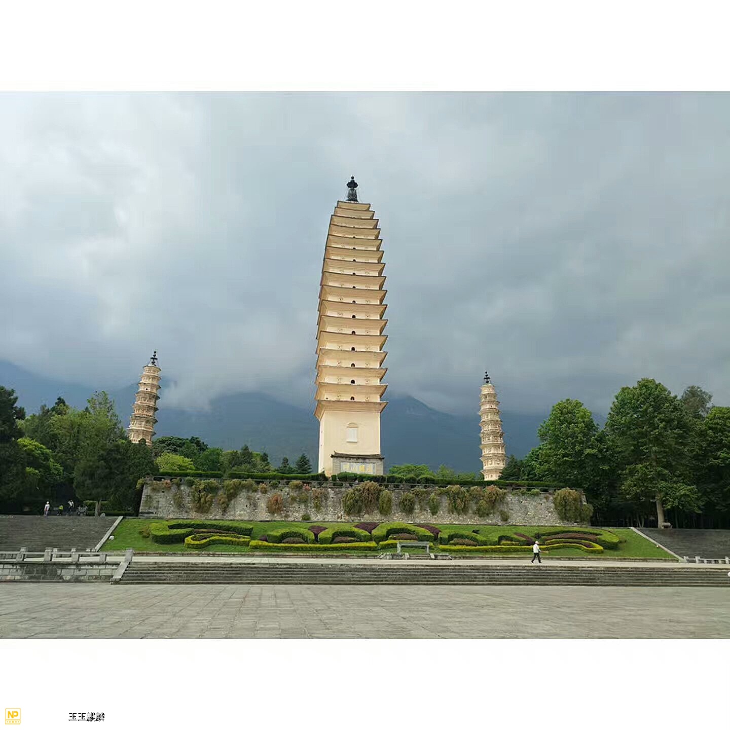 大理崇圣寺三塔位于大理以北1.5千米苍山应乐峰下,背靠苍山,面临洱海,三塔由一大二小三座佛塔组成,大塔叫千寻塔。千寻塔与南北两个小塔的距离都是70米,呈三足鼎立。远远望去,雄浑壮丽,是苍洱胜景之一。