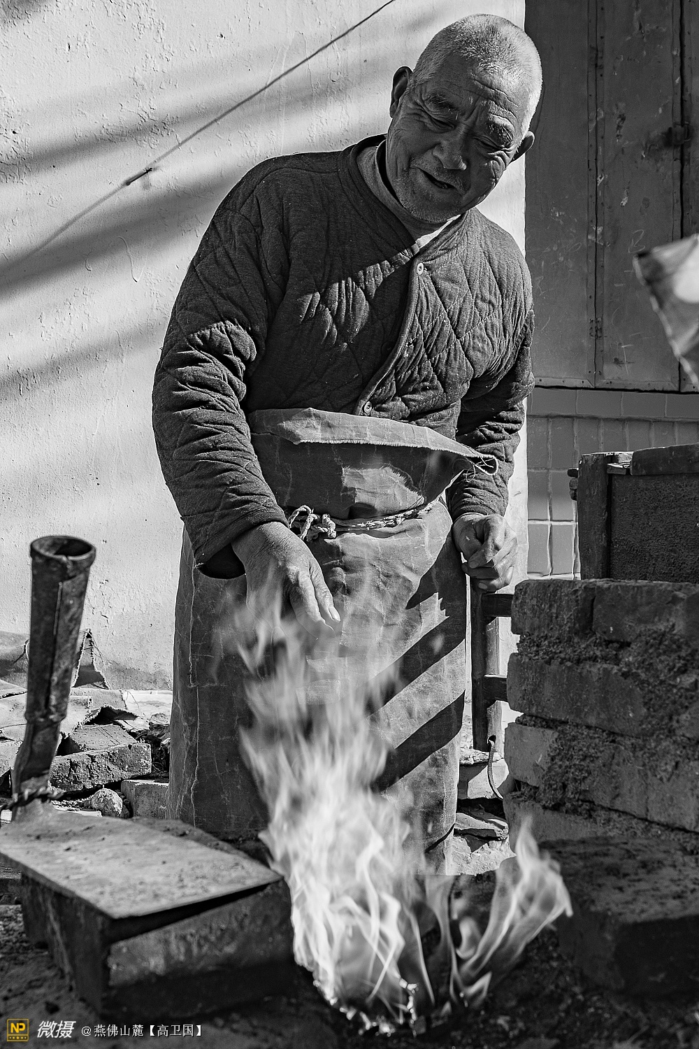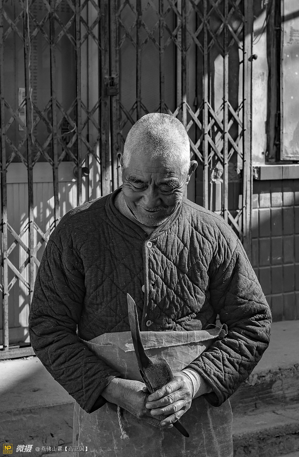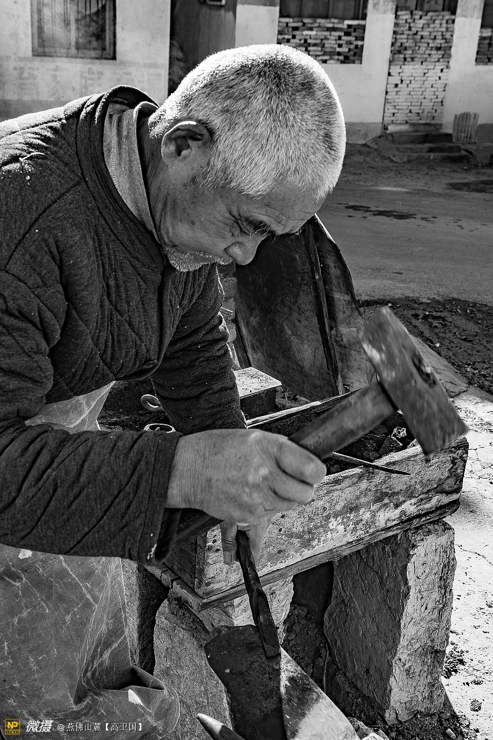 铁匠李炳贤,1937年出生,今年82岁了,山东省济南市历城区彩石镇北宅科村人,从1954年十几岁就开始学徒打铁,打铁已经六十多年了,跟老人聊起来,家里几个孩子的工作生活都很好,孙子也考上博士了,很优秀,说起来一脸的幸福。老人的身体很硬朗,现在的生活就是约三五老友聊聊天,喝喝茶,养养花,参加了村里的老人门球队,有活的话还可以打打铁,做点农具,对生活很是幸福满足,一直说这幸福生活要感谢共产党,感谢毛主席。