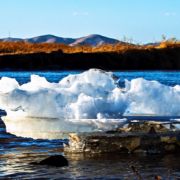 一缕晨曦的阳光照耀在乌兰浩特市洮儿河湿地公园的不冻河。