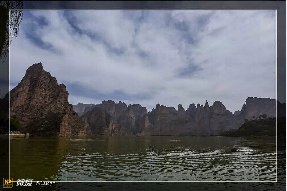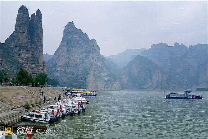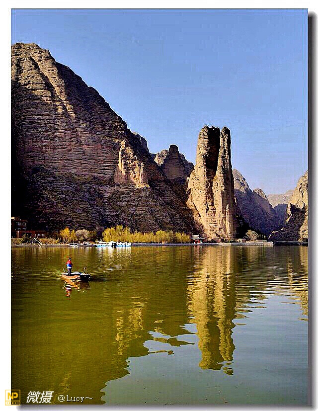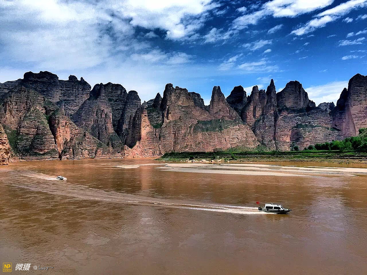 从炳灵寺码头看矗立于黄河边的万笏朝天、群峰竞秀,蓝天白云下是一幅绝美的山水画。
