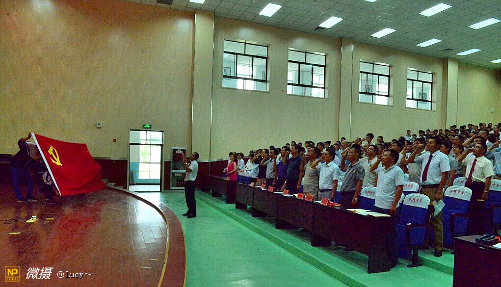 大会第三项:全体党员在党旗下重温入党誓词,洪亮的宣誓声响彻大厅!