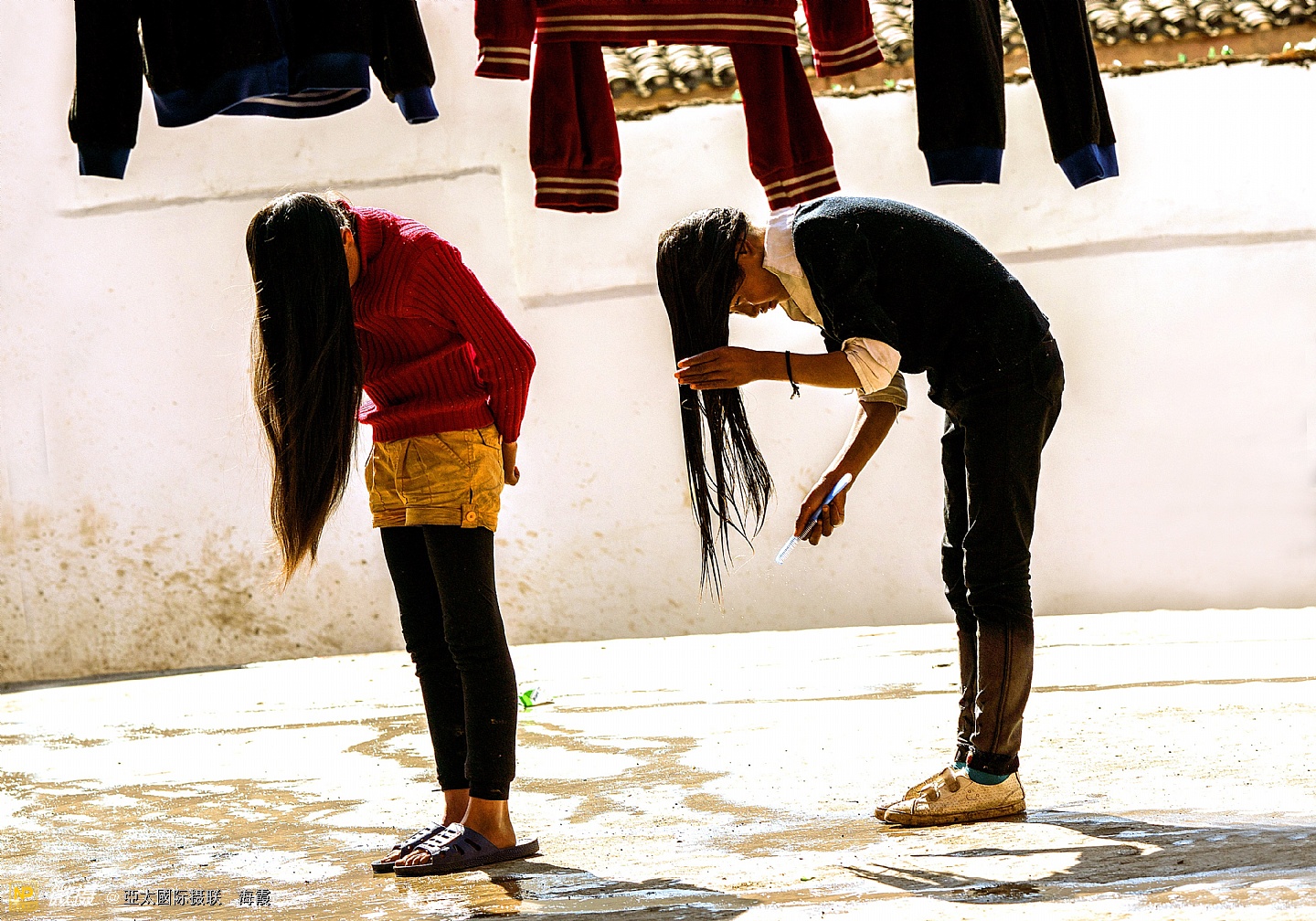 正在校园里洗头的中学生