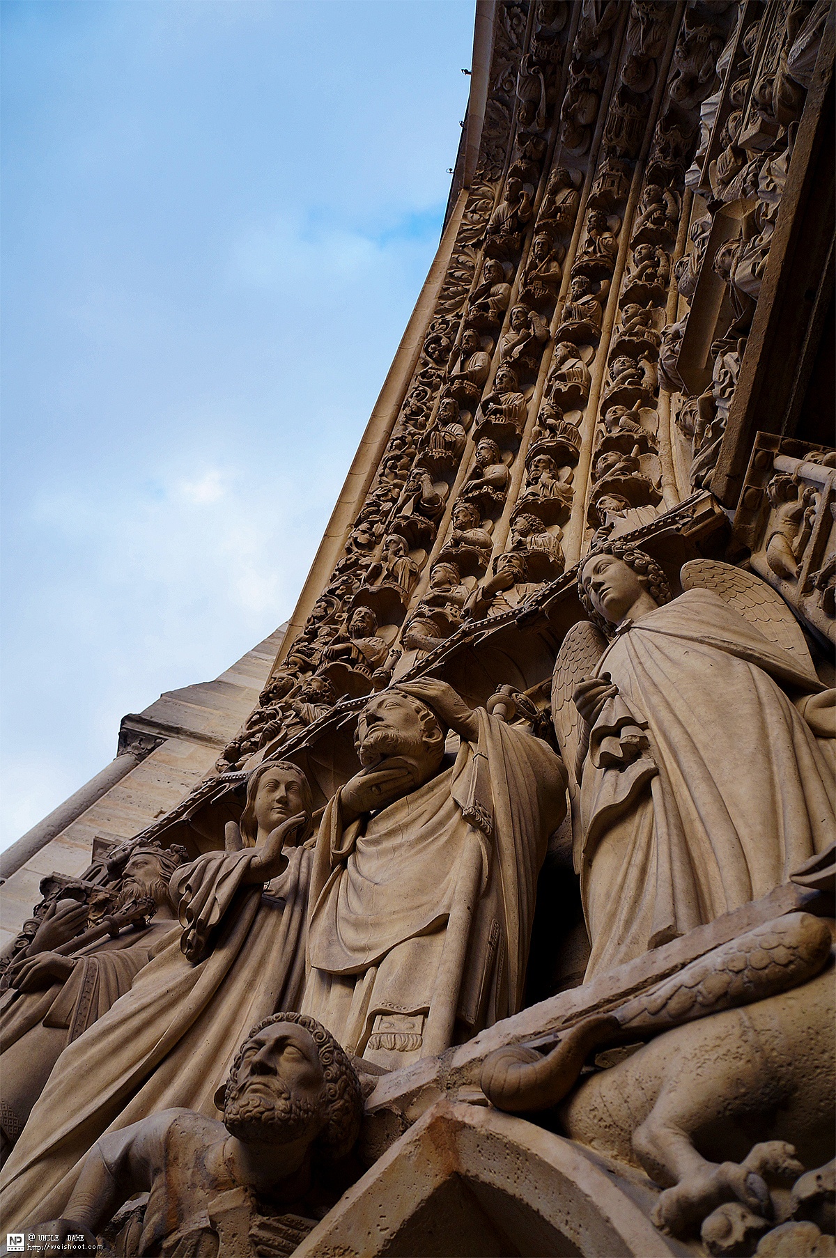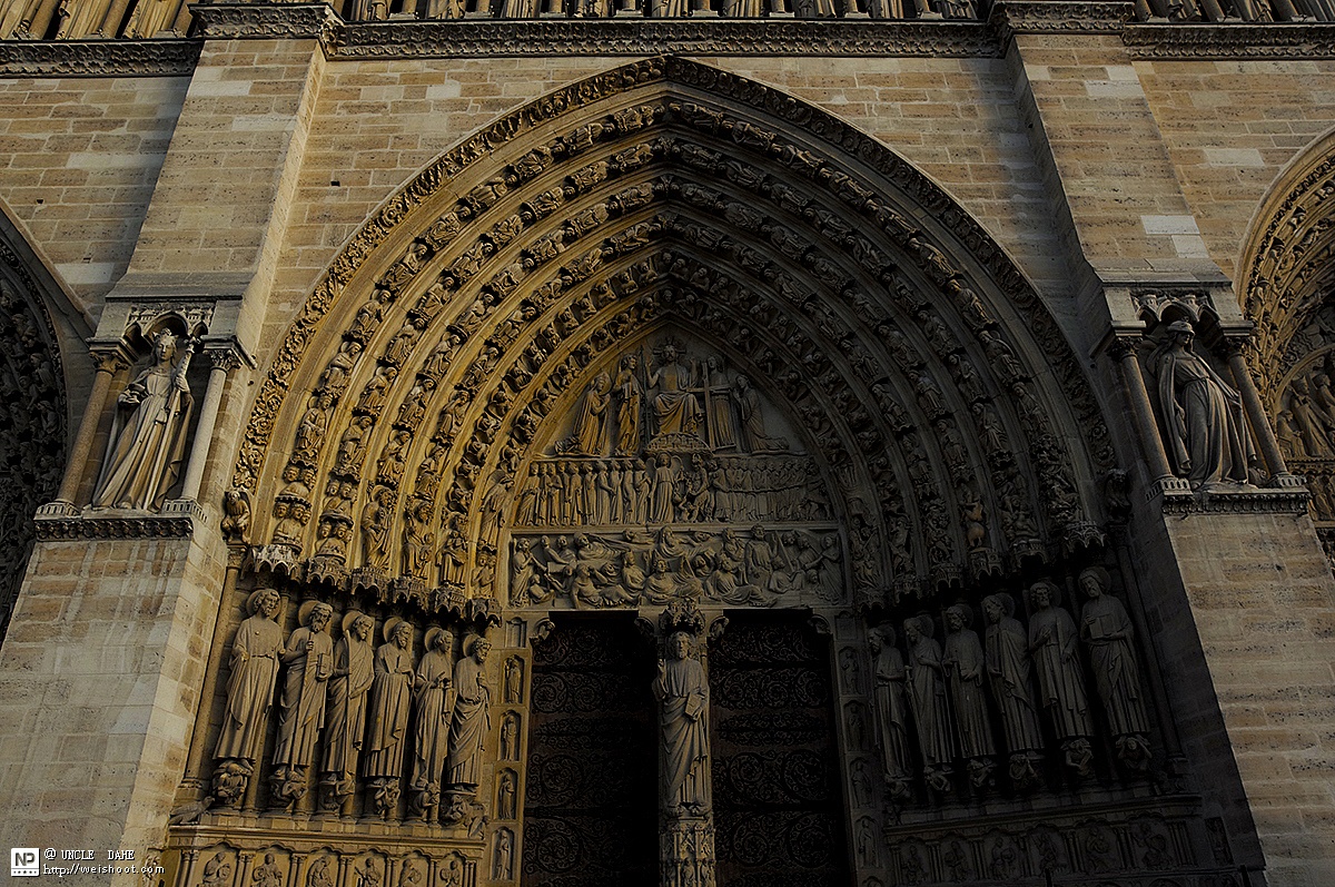 巴黎圣母院的底层并列着三个桃核形门洞,左门为 “圣母之门”,右门称“圣安娜之门”,中门则是著名的“最后审判之门”,表现的是耶稣在“世界末日”宣判每个人命运的场景。当时教堂里的牧师们只用一般民众难懂的拉丁文宣讲,这些雕塑可用来帮助不识字的人们了解《圣经》中的故事,所以被称为“穷人的圣经”。