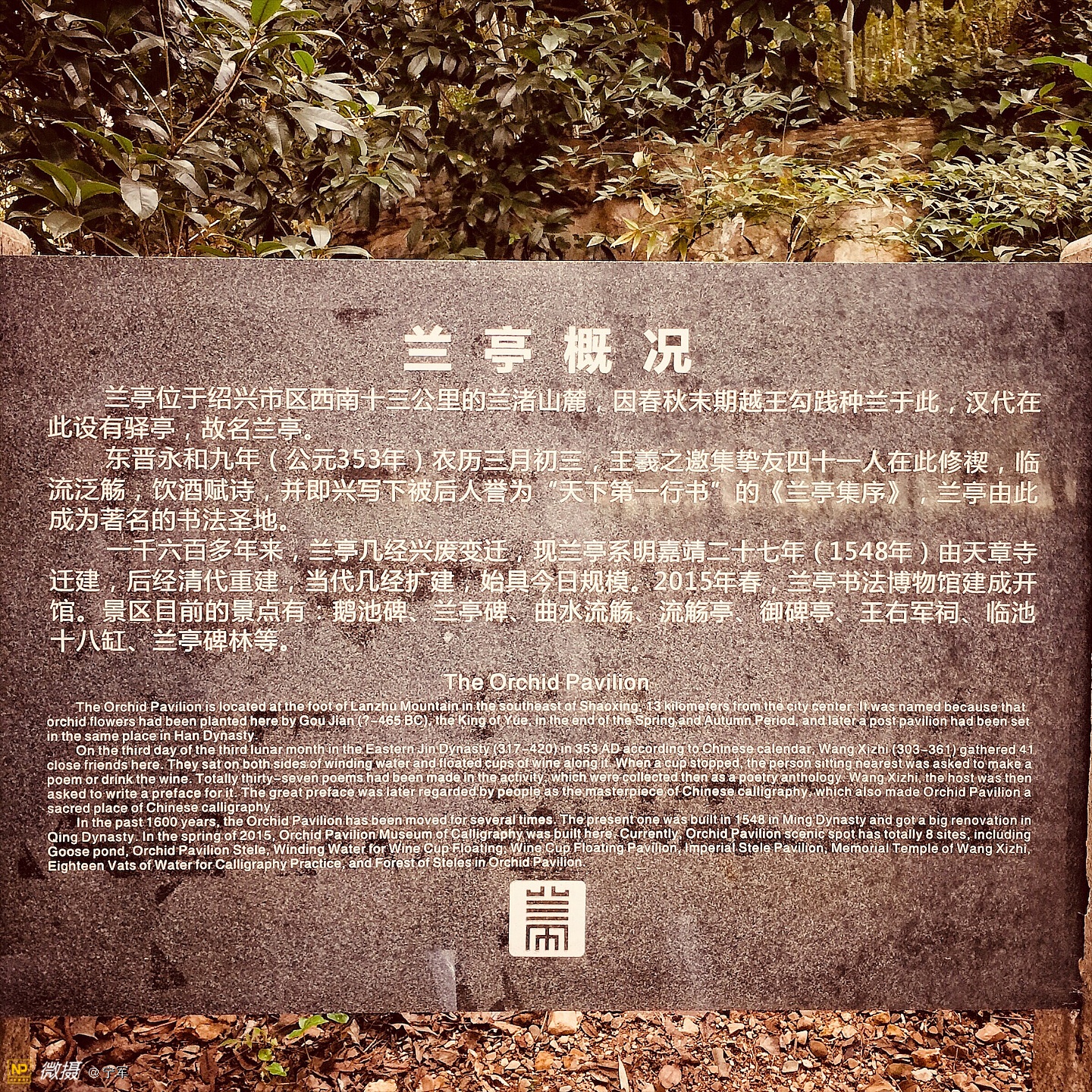 兰亭四周浅溪淙淙,幽静雅致。园内“鹅池”、“曲水流觞”、“兰亭碑”、“御碑亭”、“右军祠”等建筑精巧古朴,是不可多得的园林杰作。
