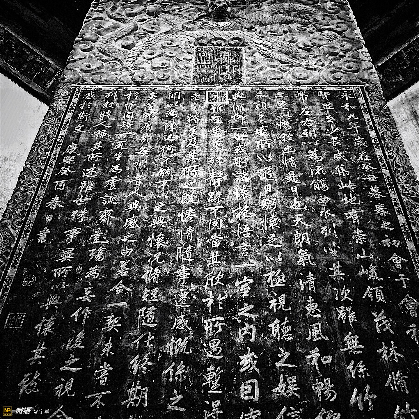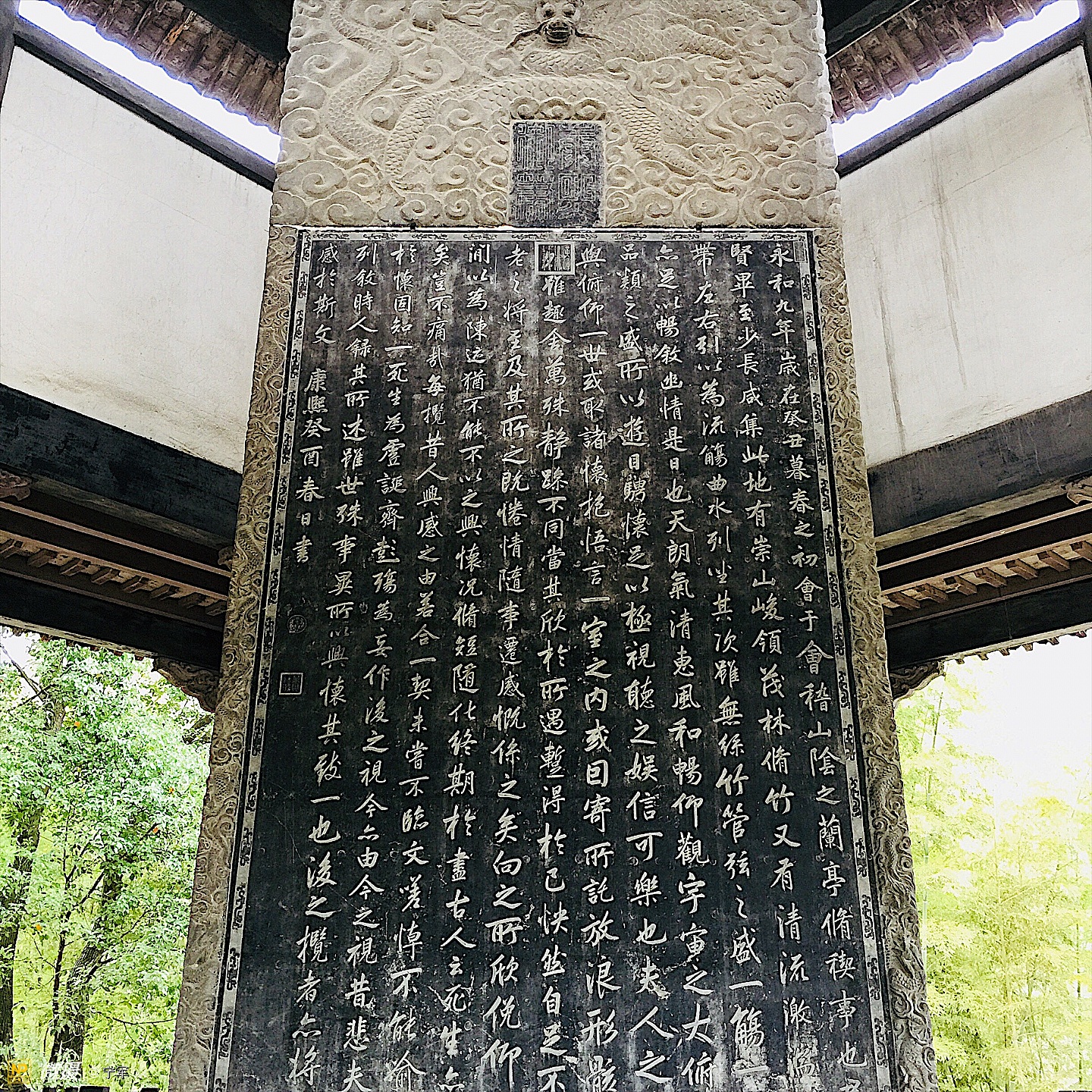 兰亭碑亭是兰亭的标志性建筑,建于清康熙年间。碑上的“兰亭”两字,为康熙皇帝御笔所书。文革时期此碑被红卫兵砸成四块,后于80年修复,但已留下了“兰”字缺尾,“亭”字缺头的遗憾。许多民众都喜欢用手去摸这块残碑,碑已被摸的非常光滑,所以又称“君民碑”。