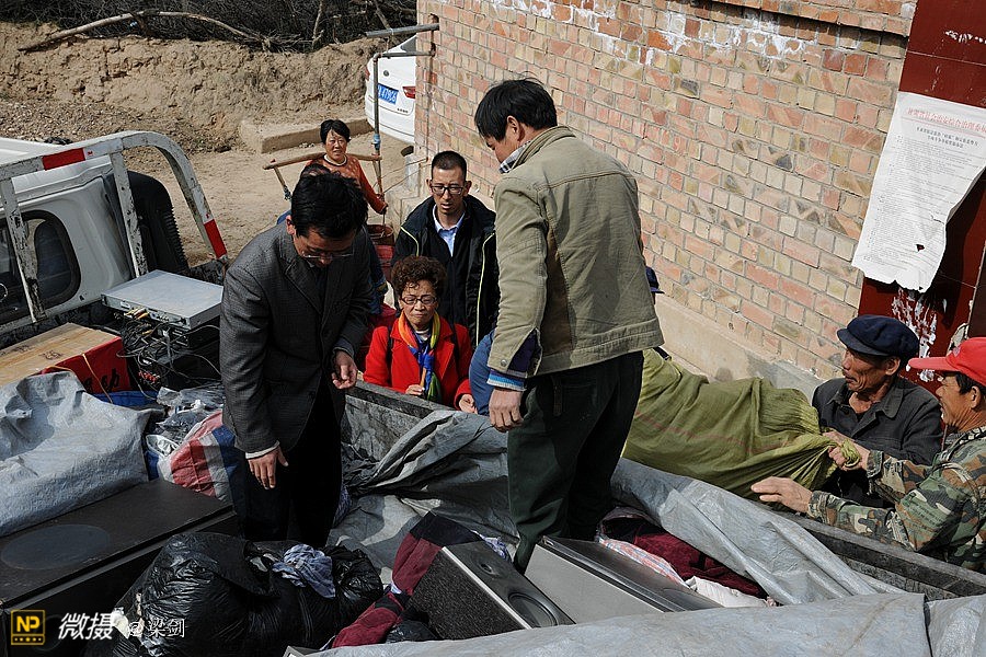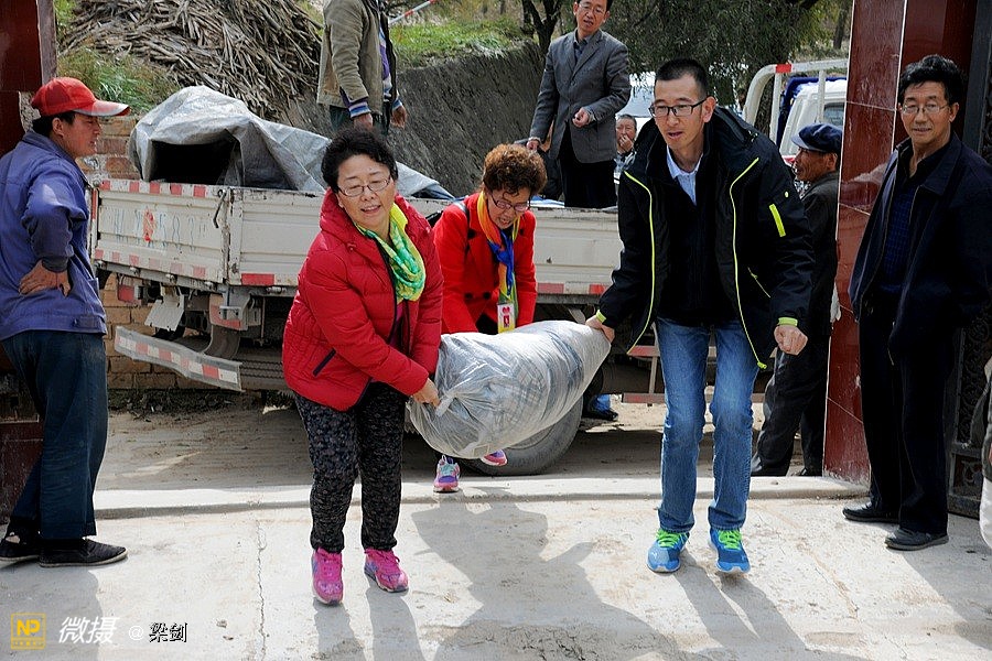 与村民委员会后沟通志愿者和村民开始卸车,整理分类分发捐赠物资